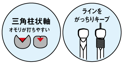 エサの種類に合わせてガン玉の位置を自在に選び、しっかり固定できる「三角軸」です。釣技、釣法を問わず使えます。