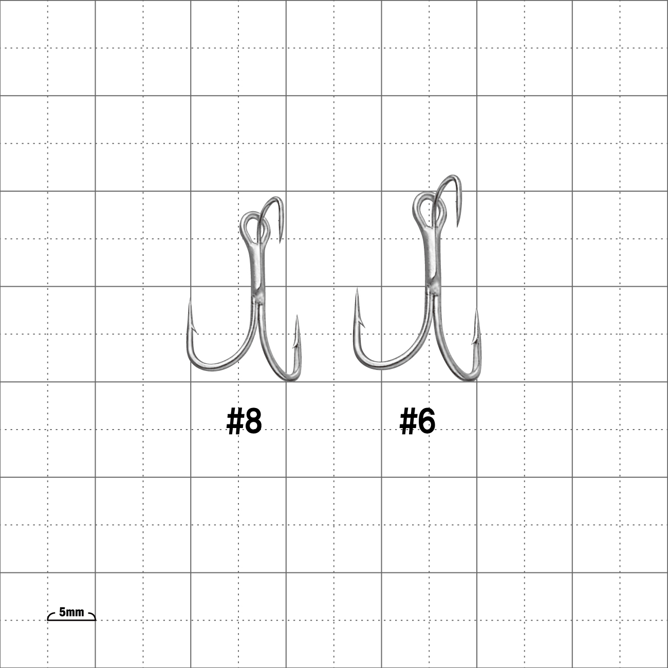 掛け鈎のうち1本は細軸で餌の小魚を弱らせにくく、また、従来トレブルと違い逆向きで活き餌から抜け落ちにくい設計。背掛け用と腹掛け用のどちらにでも対応します。