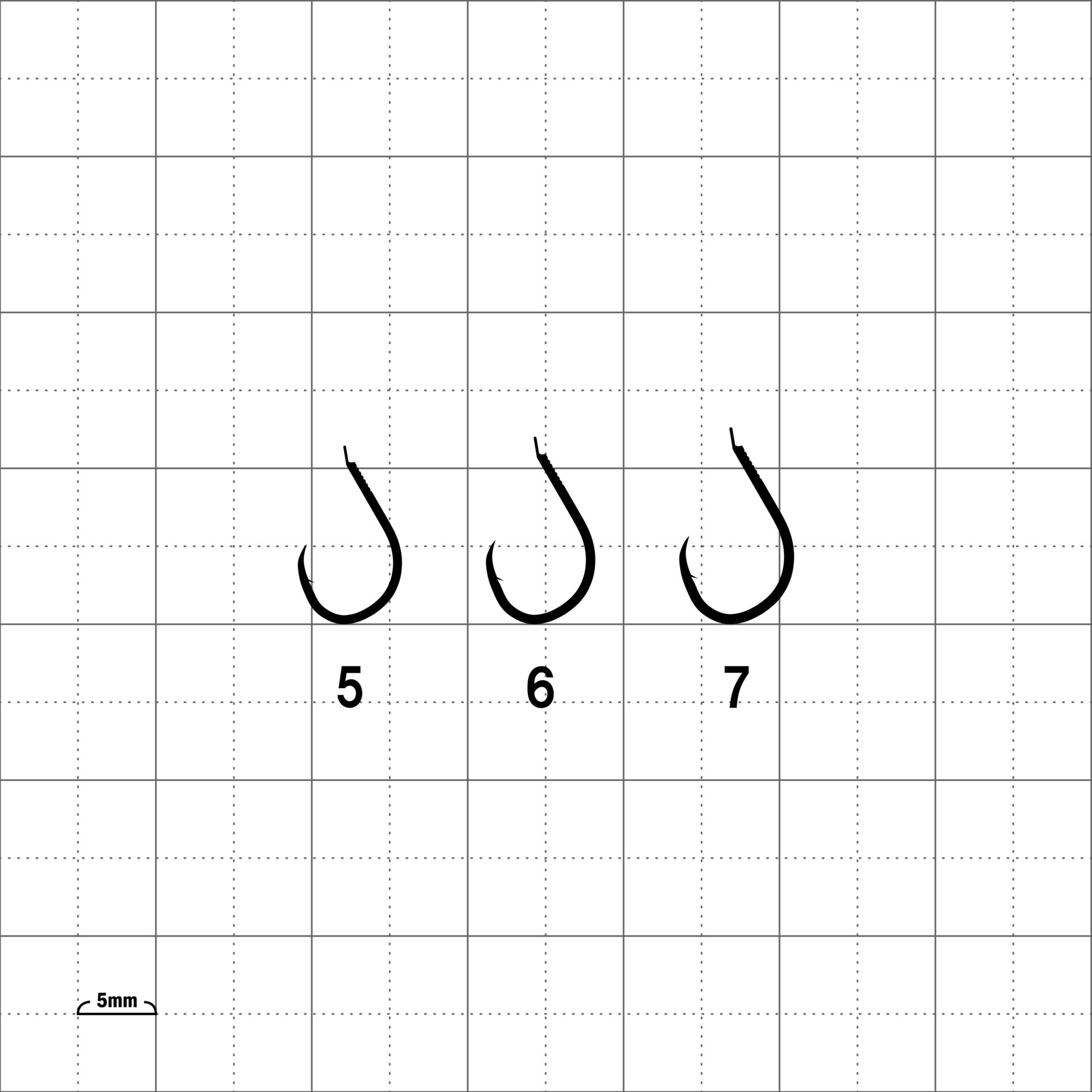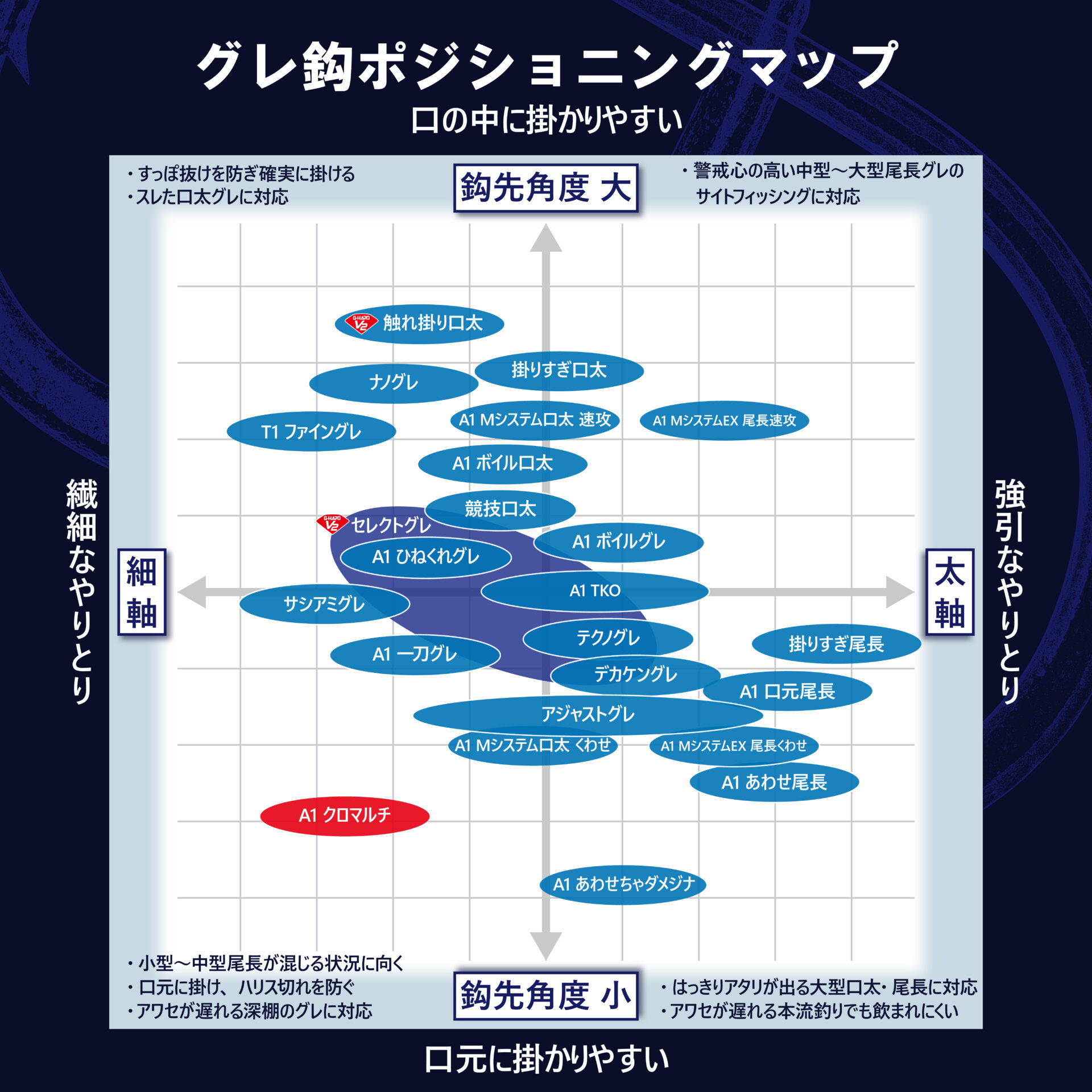 近場のスレたグレにも違和感を与えず食い込ませること、そして鈎が滑って口先に掛かることをコンセプトに設計。「口太グレ」の軸を少し長くした形状で、さらに鈎先を微妙に内側へ入れた「半スレ」タイプ。素材は強靱さで定評のある「A1」。グレを掛ける時に最低限必要な強度を実釣によりあみだし、贅肉を削ぎ落として細軸に仕上げました。