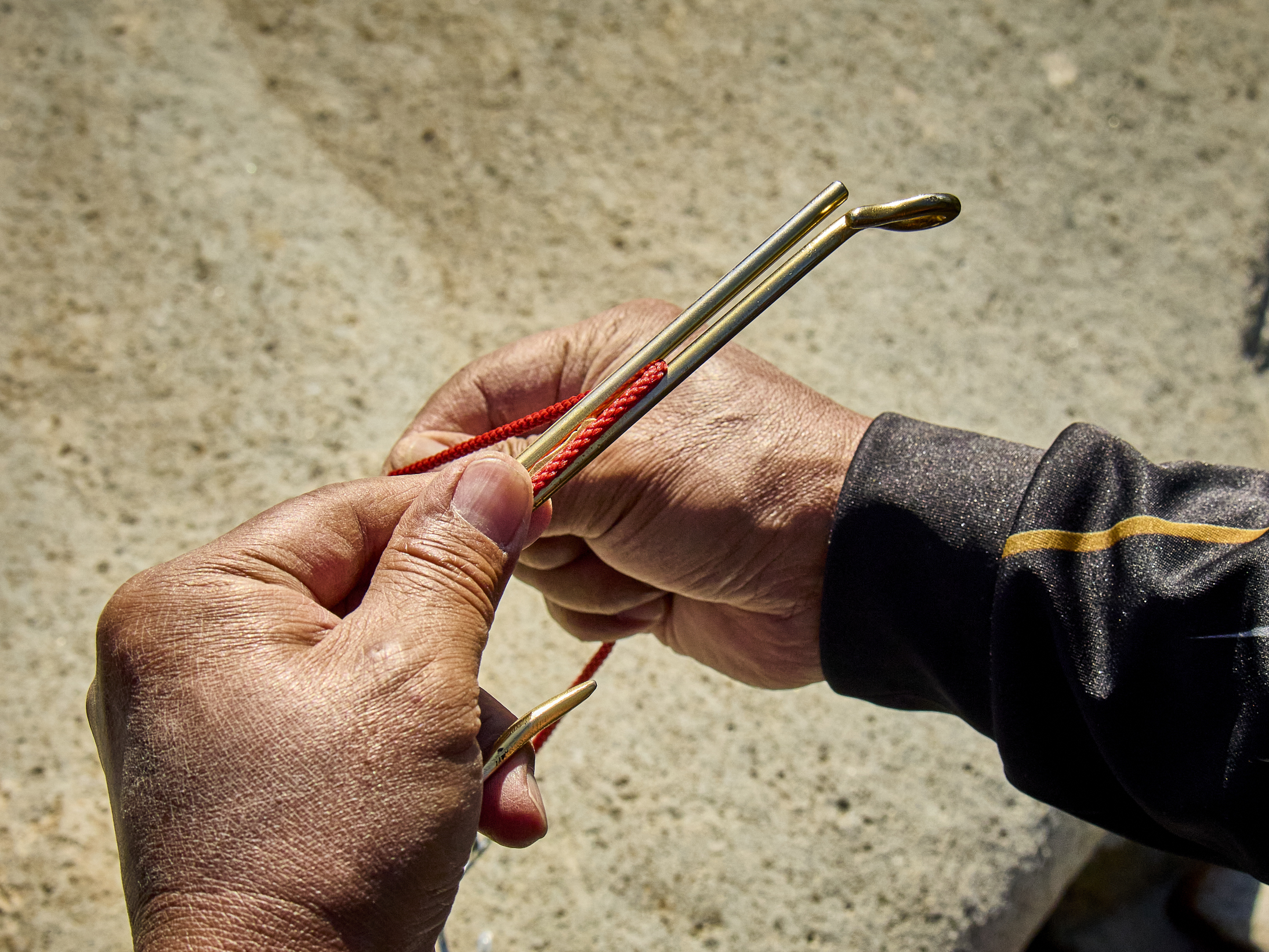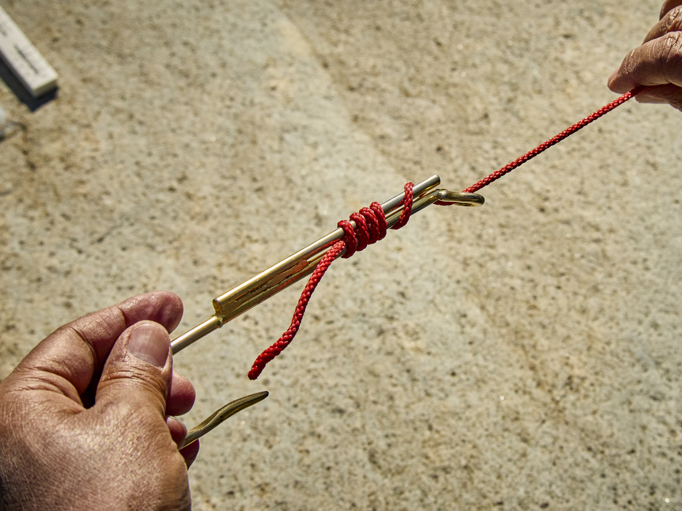 3.管のスリットにハリスを通す。巻き付ける方向が逆だと管の下からハリスが出て締まらず抜けてしまうので注意。