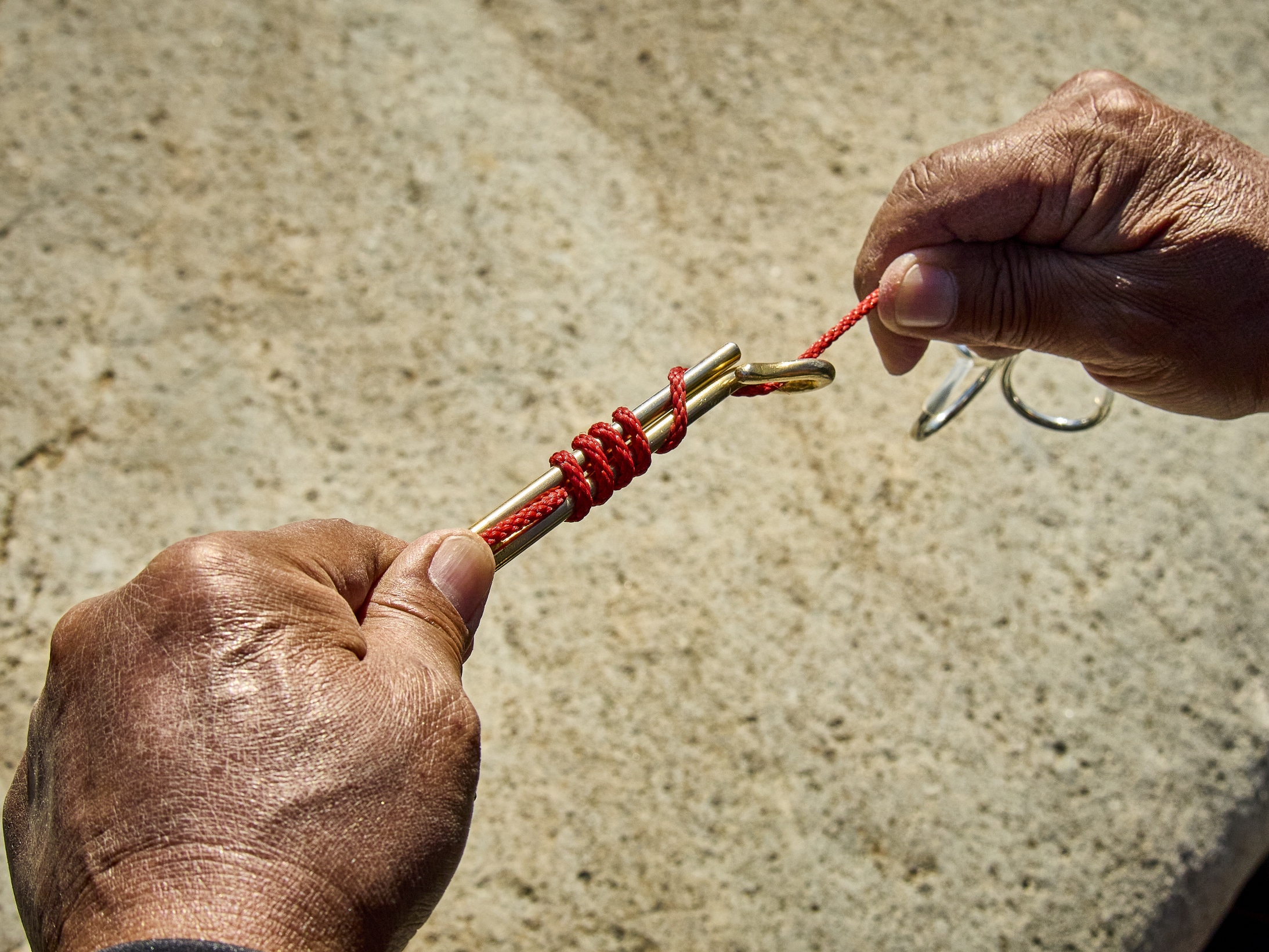 2.掛け鈎側のハリスをぐるピットの軸に、管のほうへ向かって下から上へ5回ほど巻き付けていく。