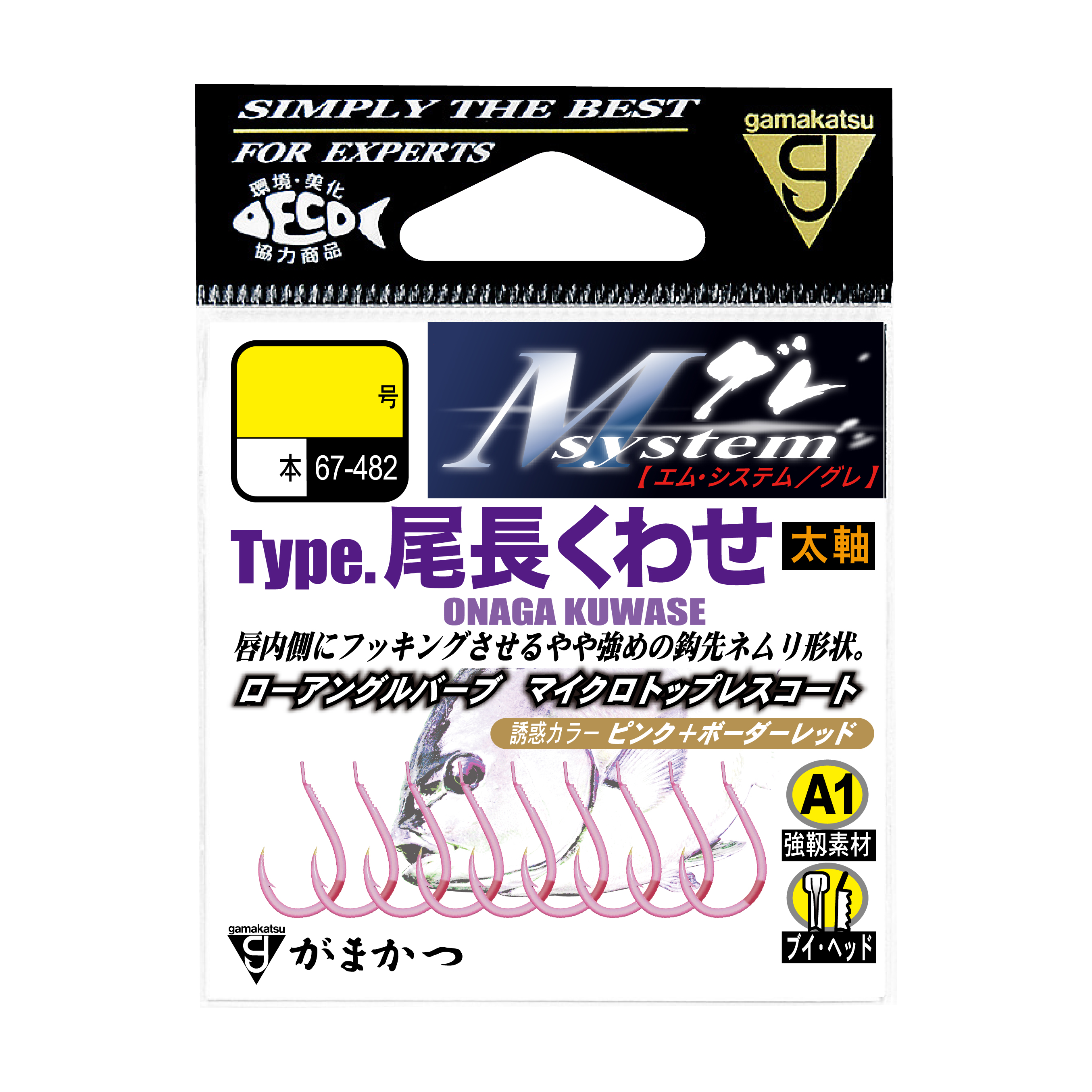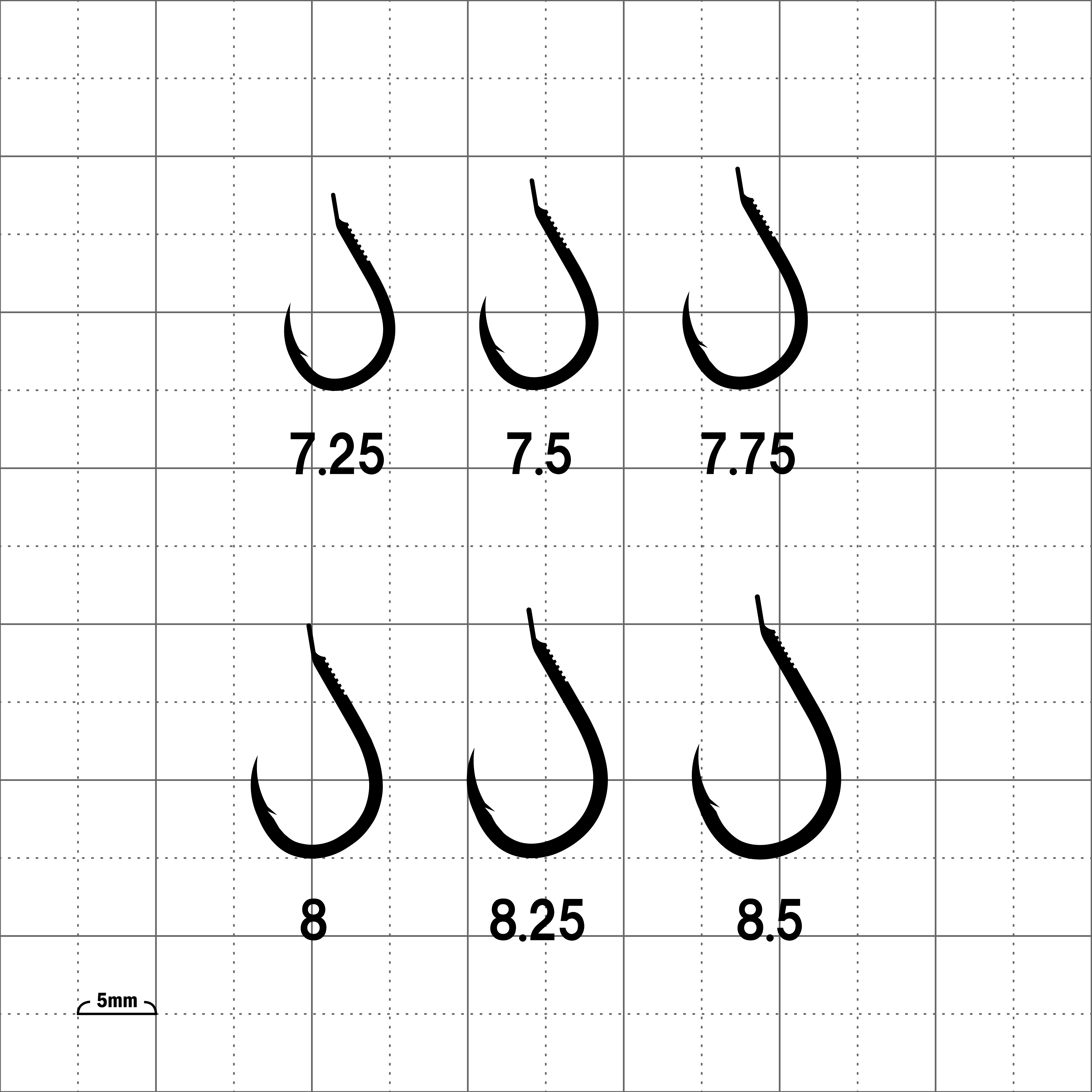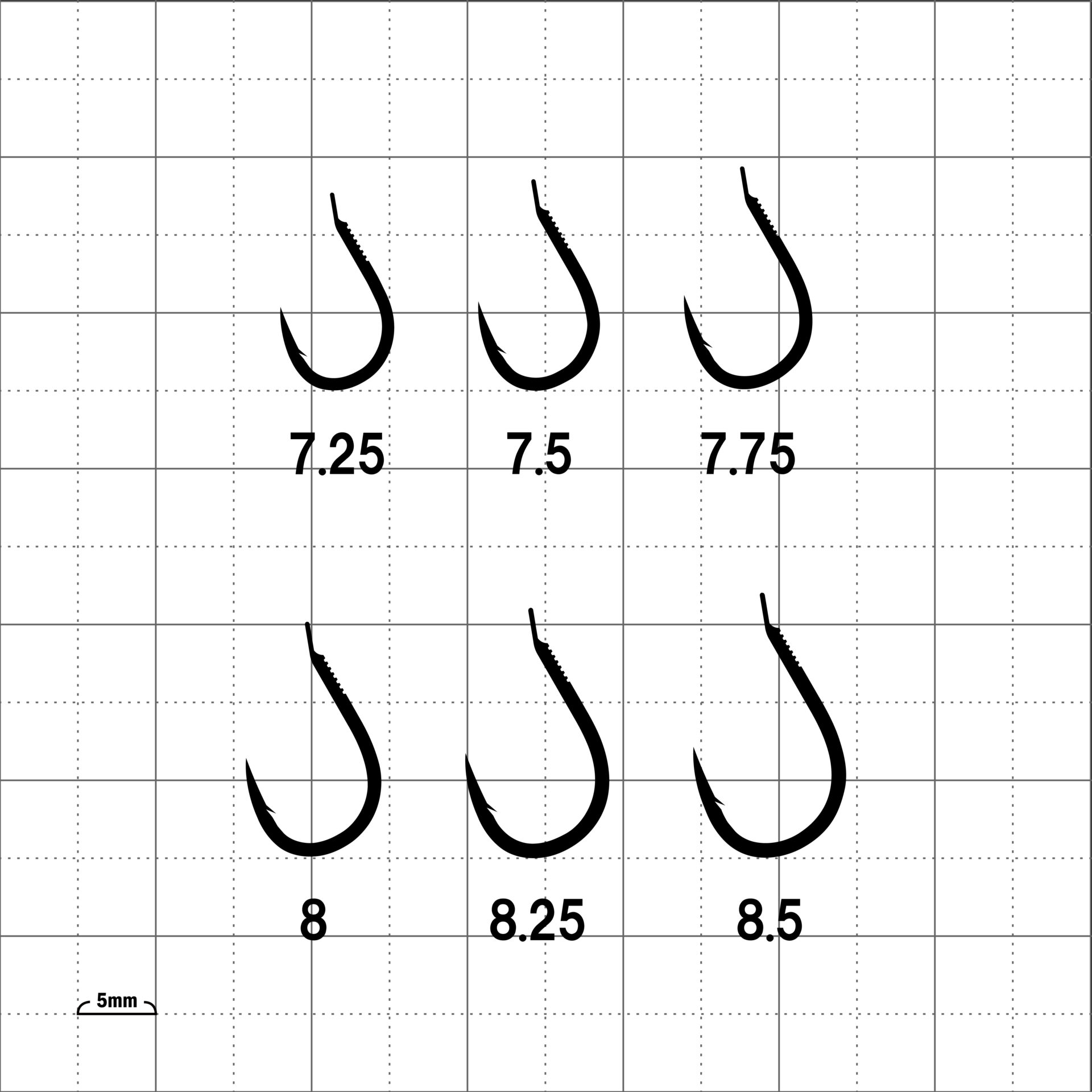 1.75~2.5号クラスの竿で尾長グレを狙うのに最適な強度とサイズ設定の「尾長専用鈎」。ごくわずかな「ネムリ」を持たせた攻撃的な鈎先角度は、大型尾長の一瞬のコンタクトをもモノにし、唇に大きな進入角度で鈎先を立たせ、歯切れを防ぎます。