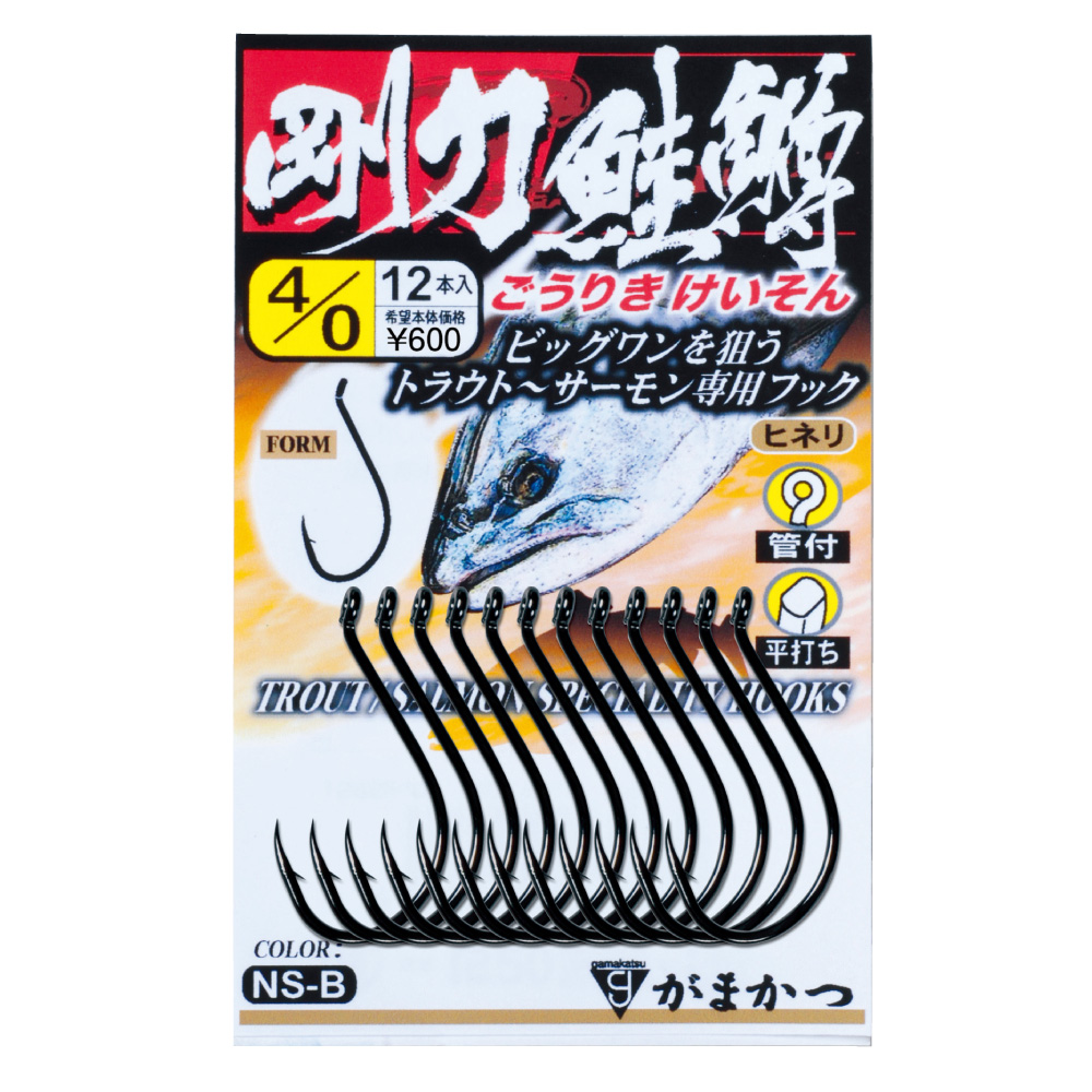 トラウト~サーモンハンターに捧げるまさに剛力なスペシャルフック。渓流トラウトからソルトモンスターサーモンまでカバーする豊富なサイズバリエーション。特徴であるアップアイはチューブ系ベイトセッティング時のセンターバランスが良好なので、サーモンリグ用としてもお奨めです。