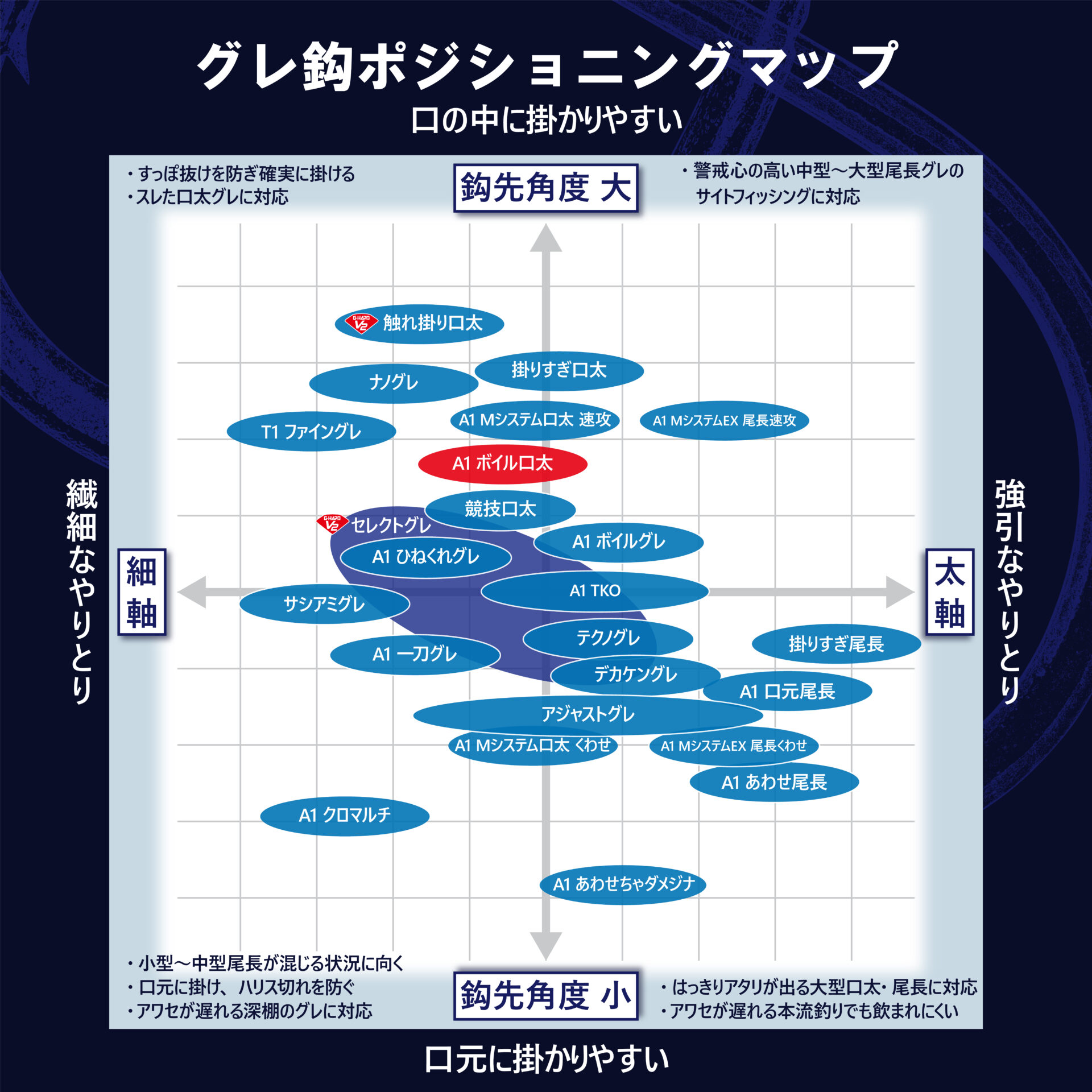 すべりがよく餌と一体化するボイルカラー、スッと刺さりこむ「スパットテーパー」鈎先、身を潰さない細軸仕様など、オキアミボイルの型を崩さない工夫が満載!スレた中・大型口太グレも警戒なく、くわえ込む軽量設計。広めに設定されたフトコロ幅と鈎先角度が魚へのコンタクト性を高め、ストレート気味の鈎先がそのコンタクトを一瞬で捕らえる「速攻あわせ」に対応。高強度・高靭性かつ耐摩耗性に優れた「A1」素材採用。
