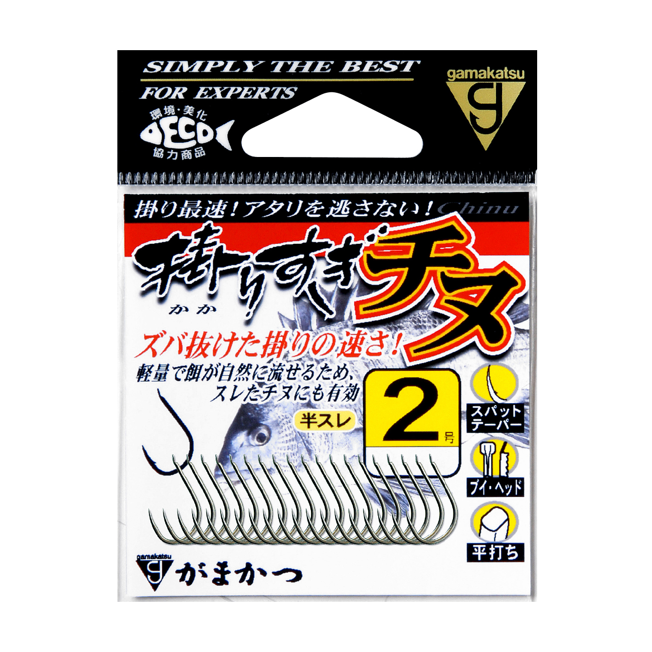 鈎先に「スパットテーパー」を施し、耳部には「ブイヘッド」を採用。魚へのコンタクトも素晴らしく、糸ズレを完全にシャットアウトできます。鈎掛かりの良さを重視した超先鋭鈎先+広めのフトコロ幅と大きめの鈎先角度設計によりチヌへのコンタクト性は極めて高くなります。様々な釣法で攻められ、喰い渋りが非常に多くなっている昨今のチヌ釣りでは、如何に自然体で刺し餌を同調させるかがポイント。そして、違和感なく喰わせ、確実な鈎掛かりを高確率で約束してくれなければなりません。チヌ釣りにはまっている釣師にとっては最高レベルの逸品となるでしょう。