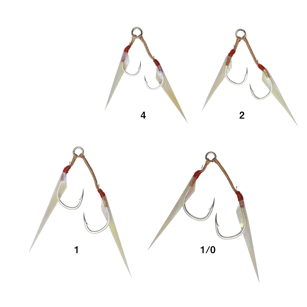 魚はいるけどジグでは喰わせきれない。そんな時はシラスにシルエットを合わせた魚皮アシストの出番。タフコンディション時の喰わせの切り札としてアミコマセに付いた激戦区の小型回遊魚にも効果絶大。豊富なラインナップでサバ、シオ、ソーダカツオ、ハマチまでライトショアジギングシーン完全対応のアシストフックです。