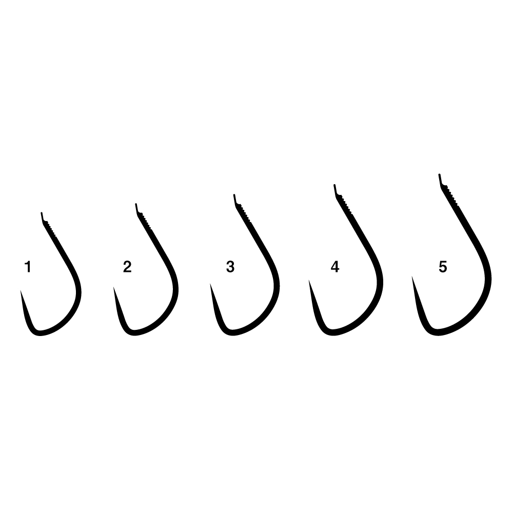 素材には、靭性と形状保持性能に優れたハイカーボン「T1」を採用。細軸でありながら高強度で、1kgクラスの大型にも対応可能です。また、非常に軽量なため、冬場等の低活性時にもへらの吸い込みが抜群です。鈎の形状は、ウドン・角麩・トロロ・グルテン等のエサを使用しやすい関東スレをベースに設計。内向きの鈎先設定で、固形エサのすっぽ抜けを防止するだけでなく、抜群の貫通能力でフトコロまでしっかりと刺さり、身切れによるバレを軽減します。スベリがよく軽量な「ナノスムースコート」を採用することで、結束時の摩擦によるライントラブルや鈎先貫通時の抵抗を軽減。また、薄く均一なメッキが可能なため、無駄な重量を抑えることに成功しました。チモトには、ハリスの結束強度をアップする「ブイヘッド」加工を採用。強く・軽く・刺さりの良いクワセ専用鈎(セットの下鈎)として、シーズンを通しオールマイティーにお使いいただけます。