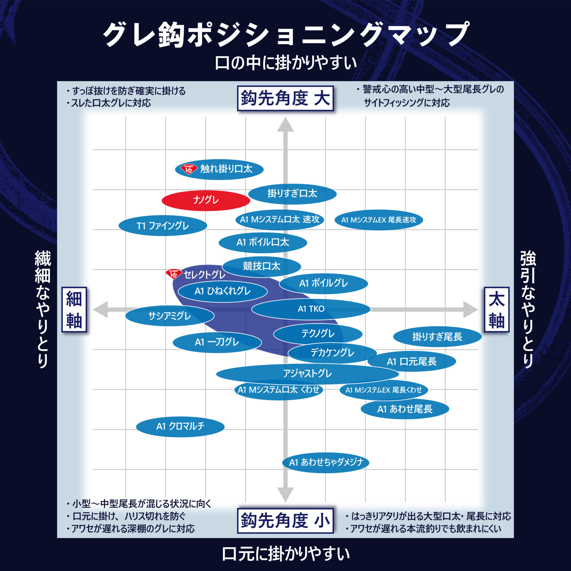 相反する性能である“超早掛け性能”と“高貫通性能”を高次元で融合させた次世代の口太鈎です。今までのグレ鈎にない軽量・鈎先角度に加え、驚異の超低摩擦コーティング「ナノスムスコート」加工を施しました。様々なコンディションで実釣を繰り返し、グレとの鈎先のコンタクト性能を最大限に引き出す鈎先角度とフトコロ形状を追究。「ナノスムースコート」の驚異的な貫通性能で常識破りの鈎先角度を可能にしました。特に喰い渋りの激しい低水温時の口太グレや、活性の低い湧きグレ狙いに最高のポテンシャルを実感していただけます。