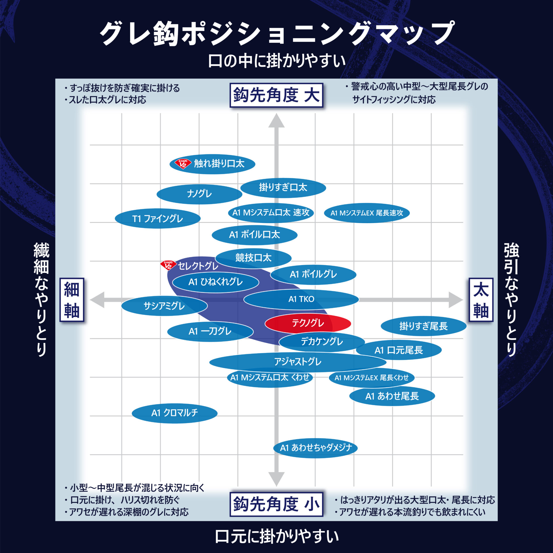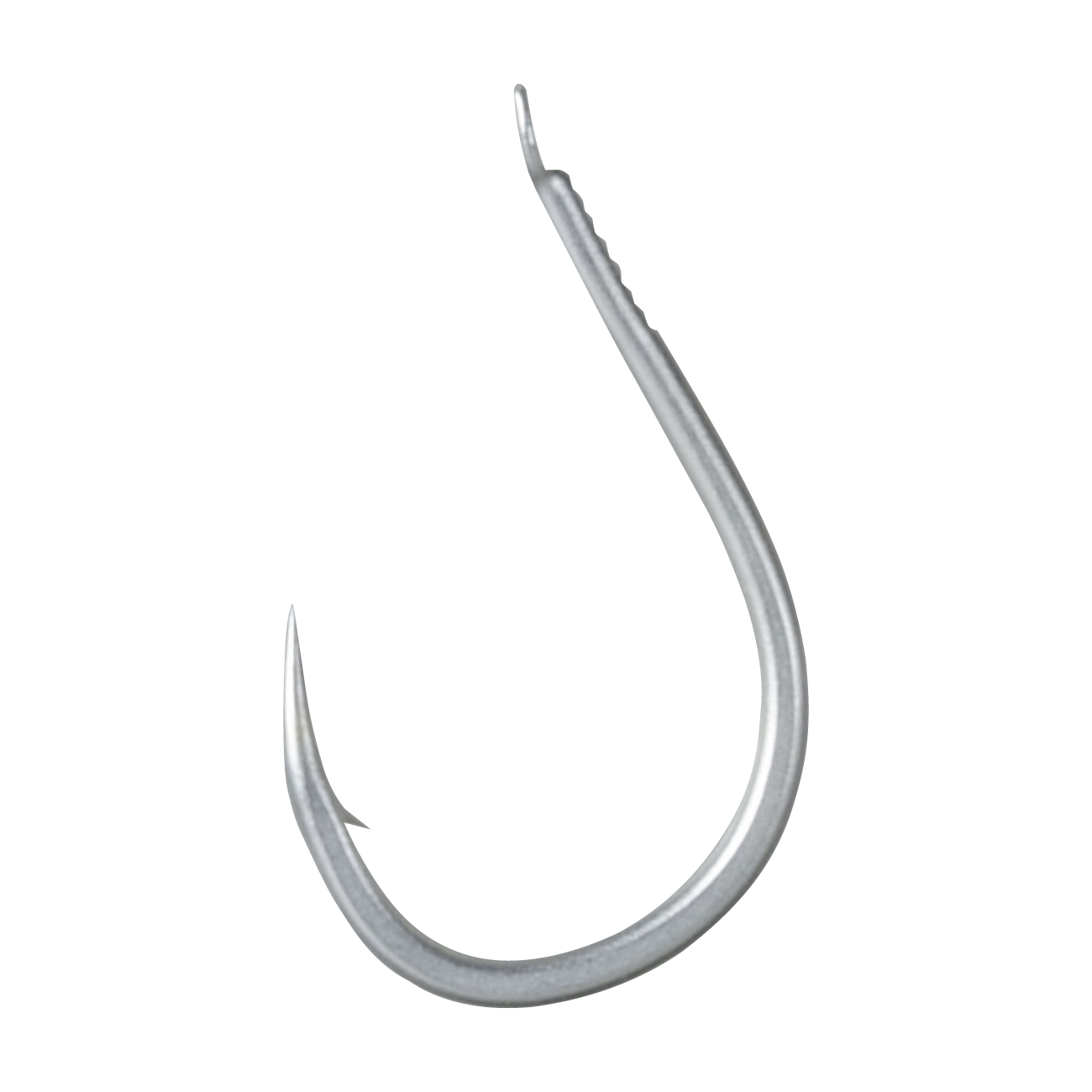 最大の特徴はその鈎先構造。職人の確かな技術が可能にする鈎先の一部のみを曲げたピンポイントベンド。シワリタイプのように口元に掛ける効果を有しながら、ストレートタイプのような高い貫通力を持ちます。「パールホワイト」カラーは膜厚を通常の1/5以下に抑えた表面処理で非常に鋭利な鈎先を維持。アワセのパワーを100%口元へ伝える設計で、ハリスの磨耗も少なく、手返しも良好です。また、緻密に長さを制御して作られる短耳により、オキアミの中へ簡単に鈎を埋め 込むことが可能になりました。隠密性の高いカラーリングと相まって、喰い渋ったグレに違和感なくエサを食い込ませます。タフコンディションで数釣りを要求されるトーナメントで最高の性能を発揮するグレ鈎です。