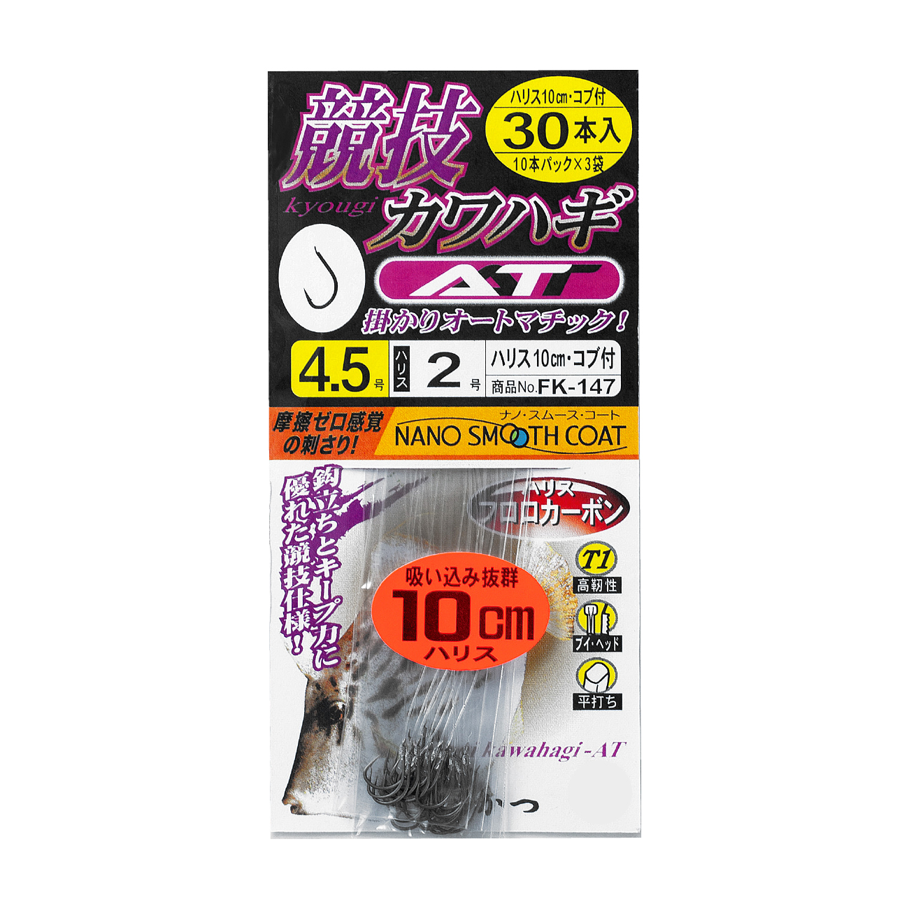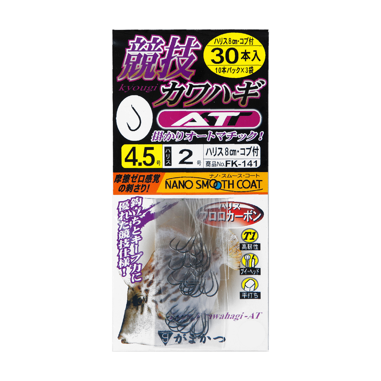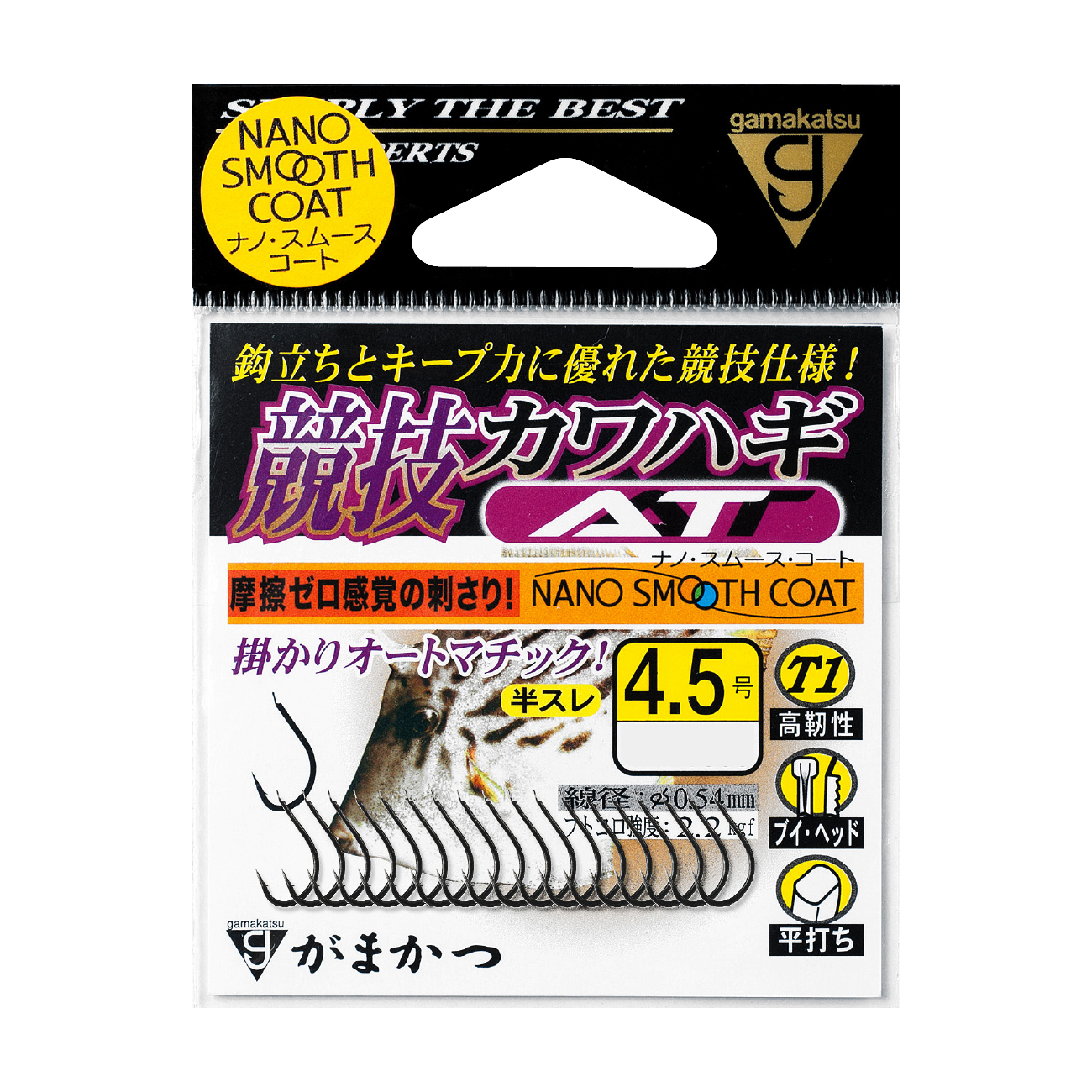 仕掛のテンションを抜くタルマセ釣り、ハワセ釣りに、特に効果を発揮します。独自の吸い込みやすいフォルムは、カワハギの口内奥深くまで吸い込ませ、まさにオートマチックに鈎掛かりします。カワハギへのコンタクト性を高める開いた鈎先は、「ナノスムースコート」だからこそ可能になりました。口内深くに鈎が立つ形状でありながら、自ら掛けにいくことも可能な幅広い対応能力を持ちます。