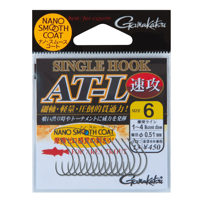 フックポイントの露出を高めトラウトの口を深く捉えるワイドフォルムと、フィネスタックルにおけるフッキングパワーを効率よく鈎先へ伝える攻撃的なエントリーアングルによるコンタクト性の高さと高貫通力が最大の魅力です。一旦刺さり込んだ後は、長い鈎先がトラウト特有のバレを防ぎ、フッキングからランディングまでの一連の動作を高次元で行えます。また、余分な強度を排除した細軸軽量設計によりルアー本来のアクションを損なわず、バイトチャンスを増やします。素材には、高靭性素材「T1」を採用し、平打加工と相まって鈎の変形を最小限に抑えます。