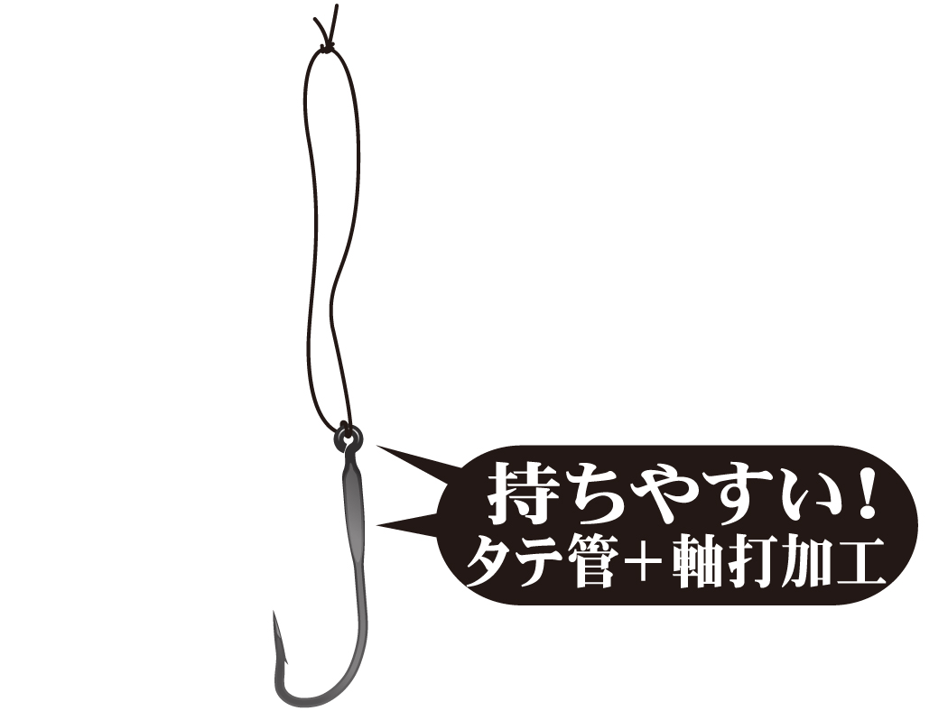 管付設計により従来の脱着式背鈎では不可欠であった「根巻き+瞬間接着剤」が不要。「縦管」+「軸打加工」により持ちやすさが向上し手返しアップ。鈎先は刺しやすく不意の背鈎の抜け落ちを防ぐ「半スレ」を採用。フッ素樹脂コート「ナノスムースコート」によりスムーズな背鈎装着を実現。