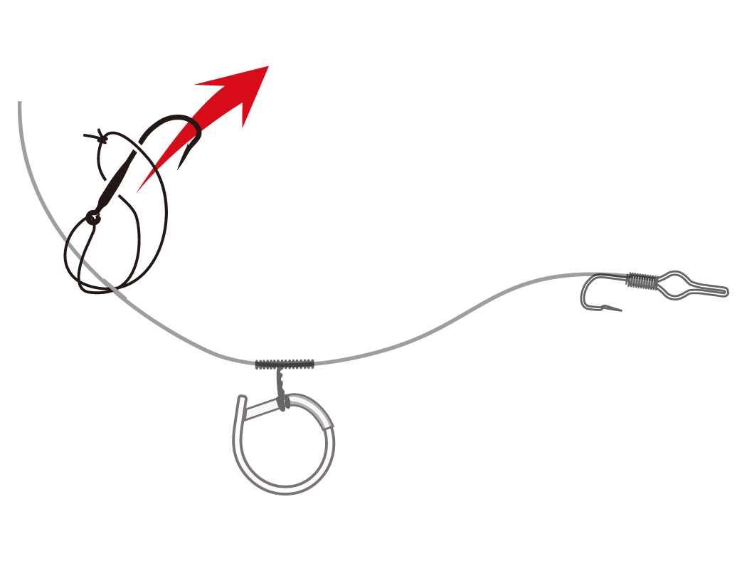 2.ハナカン仕掛の中ハリスにセット。(輪にくぐらせて締め付ける)。セット後も位置は移動可能。
