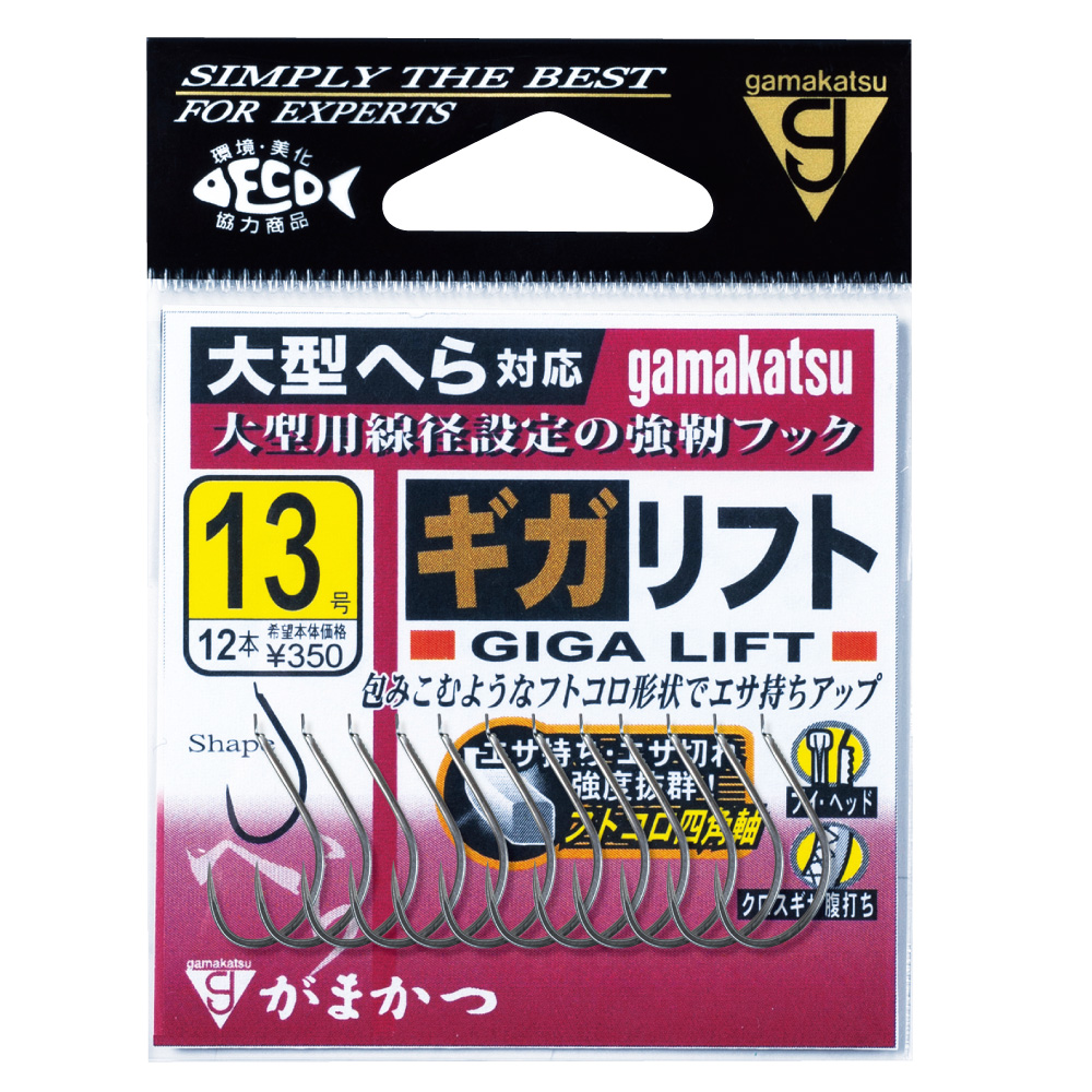 「ギガリフト」は、大型へらを釣るために作られたオールラウンドフックです。軸は強烈な引きの大型へらに対応し、柔らかいエサでも大きくしっかり付けられる太軸設計。軸には「四角軸+クロスギザ」加工を施し、ダンゴエサや両マッシュの宙釣りでは「クロスギザ」と包みこむようなフトコロ形状がエサ持ちを向上させ、「四角軸」がエサ切れの良さを発揮。