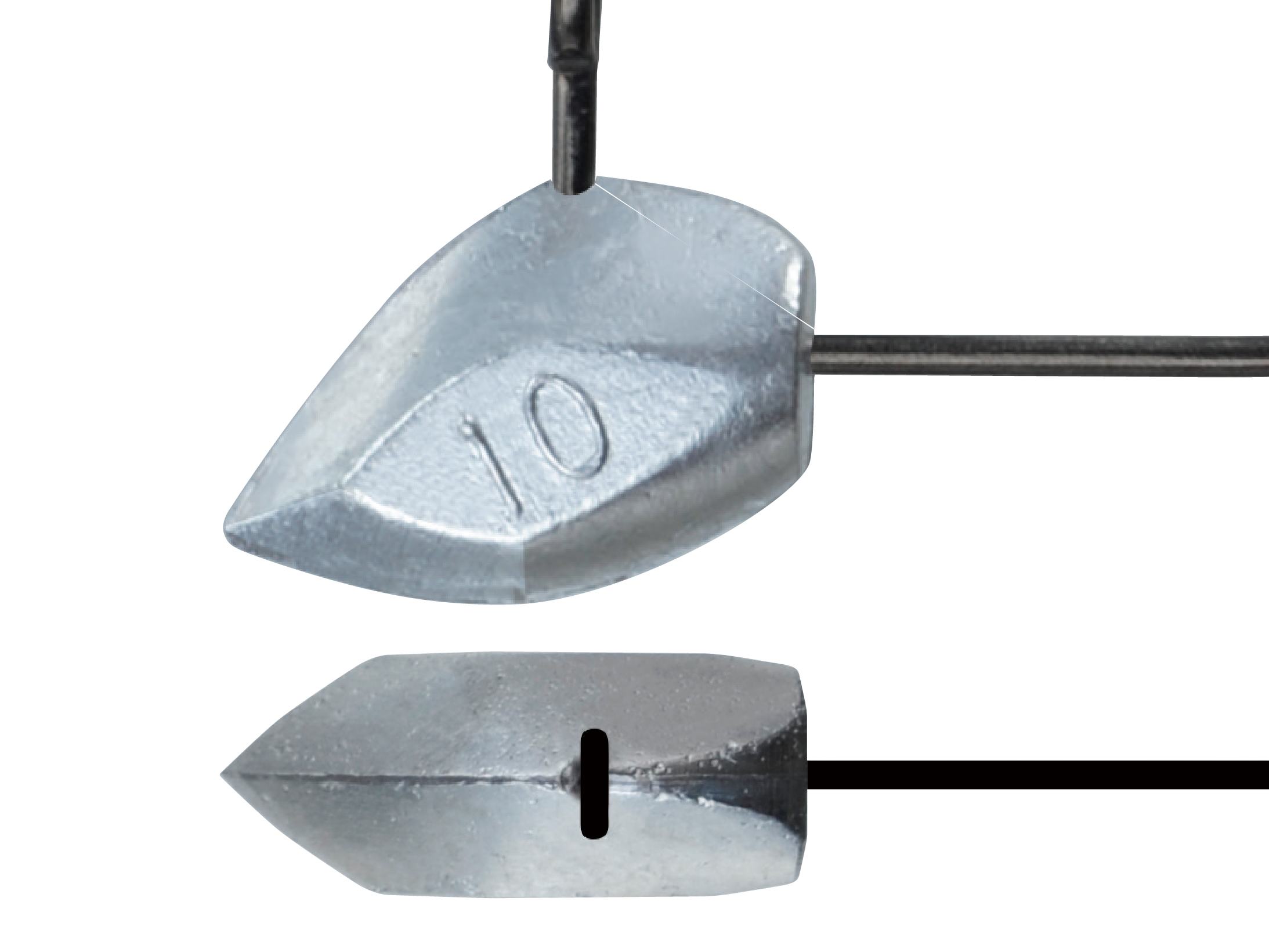 ショートダートを生み出す独自のヘッド形状。ヘッドは側面がフラット形状で持ちやすい! ウエイト刻印入りで一目でわかる。