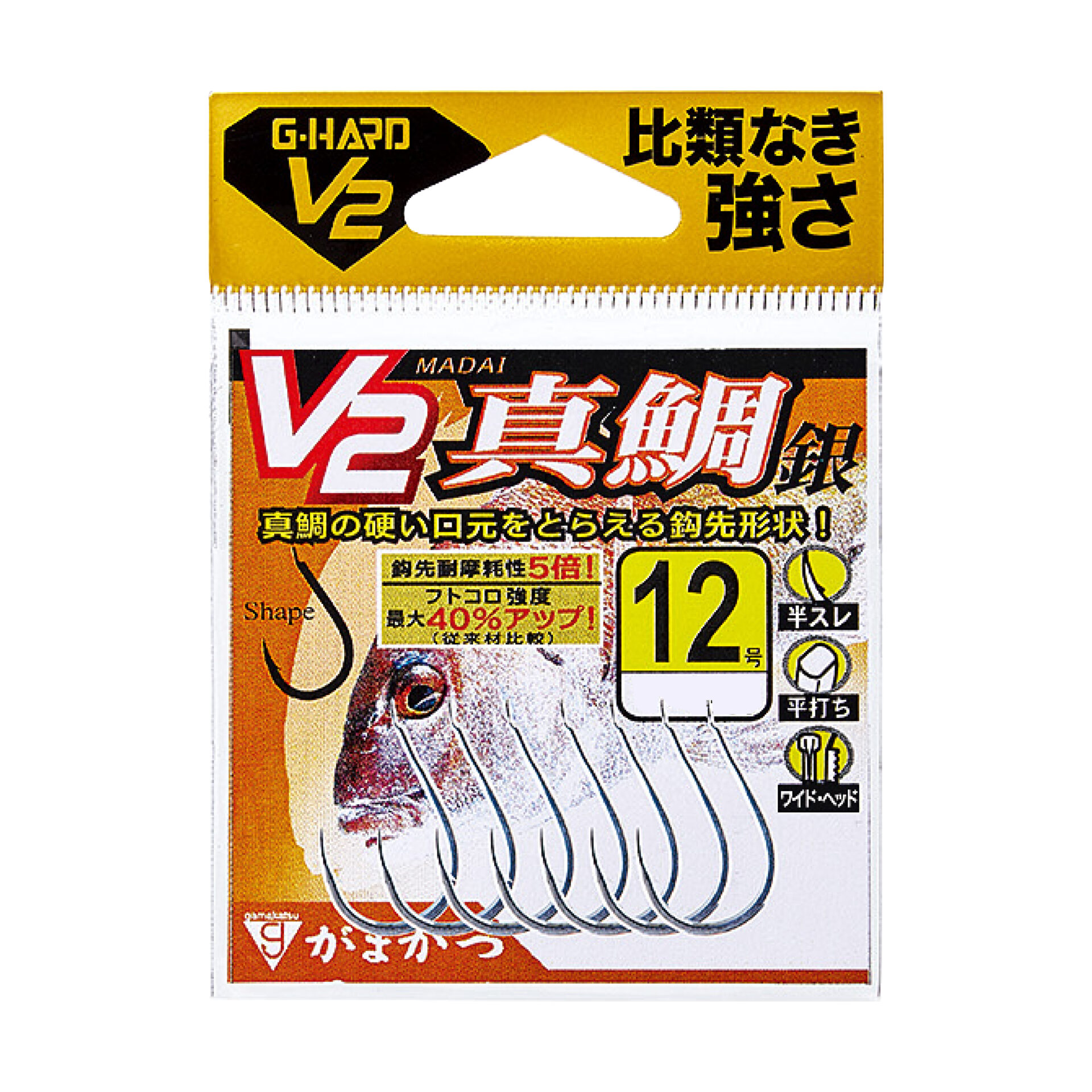 真鯛のカンヌキを捉える鋭い鈎先。高強度素材「G-HARD V2」採用により突然の大型真鯛にも余裕を持って対応。太ハリスの結びが決まる「ワイドヘッド」。「金」と「銀」の2色展開。船・磯等様々なフィールドで活躍します。