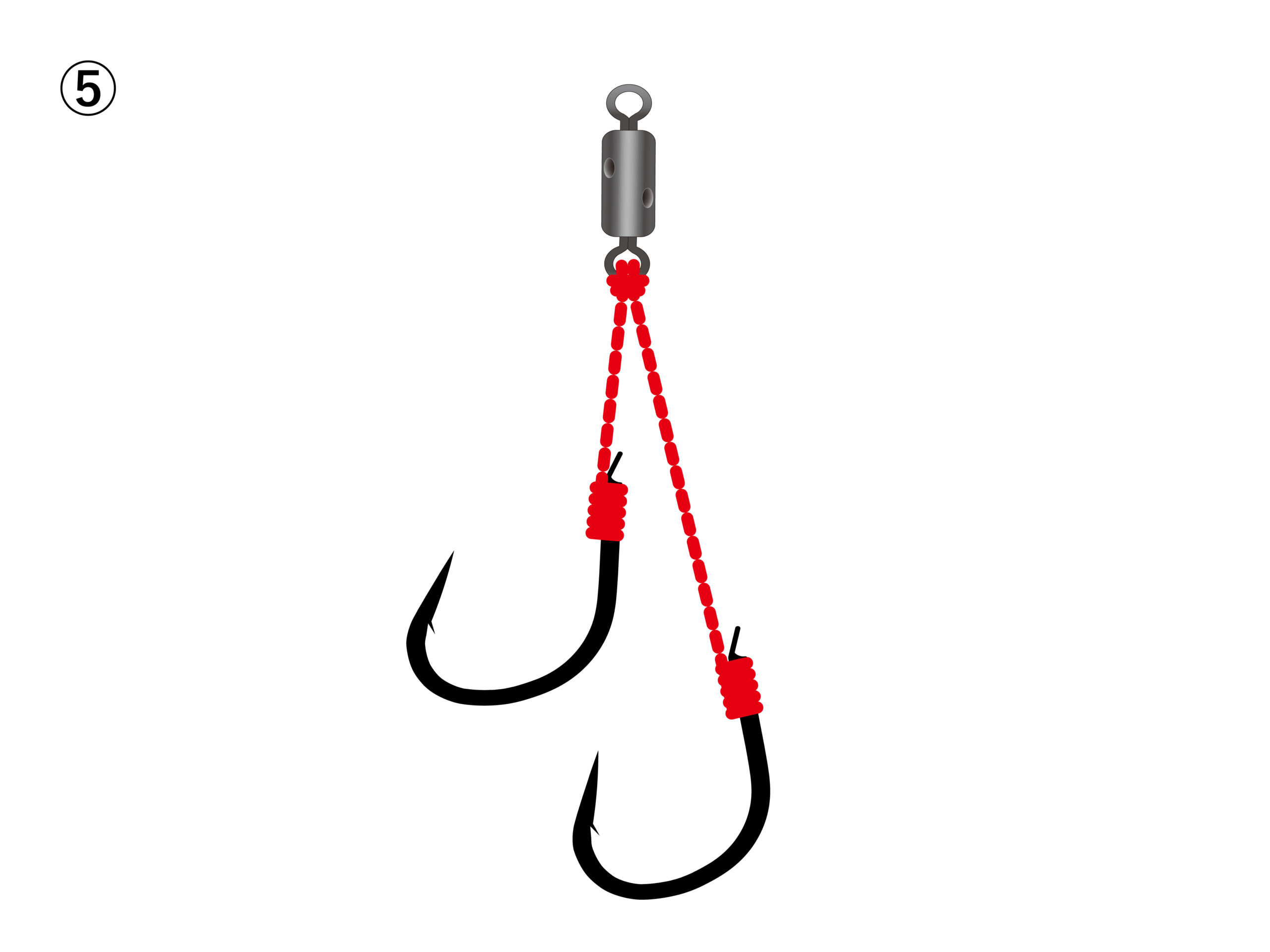 1.ループを作り、スイベルの穴に通します。この時上下の鈎に段差をつけておきます。