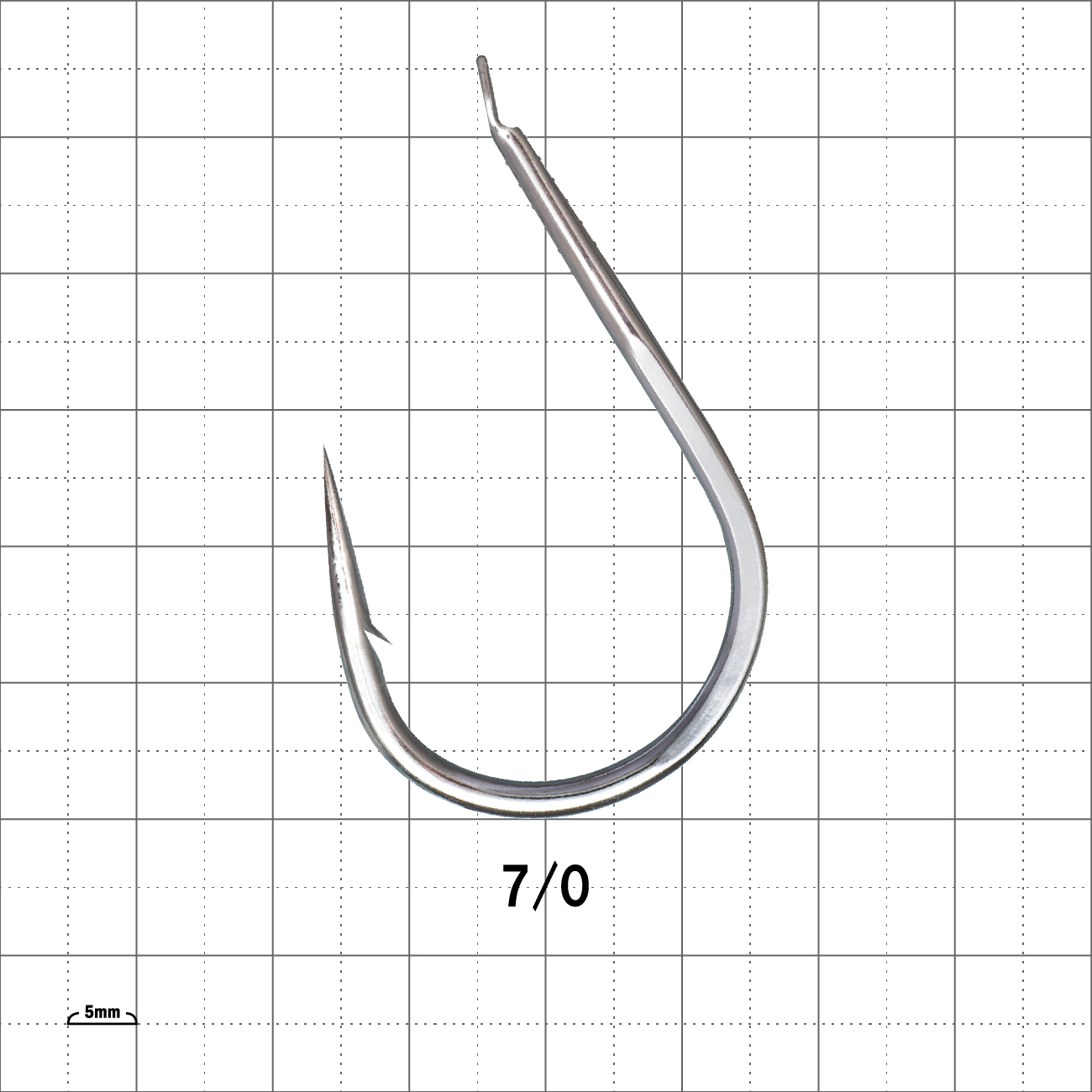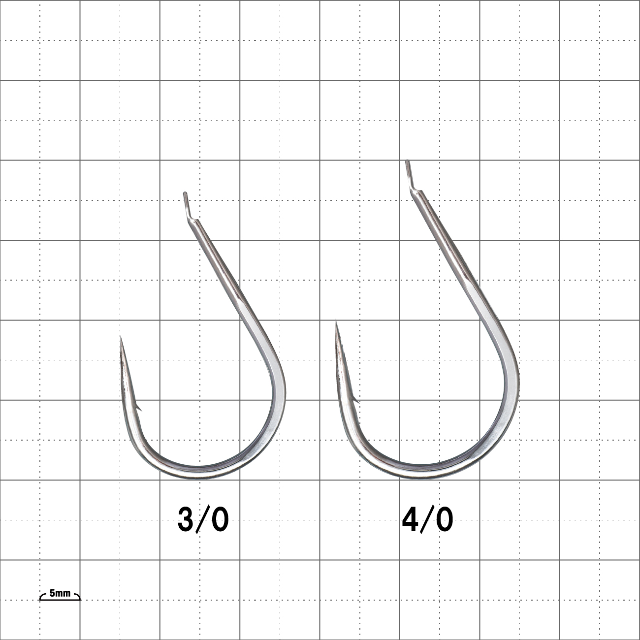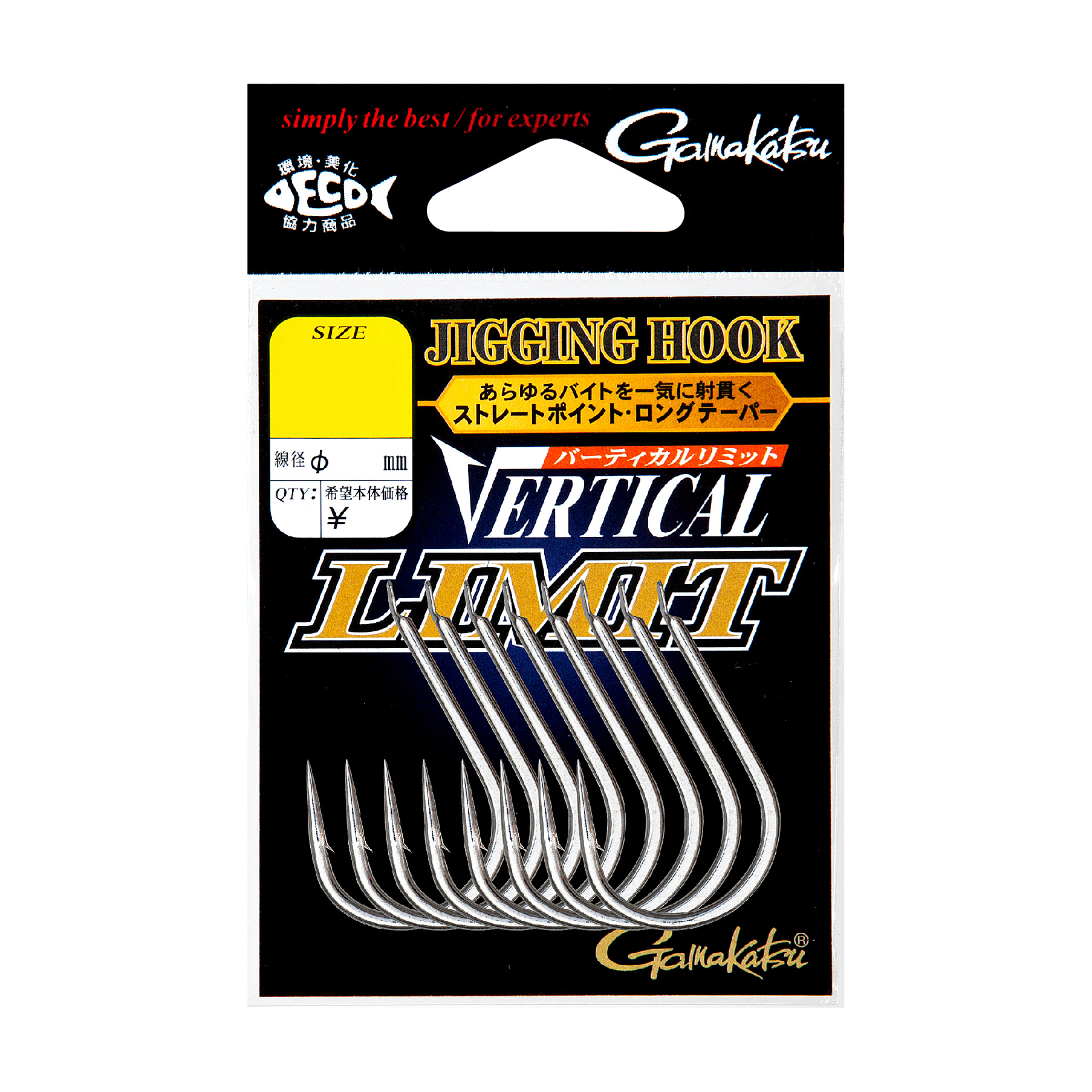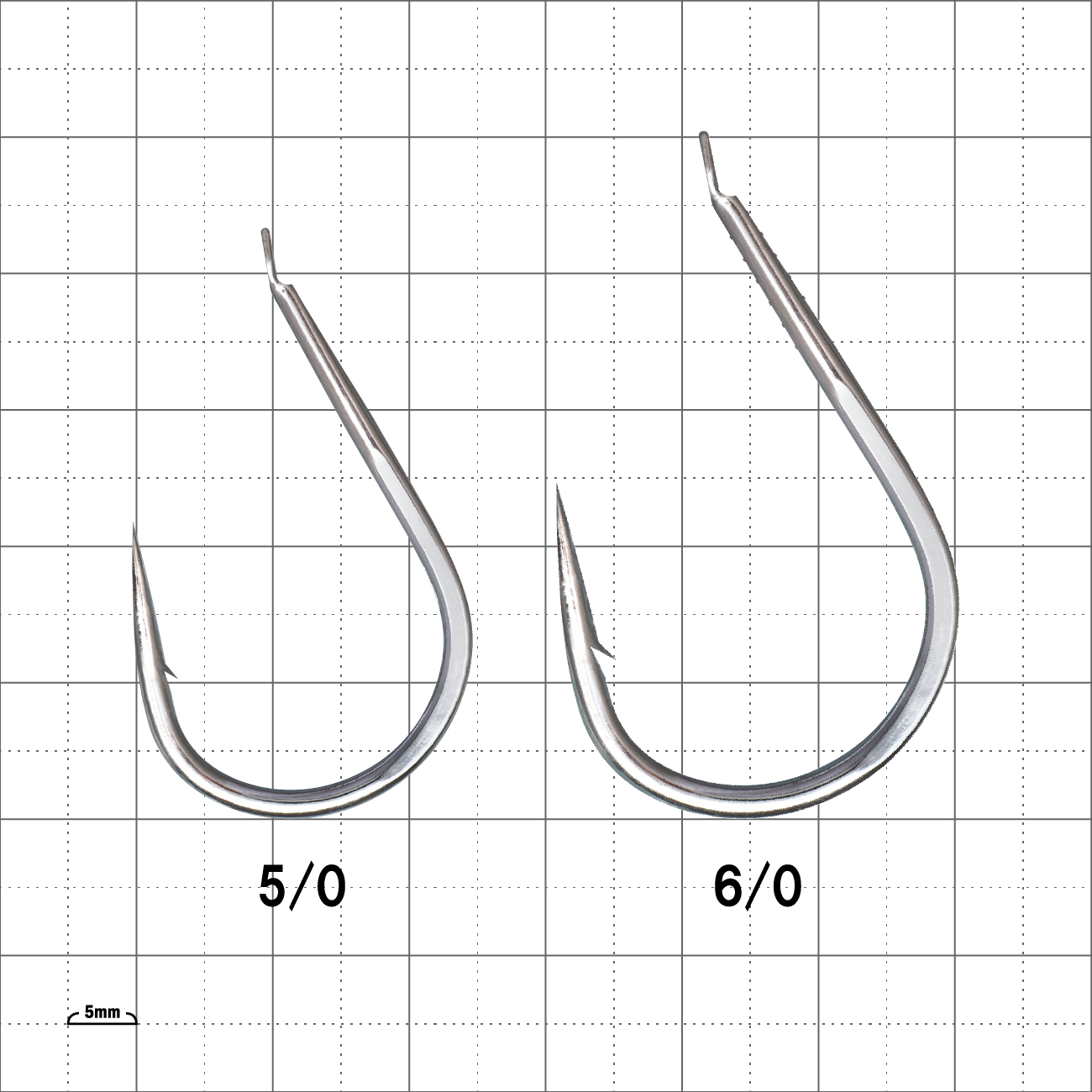 バーティカルリミット最大の特徴は、抜群の掛かりの良さとホールド力。特に魚の活性が低かったりバイトが浅いような状況で高い特性を示します。魚の身に対して、鈎の先端が触れたところから刺さり込もうとする「初期掛かり性能」と、魚が反転しようとするだけでもしっかりと掛かってしまうほどの「貫通力」という、背反する要素をバランスよく両立しています。計算し尽された鈎先角度かつストレートポイント設定で、初期掛かりの良さと貫通力のバランスを追求しブリ・ヒラマサからカンパチ・大型ハタ類に対して、剛柔いずれのファイトスタイルにも対応可能な強度を備えた線径の素材を号数ごとに選定しました。魚の負荷を広範囲に捉えることでホールド性能に優れたシンプルなラウンドベンド形状ですが、身切れを軽減させるためにベンドヒール(フトコロ最深部)には丸軸部分を残しつつ、フック本体の形状保持力を高めるため、部分平打ち加工を施しています。タタキ仕様でフック自体の重量を抑えています。近海ジギングにおける新しいスタンダードフックのひとつ。「どんなフックを選んだらいいのか分からない」という時は、このフックをお試しください。