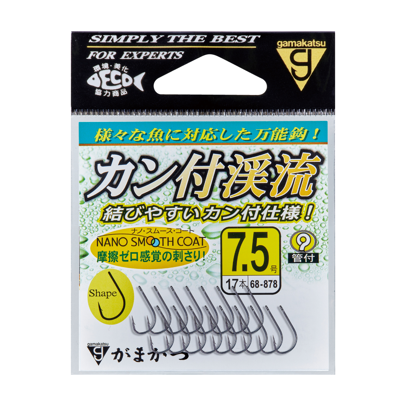 カン付により鈎結びが簡単に行えます。ベーシックな袖型形状により様々な釣り場・魚種に使用可能。ナノスムースコートによりエサ付けしやすく、渓流魚の硬い口元にも鋭く刺さり込みます。