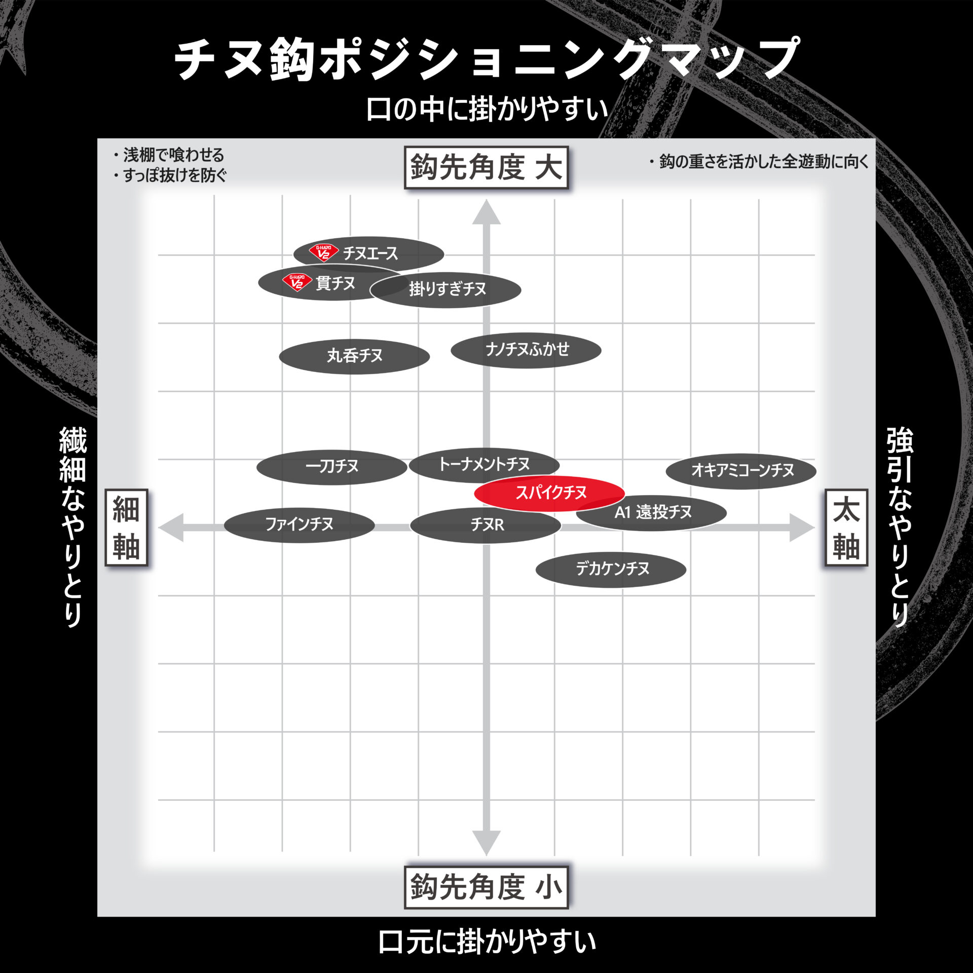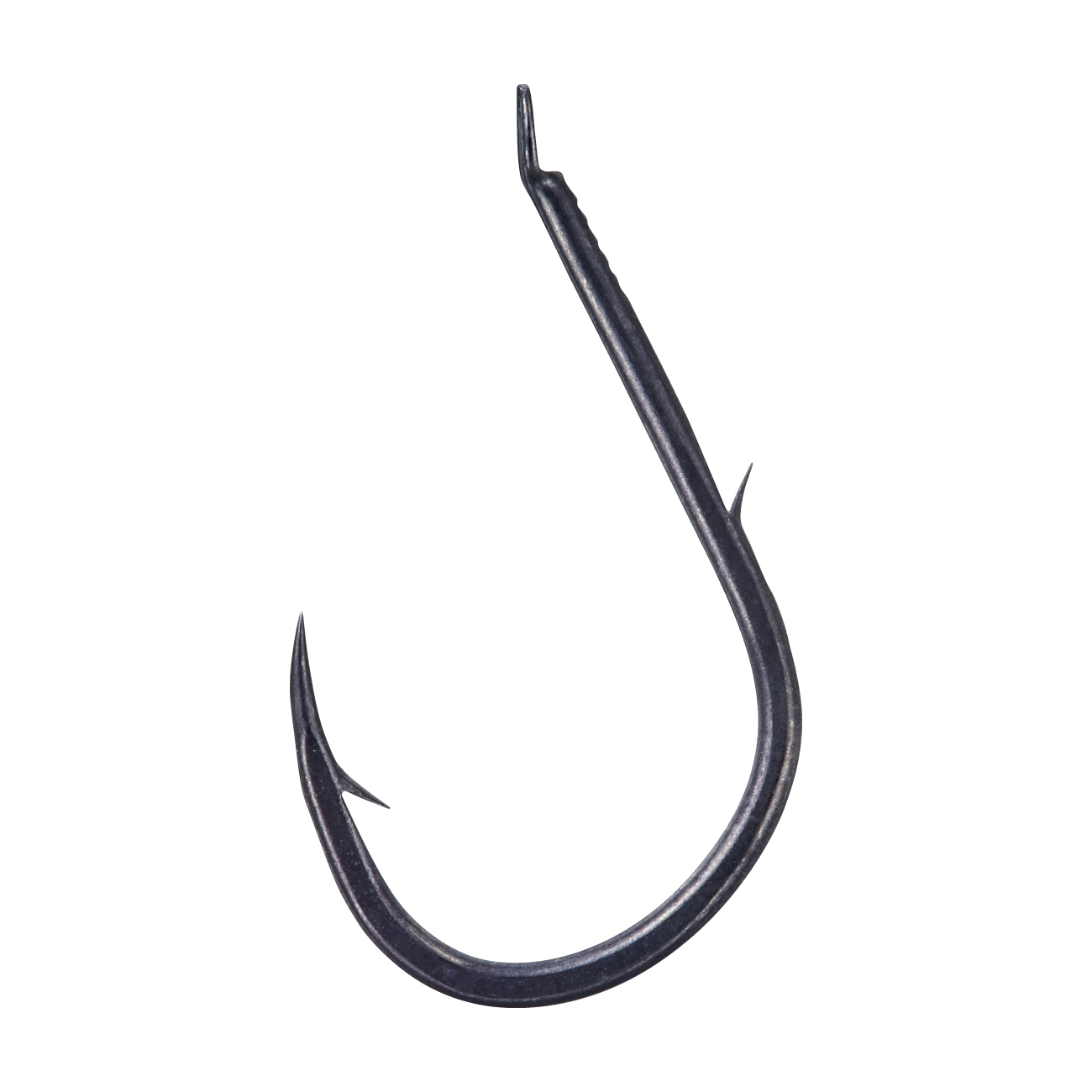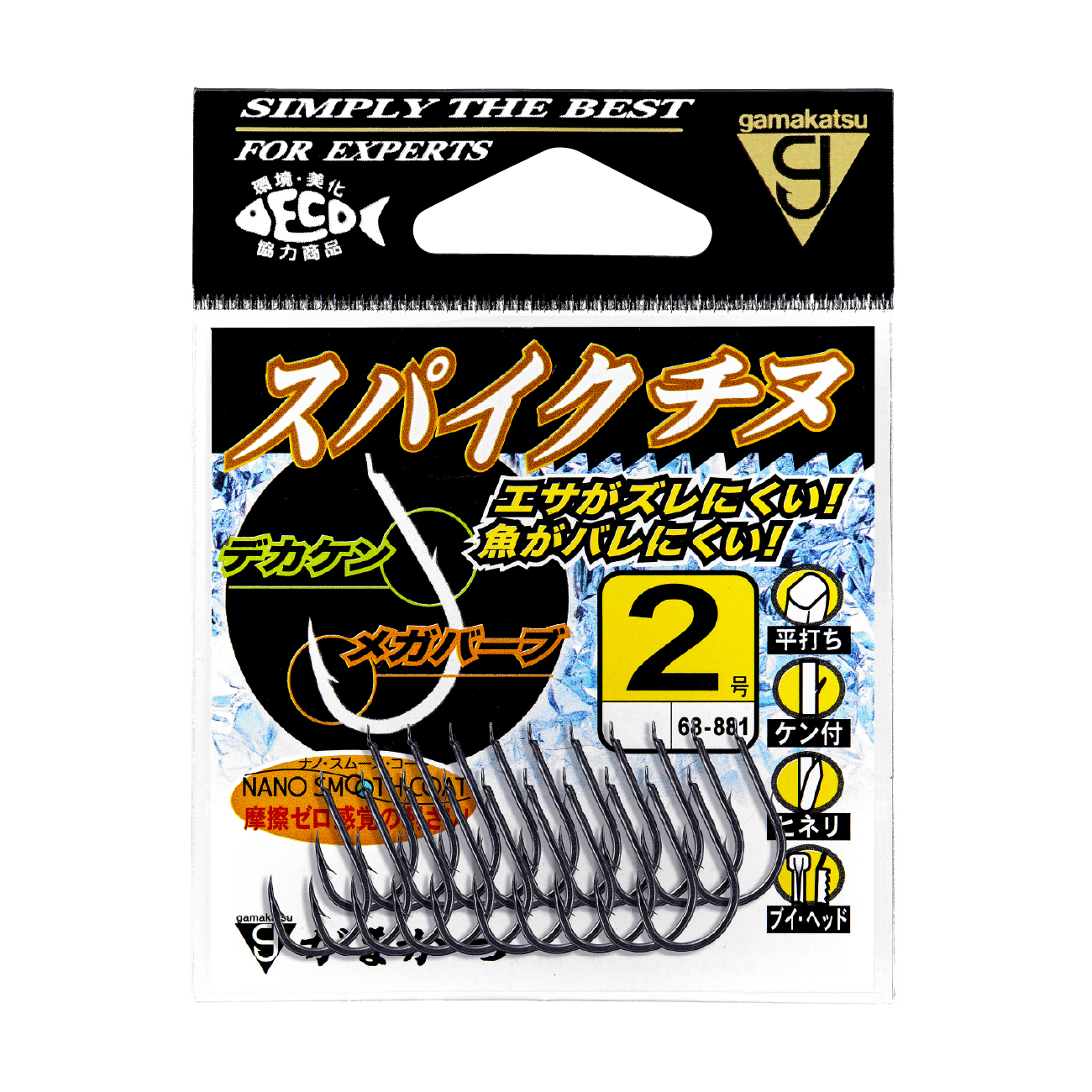 最大の特徴は、従来のチヌ鈎のカエシよりも大きな「メガバーブ」を採用することにより、掛けた魚をガッチリキープ。特にシモリ周りでのラインテンションをコントロールしながらのやり取りや、春先の藻が多く生えた釣り場でのラインテンションの緩みによるバラシを軽減。軸部には大きなケンの「デカケン」を採用し、「メガバーブ」との相乗効果により、遠投や強風時の強い振り込みでのサシ餌のズレを軽減。形状はスタンダードなシワリとヒネリを採用し、チヌの口元をしっかり捕らえ、高い貫通性能を誇る「ナノスムースコート」がチヌの分厚い唇を確実に貫きます。