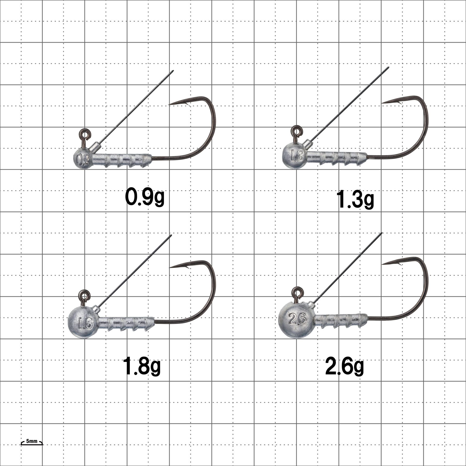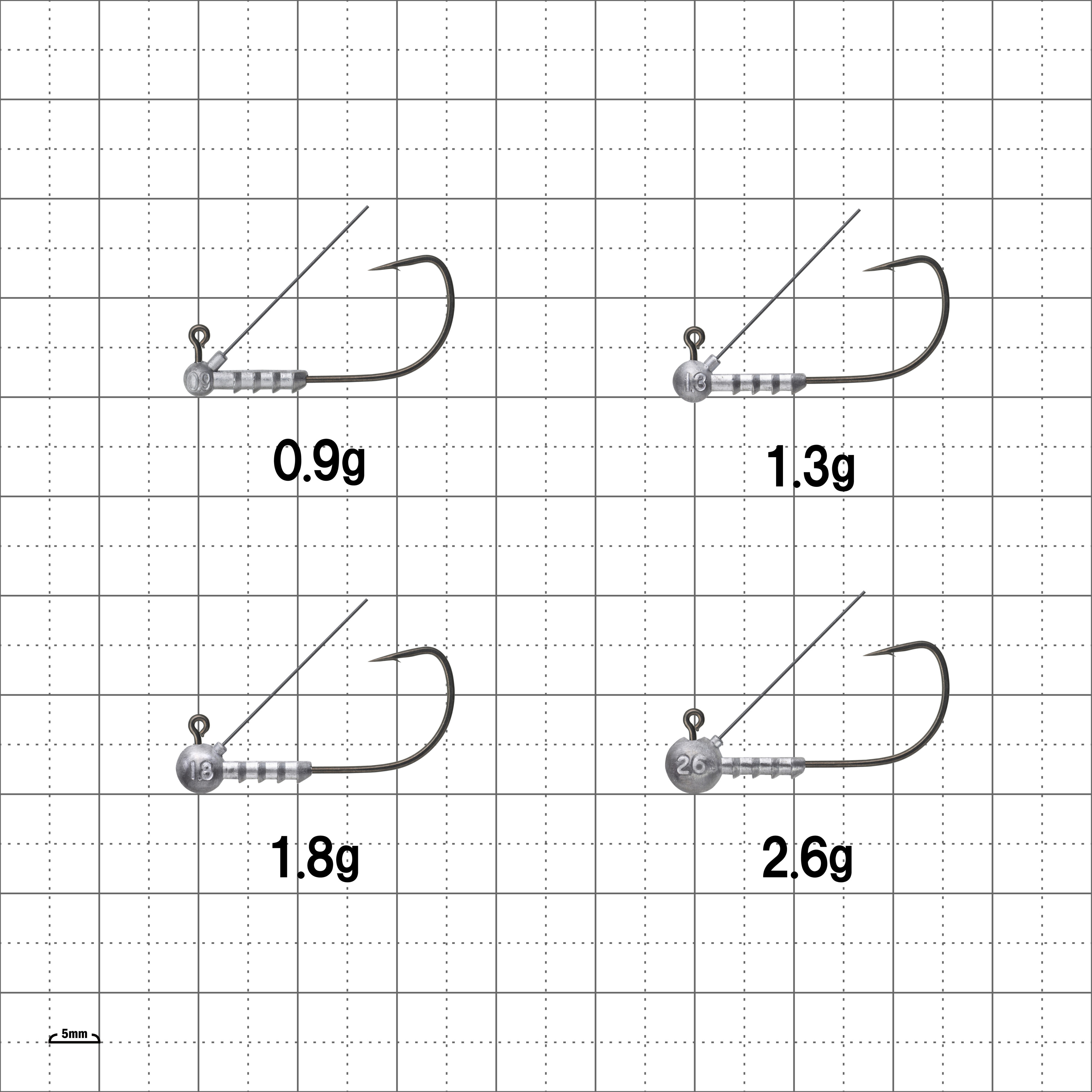 ホリゾンヘッドLGゆずりの薄刺し可能な上面フラットのキーパー形状。ウィードやストラクチャーに対応したガード付き仕様。鈎は鈎先角度を考慮した最適形状に設計、また高強度・高硬度のT.G.Wを使用することで大型のバスにも対応しています。ミドストやスイミングなど、ボート・おかっぱりを問わずこだわりぬいたジグヘッドです。