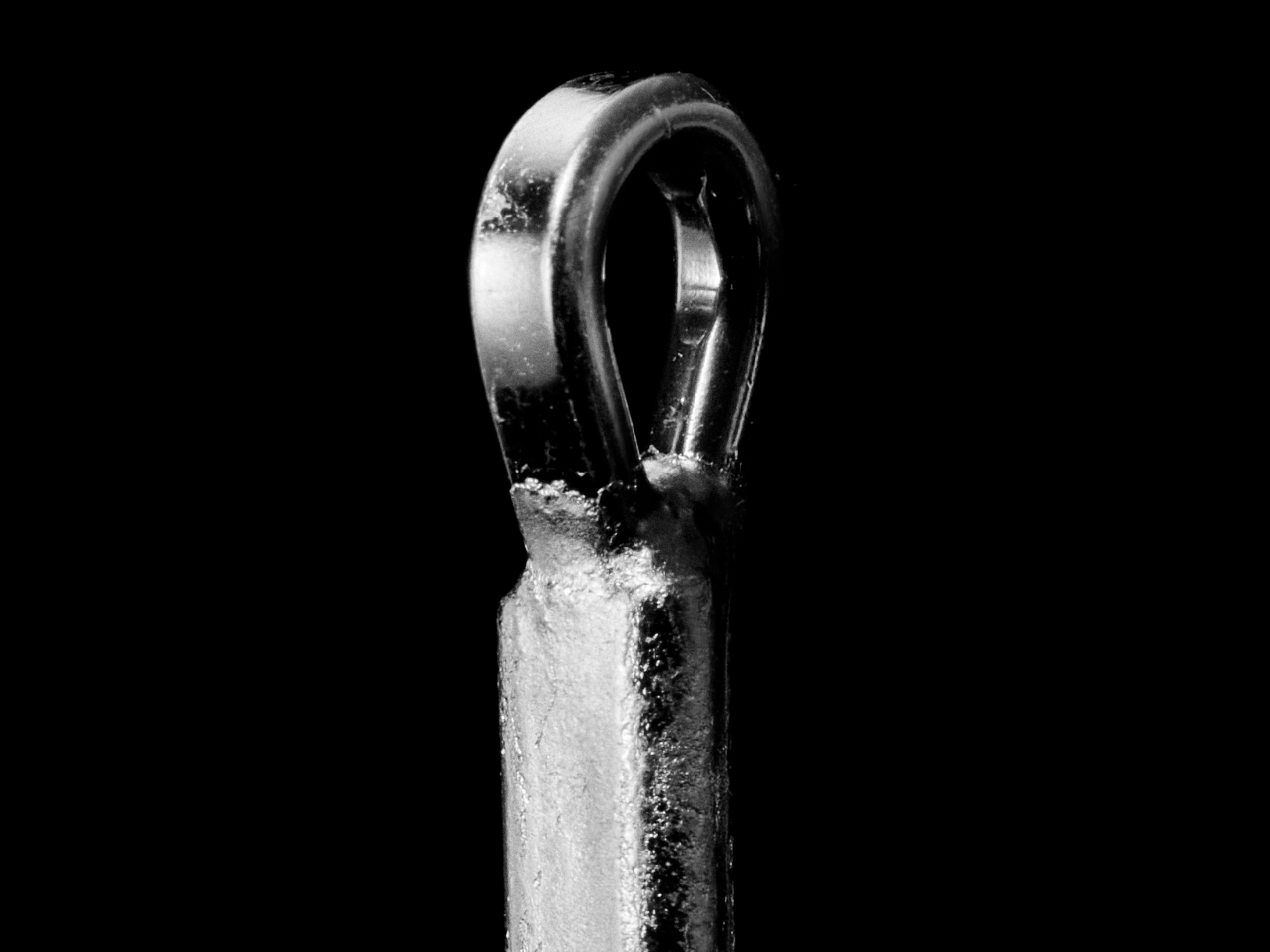 ラインアイの一部にプレス加工を施し薄くすることで、スプリットリングの着脱を容易にします。