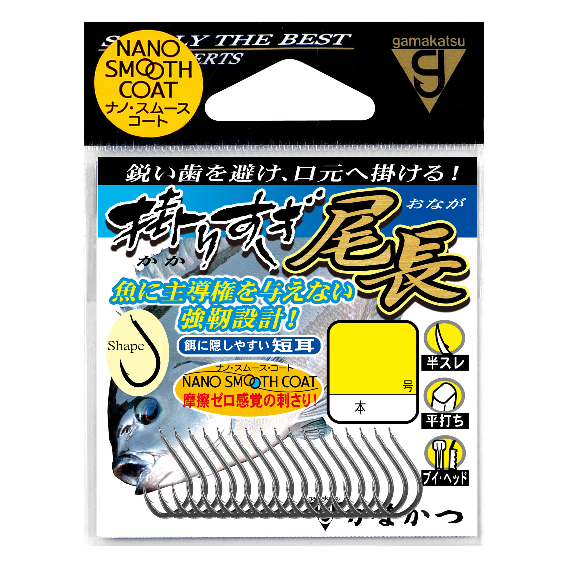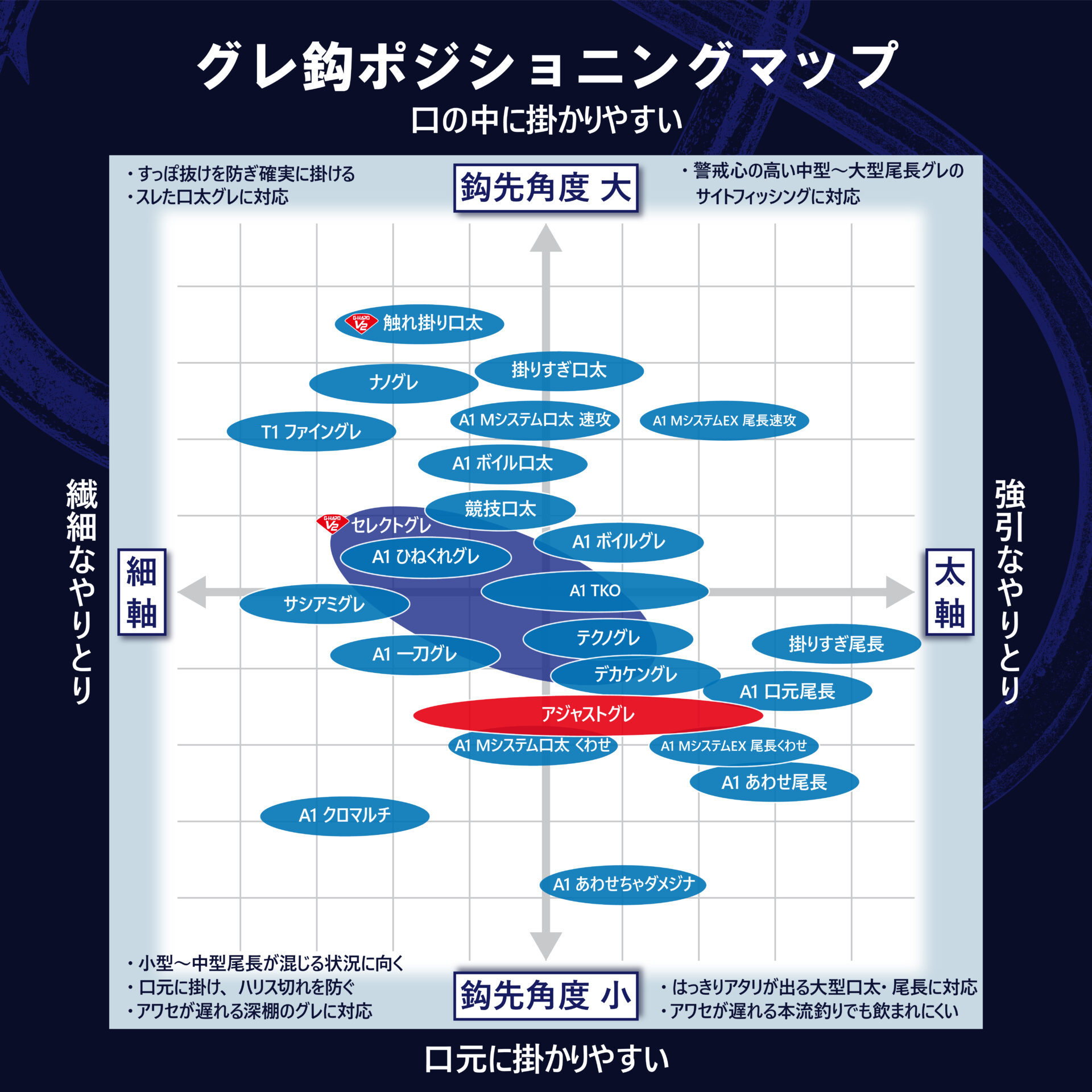 太平洋一帯はもちろん日本海の北陸・東北でさえ50cmを超える尾長グレの釣果が聞かれるようになった。もはや尾長グレは身近な存在となりつつある。引きの強さで知られる尾長グレだが、口元に鈎掛かりさせることができれば取り込める確率はぐっとあがる。そこでアジャストグレは鈎先を内側にカーブさせたシワリ形状とし、早アワセをせずとも口元をとらえることができる形状を採用した。尾長グレ・口太グレの両方を対象とするために、強靭なA1素材を採用し、必要十分な細さで軽く仕上げることができた。サシ餌の自然な沈下スピードを実現しつつ、尾長グレの強い引きに負けない仕上がりとなっている。尾長狙いにはもちろん、口太と尾長が混じる状況や口太に呑まれたくないときなど、アジャストグレはオールマイティーに使えるグレ鈎となっている。