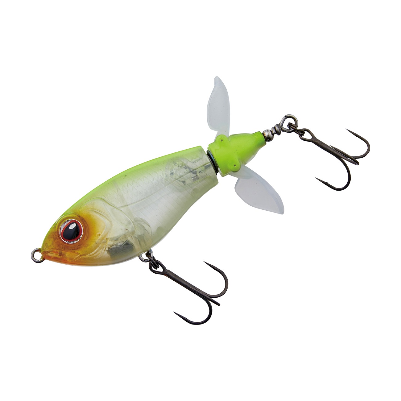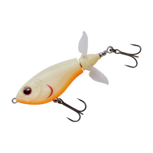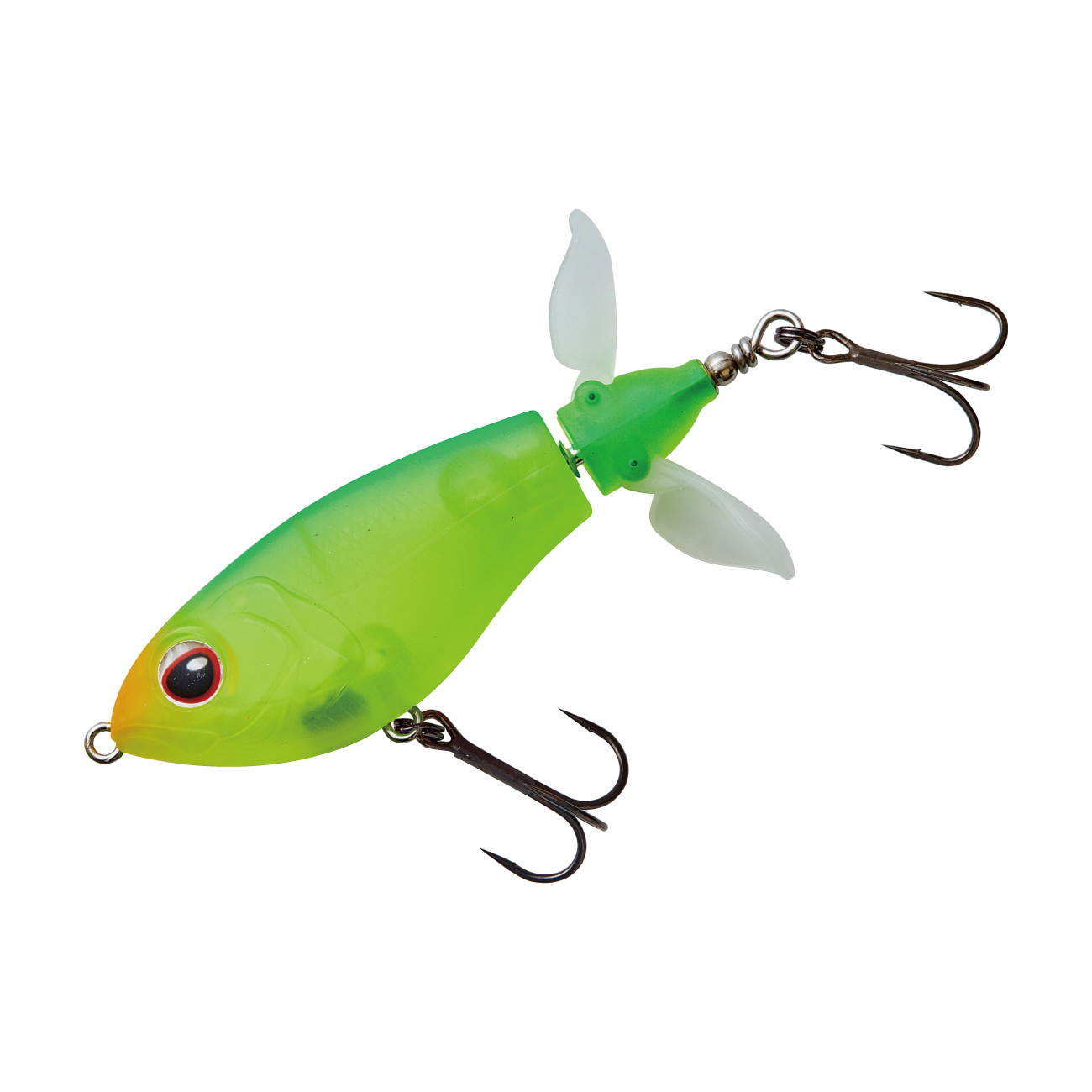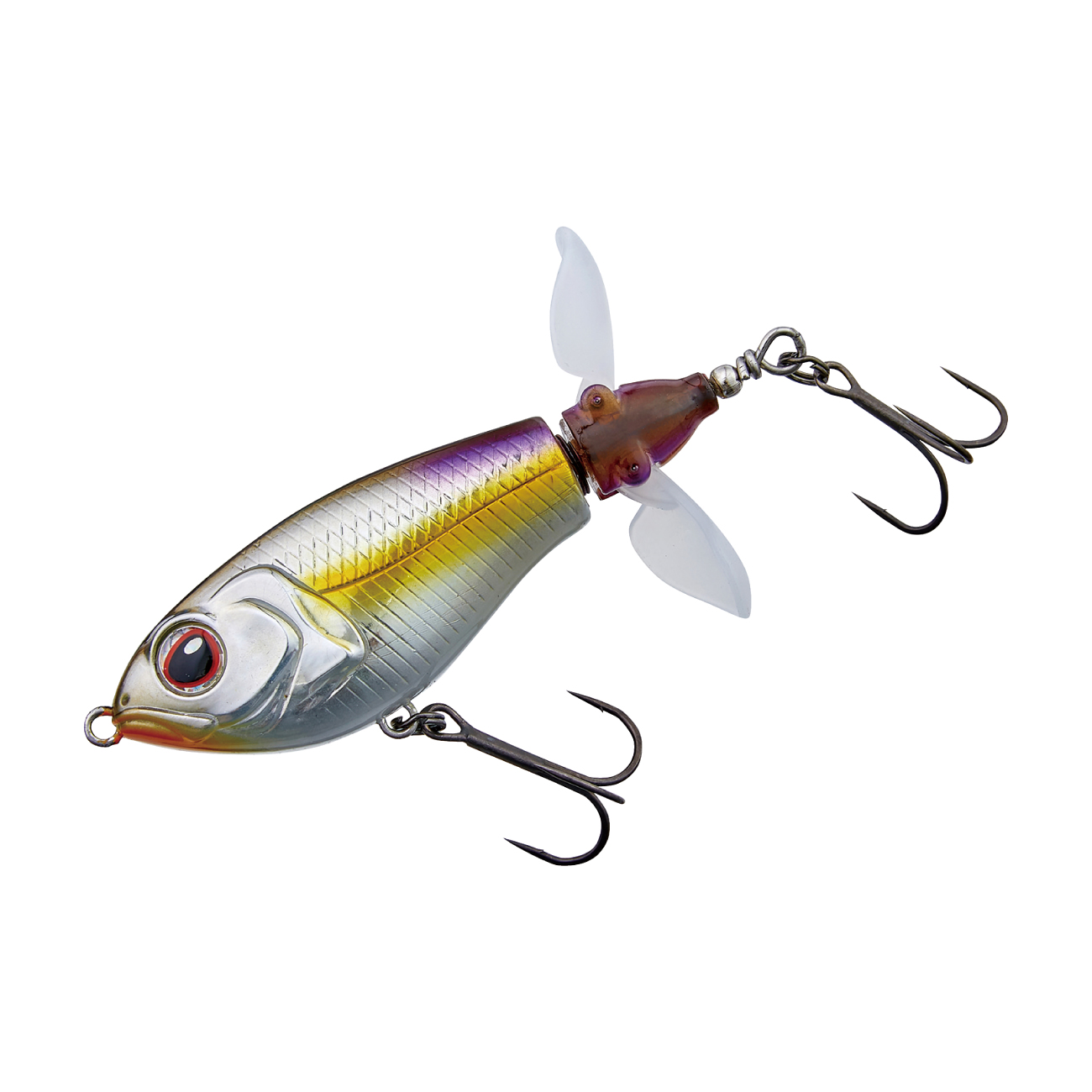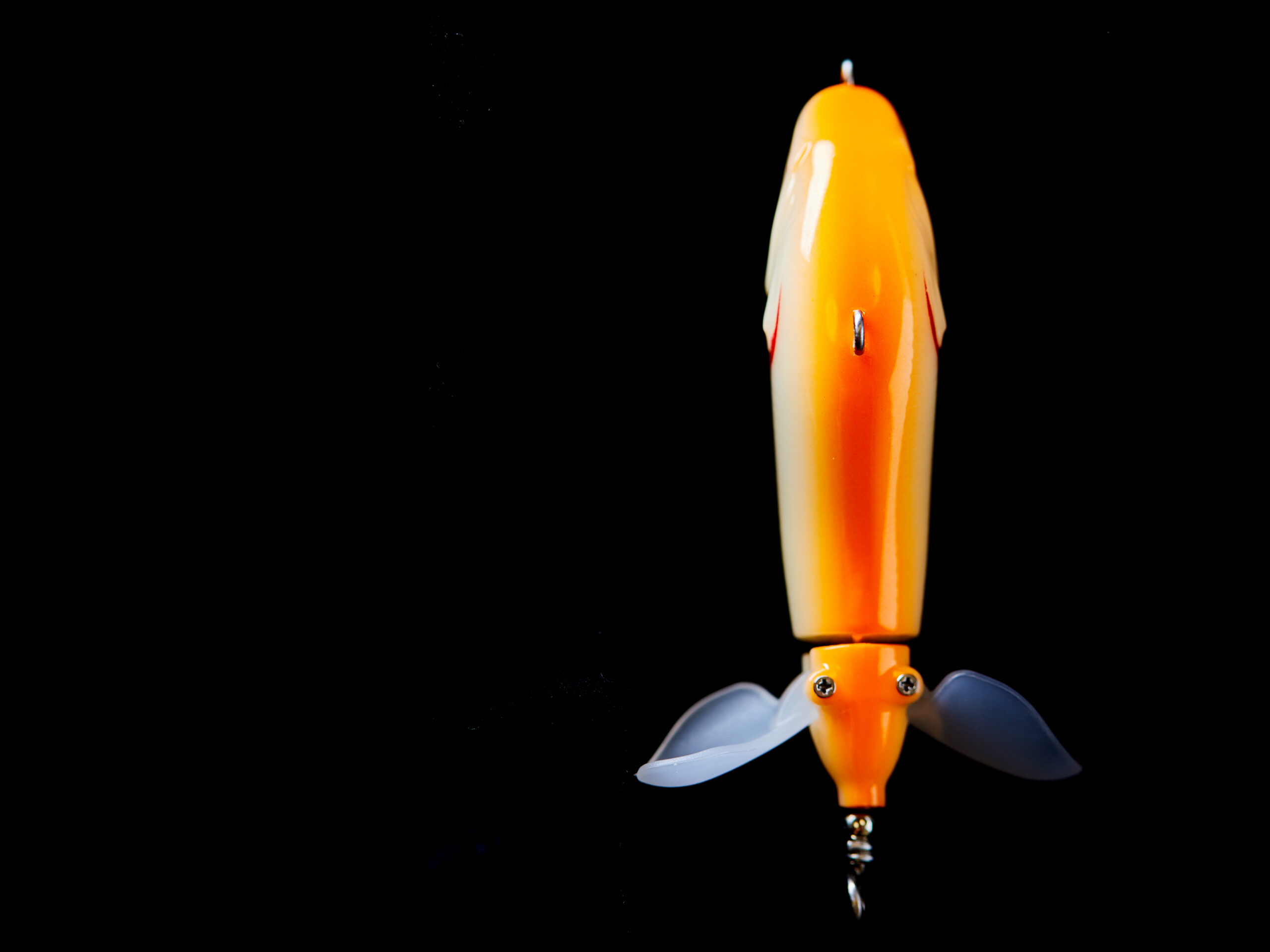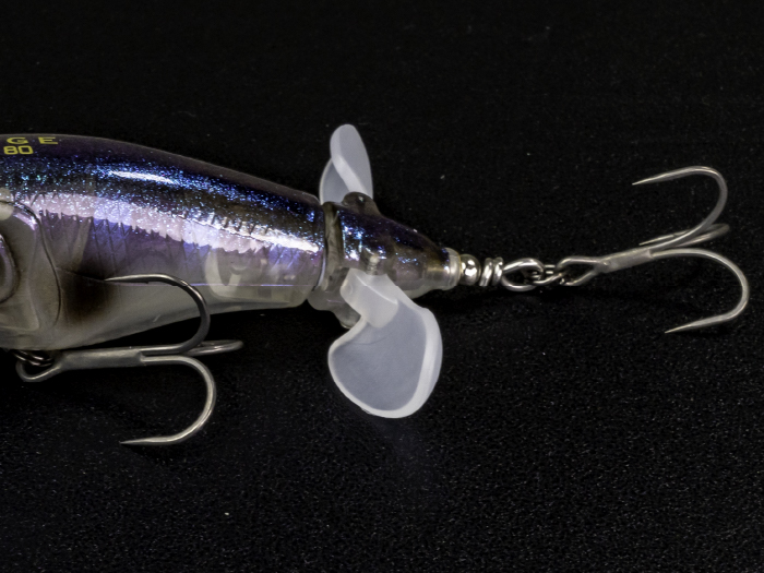 巨大なウイングを持つこの手のルアーには「飛距離が出にくい」という弱点がありました。その弱点を克服するために搭載されたのが、開閉式ウイングです。キャスト時にはウイングが閉じ、空気抵抗を減らす事で飛距離が安定し、着水と同時にウイングが開く事でレスポンスが落ちる事もありません。中型のウイングが2枚付いたプロップは低速リトリーブでもスムーズに回転し、高速リトリーブでもボディが傾く事なく、安定したリトリーブが可能です。また、ストップ&ゴー、リッピングなどの使い方も有効です。プロップが水を噛む淡いバブル音と、ボディとの間に仕込まれた2枚のワッシャーが出す金属音の複合サウンドがバスを強烈に刺激します。
