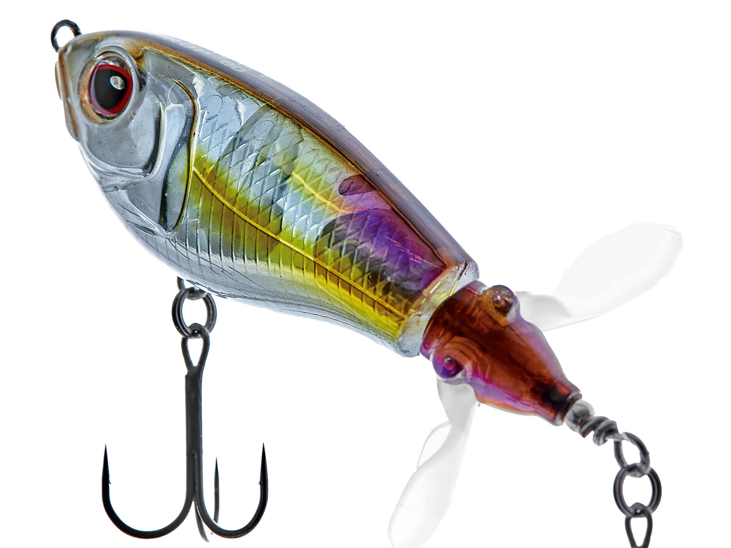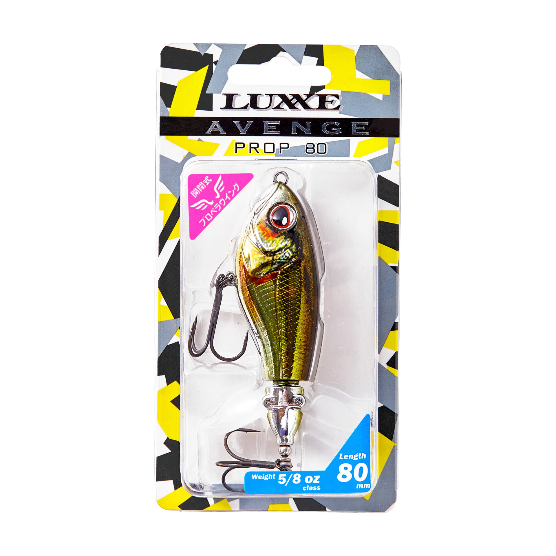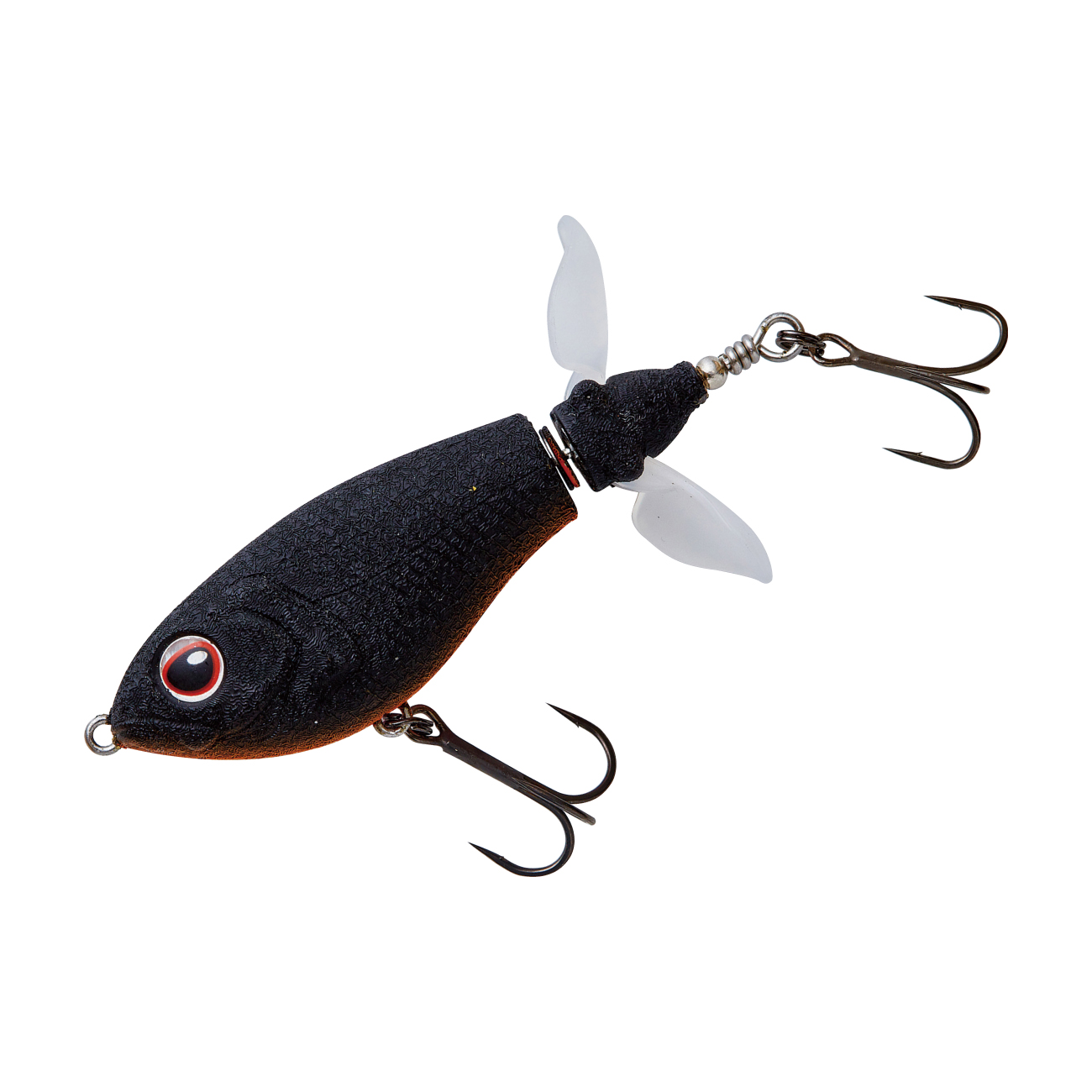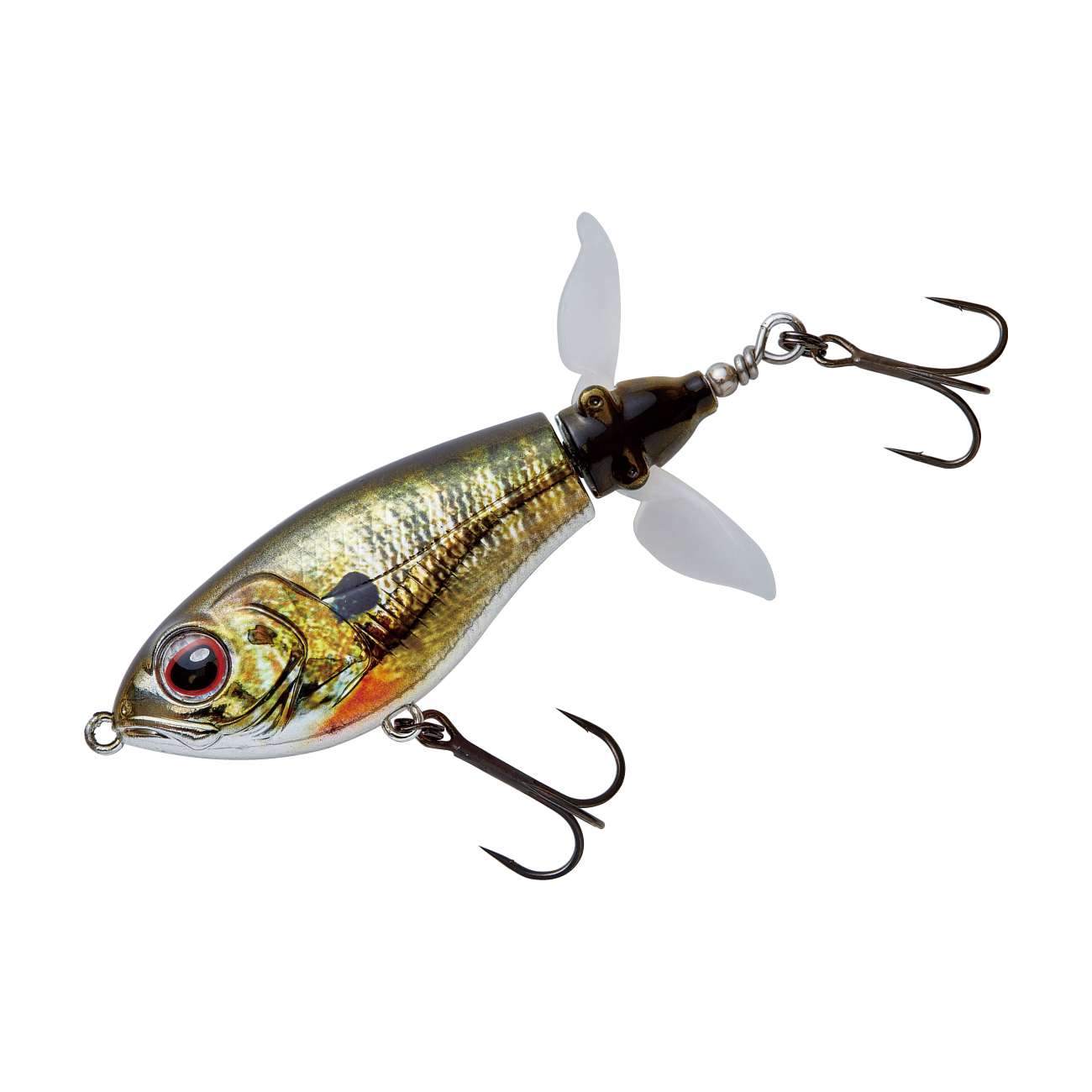 巨大なウイングを持つこの手のルアーには「飛距離が出にくい」という弱点がありました。その弱点を克服するために搭載されたのが、開閉式ウイングです。キャスト時にはウイングが閉じ、空気抵抗を減らす事で飛距離が安定し、着水と同時にウイングが開く事でレスポンスが落ちる事もありません。中型のウイングが2枚付いたプロップは低速リトリーブでもスムーズに回転し、高速リトリーブでもボディが傾く事なく、安定したリトリーブが可能です。また、ストップ&ゴー、リッピングなどの使い方も有効です。プロップが水を噛む淡いバブル音と、ボディとの間に仕込まれた2枚のワッシャーが出す金属音の複合サウンドがバスを強烈に刺激します。