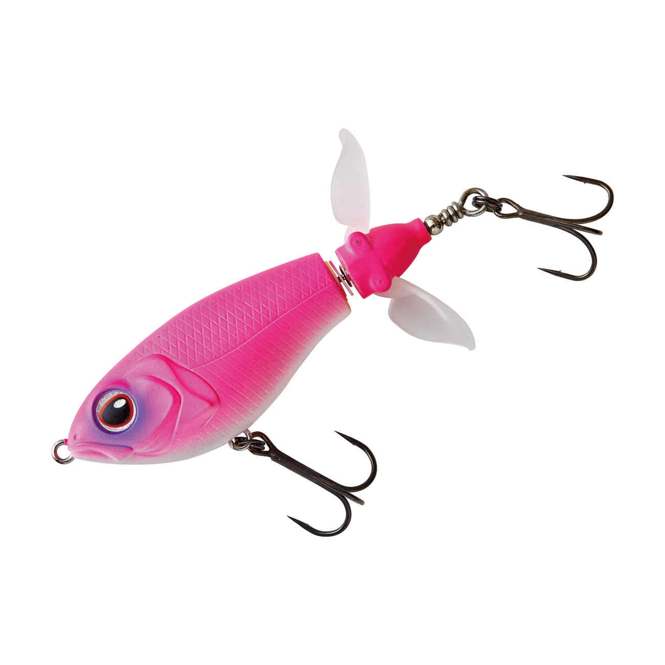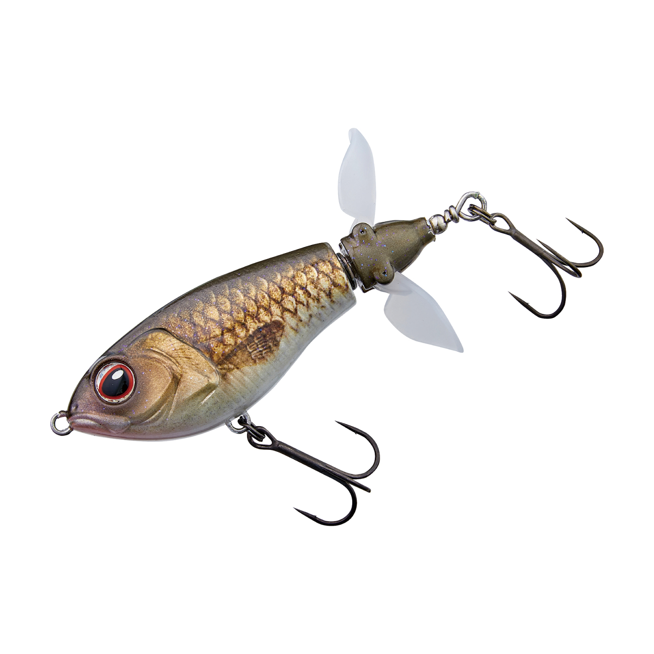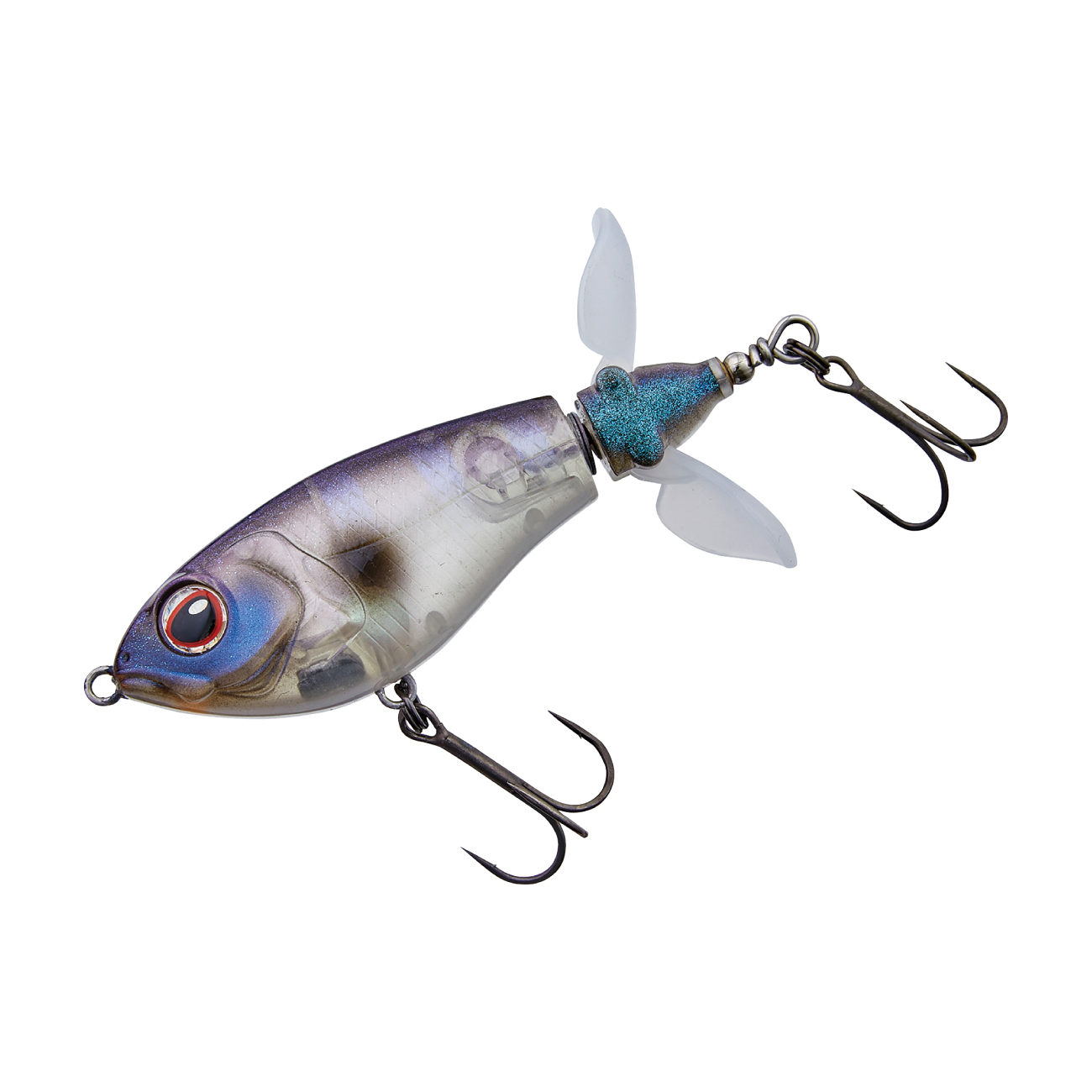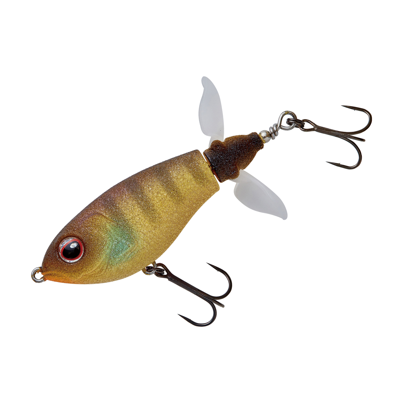 巨大なウイングを持つこの手のルアーには「飛距離が出にくい」という弱点がありました。その弱点を克服するために搭載されたのが、開閉式ウイングです。キャスト時にはウイングが閉じ、空気抵抗を減らす事で飛距離が安定し、着水と同時にウイングが開く事でレスポンスが落ちる事もありません。中型のウイングが2枚付いたプロップは低速リトリーブでもスムーズに回転し、高速リトリーブでもボディが傾く事なく、安定したリトリーブが可能です。また、ストップ&ゴー、リッピングなどの使い方も有効です。プロップが水を噛む淡いバブル音と、ボディとの間に仕込まれた2枚のワッシャーが出す金属音の複合サウンドがバスを強烈に刺激します。