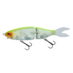 ため池、小規模河川、ビッグレイクのピンスポット…サーチベイトとしてのルアーでは無く、これらのエリアを攻め切るルアーとして導き出した答え。それが、ラフィン。ハイプレッシャー化するフィールドで、バスの本能を刺激し続けるビッグベイト。その威力と楽しさを、誰もが体感できるルアーに仕上げました。テールを含まないボディーのサイズは、小規模フィールドでもバスにプレッシャーを与え過ぎず、本能を刺激する13cmクラス。バスのストライクゾーンを攻め続ける為の、小刻みな水中ドッグウォークを可能にするシングルパーツのジョイント方式は、前後のボディーを捻る様なアクションも演出できます。また、強度を保つために採用した極太の金属パーツは、金属同士が擦れるスクイーク音を発生させ、バスにアピールします。僅かな水噛みを生むショートリップは、ジョイントの可動域を大きくした事によるアクションの破綻を防ぎ、スムーズな連続アクションを可能にしています。変形や破損のリスクを減少させるシリコン素材のテールは、適度な水押しを出す張りがあり、僅かな水流でも揺らめくアクションを演出します。独自のテール形状は、ラフィンの多彩なアクションを可能にする為の形状を導き出しました。