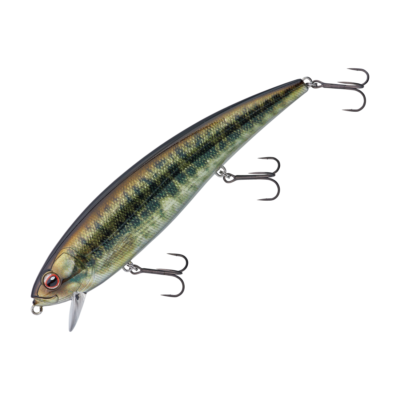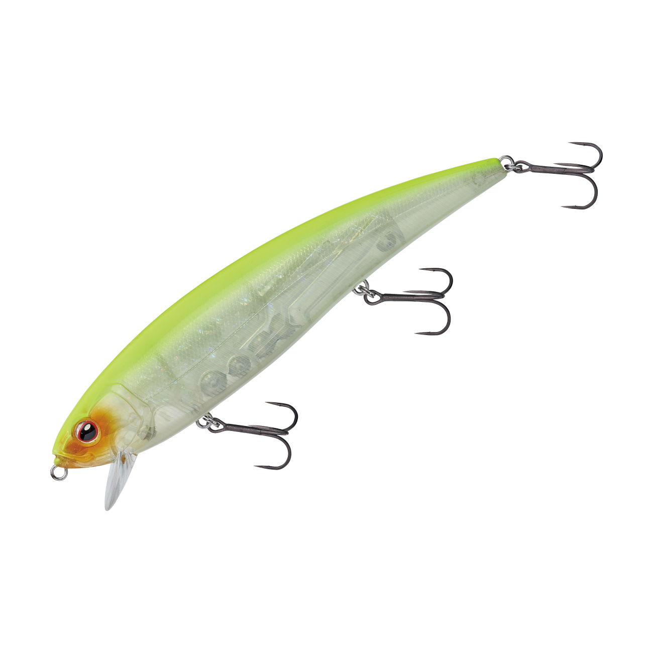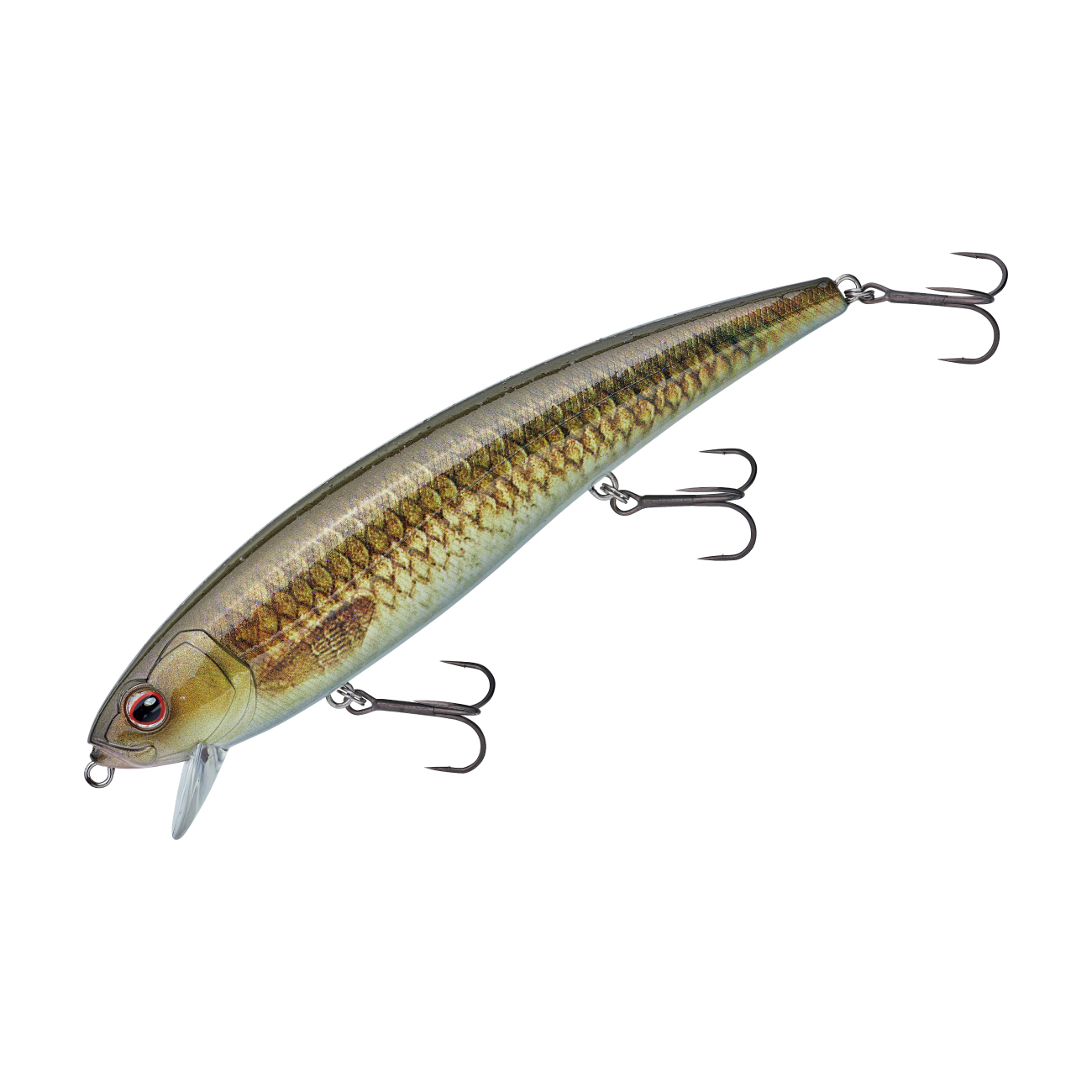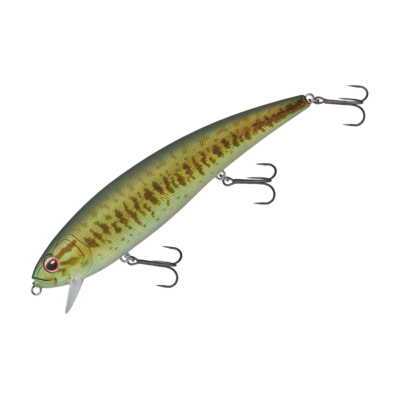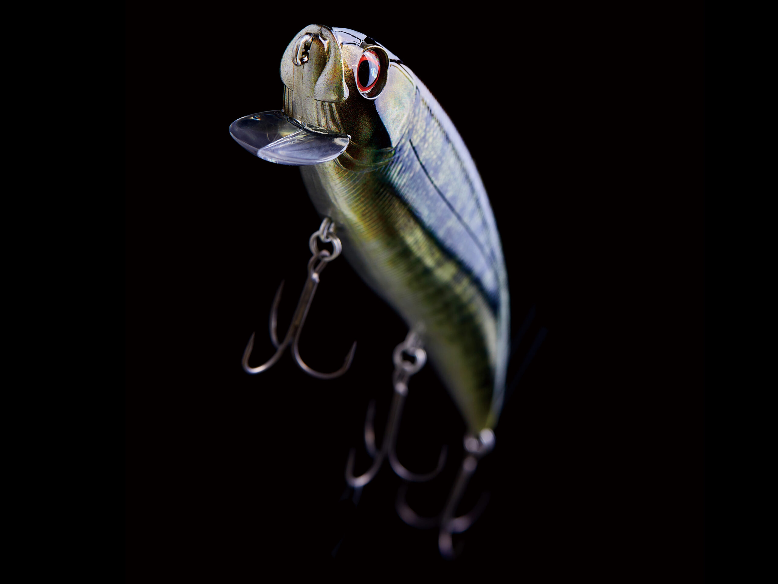 このルアーの最大の特徴は、170mmというそのボディーサイズに折り込んだ計算し尽されたアクション。バスを水面下まで誘いあげるための水押しを生み出すロールを主体としながら、水を撹拌し魚へアピールするウォブルを絶妙なバランスで組み合わせたものです。水押しを強く意識したフラットサイド部と、テールの振りを向上させるラウンドボディー部を上手く融合させたボディー形状はバスの本能を刺激する水押しでバイトを誘発します。着水直後から機敏に反応する泳ぎだしの良さで、スローリトリーブからファストリトリーブまで対応するビッグミノーに仕上げました。シャローエリアや、ウィードと水面の隙間をリトリーブできるように潜行レンジを1m以下に設定しました。大型のウエイトボール内蔵の重心移動システムと空気抵抗の少ないボディー形状で、広い範囲をサーチするための飛距離性能を備えています。170mmクラスのミノーとは思えないレスポンスの高さと、大きさが生み出すインパクトでタフな状況を覆すビッグミノーゲームを体感してください。