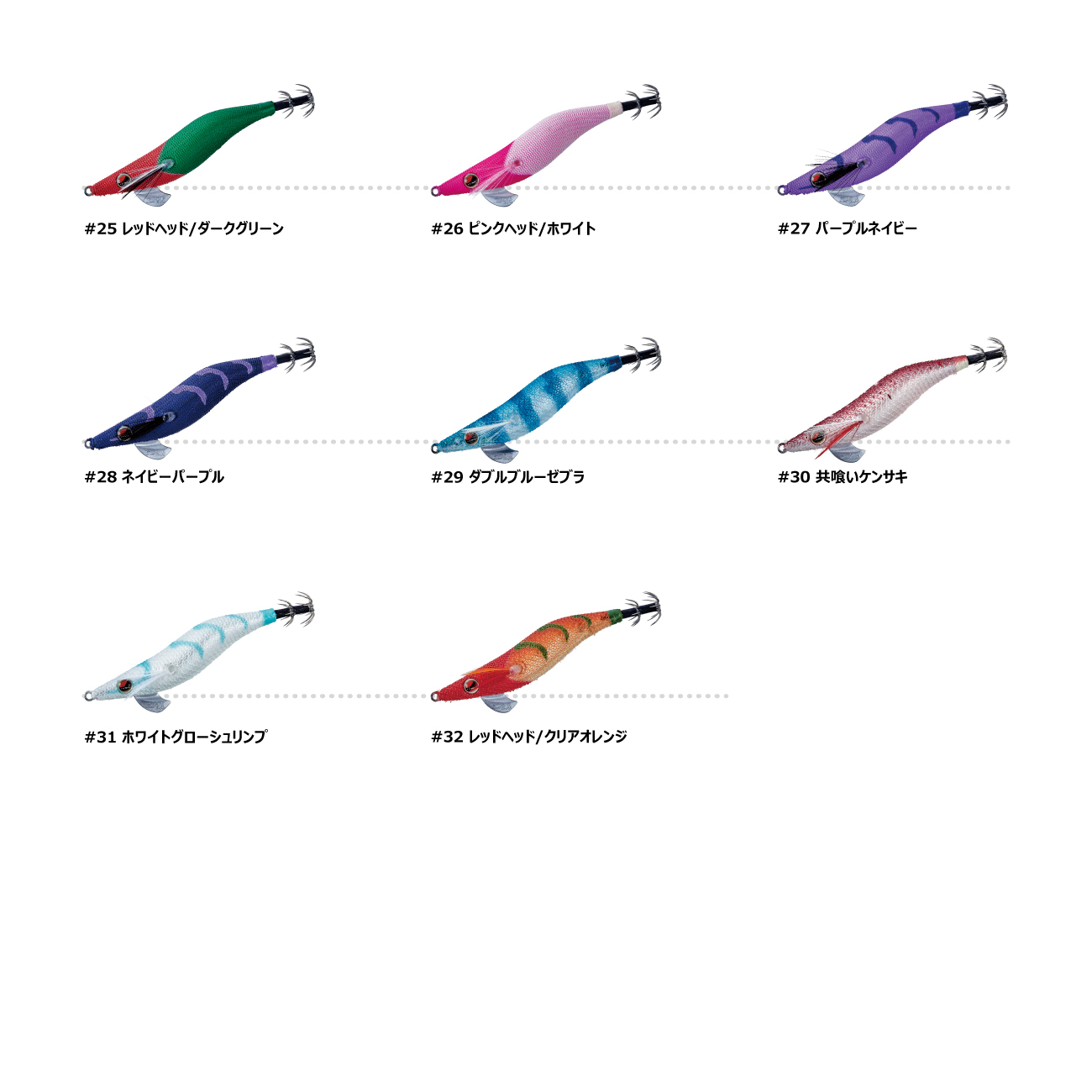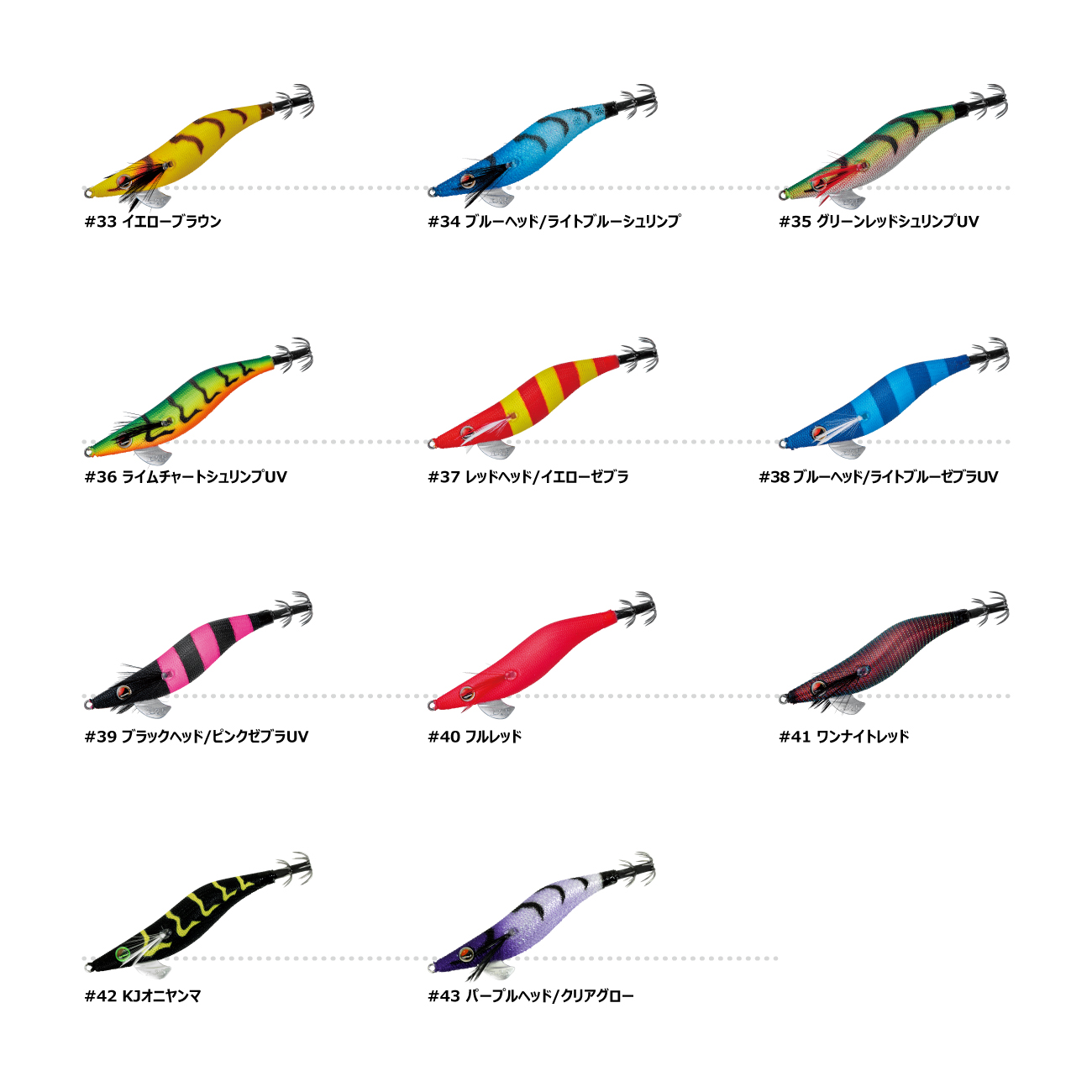 #1 レッドヘッド/グリーン#2 レッドヘッド/チャート#3 フルピンク/オレンジベリー#4 レッドヘッド/ケイムラ#5 レッドヘッド/ディープレッド#6 ブラック/グロー#10 ブラックヘッド/パープルUVゼブラ#12 レッドヘッド/赤エビゼブラ#13 ブラック/オレンジゼブラ#14 ピンクヘッド/ゼブラグロー#17 ディープレッド/ブラック#18 ピンクヘッド/ケイムラゼブラ#19 ゴールデンアジ#22 フルオレンジUV#24 ダブルピンクゼブラ#25 レッドヘッド/ダークグリーン#26 ピンクヘッド/ホワイト#27 パープルネイビー#28 ネイビーパープル#29 ダブルブルーゼブラ#30 共喰いケンサキ#31 ホワイトグローシュリンプ#32 レッドヘッド/クリアオレンジ#33 イエローブラウン#34 ブルーヘッド/ライトブルーシュリンプ#35 グリーンレッドシュリンプUV#36 ライムチャートシュリンプUV#37 レッドヘッド/イエローゼブラ#38 ブルーヘッド/ライトブルーゼブラUV#39 ブラックヘッド/ピンクゼブラUV#40 フルレッド#41 ワンナイトレッド#42 KJオニヤンマ#43 パープルヘッド/クリアグロー#44 共喰いムギイカ#45 グリーンヘッドパーチ#46 グリーンチャートゼブラ#47 メタリックレッドグリーンゼブラ#48 オキアミゼブラ