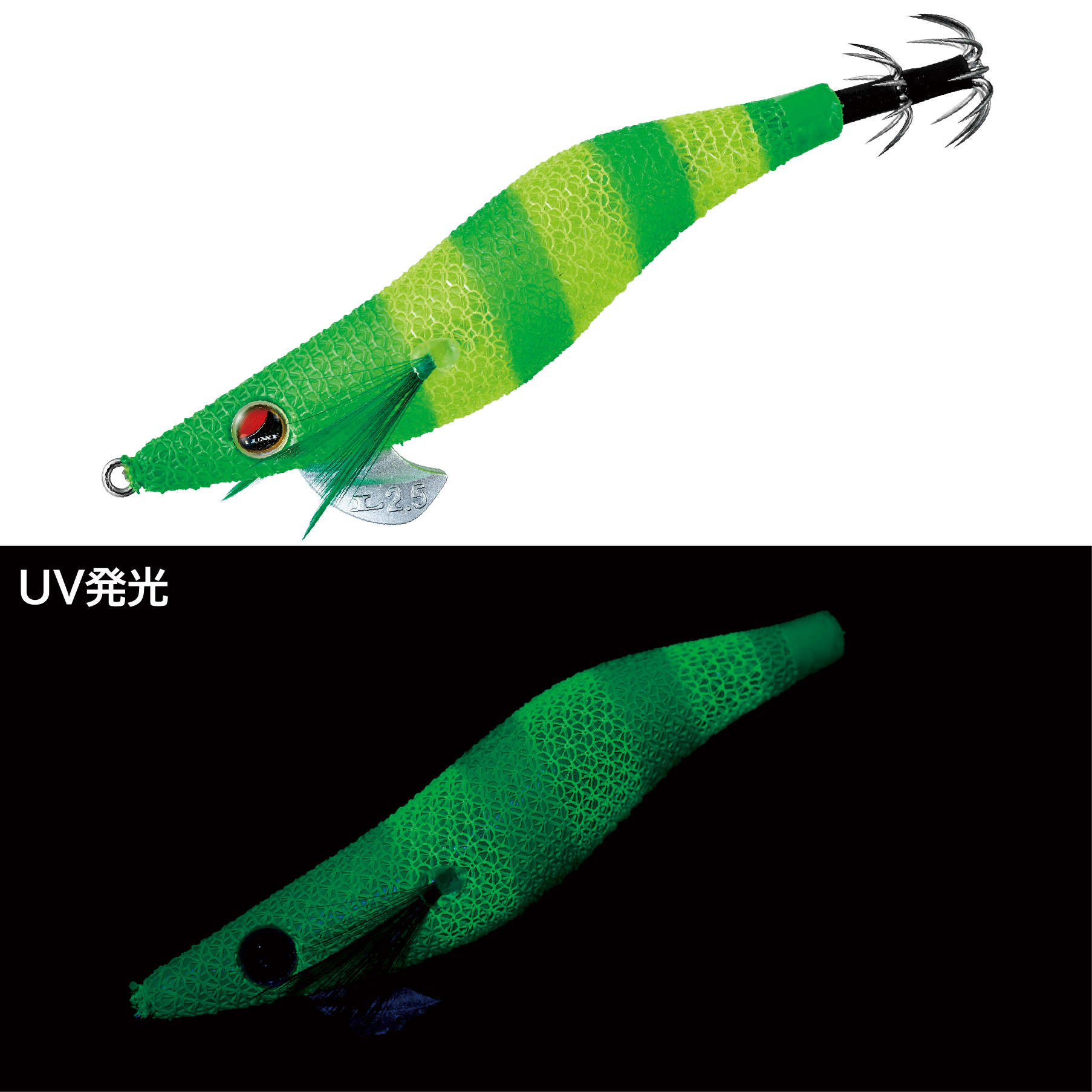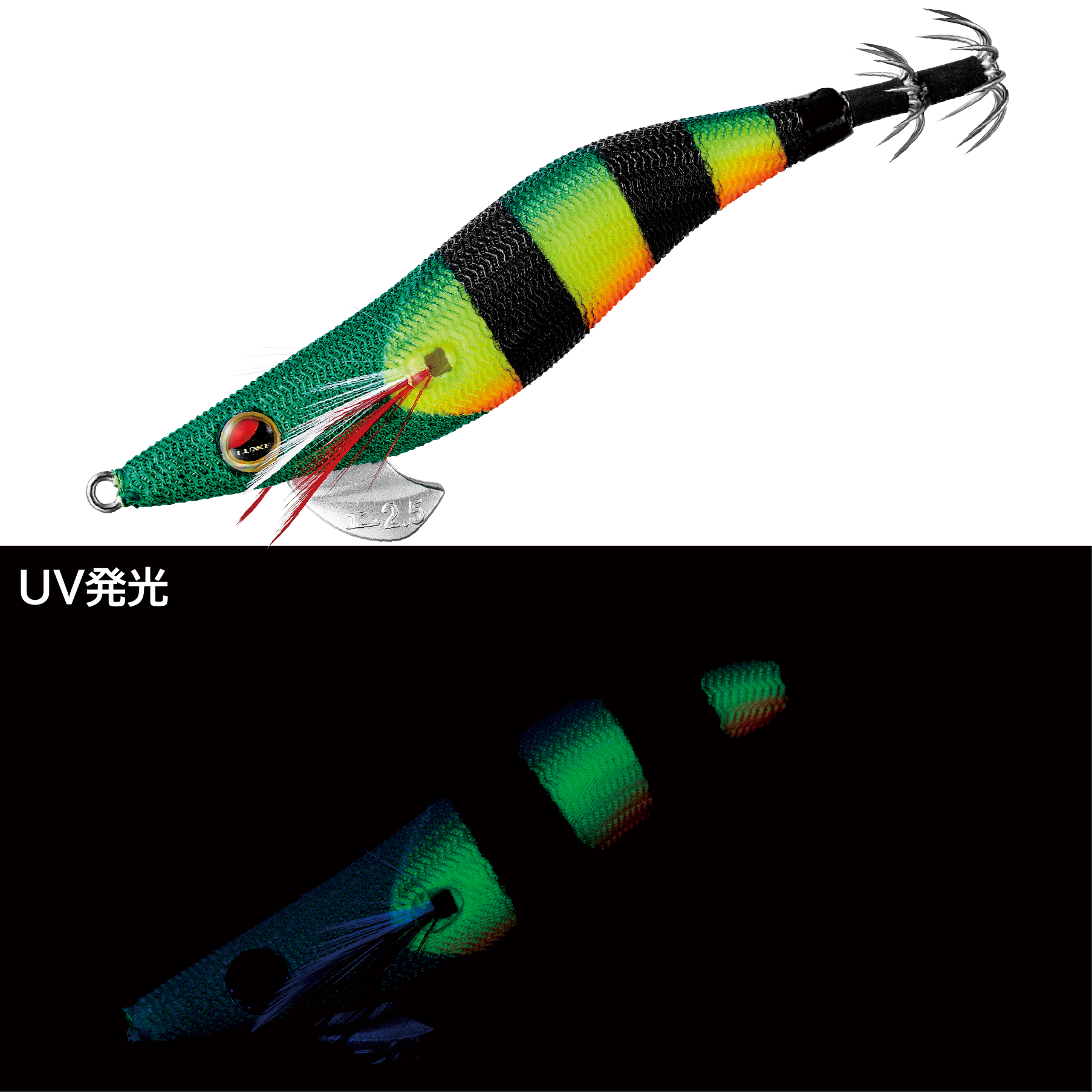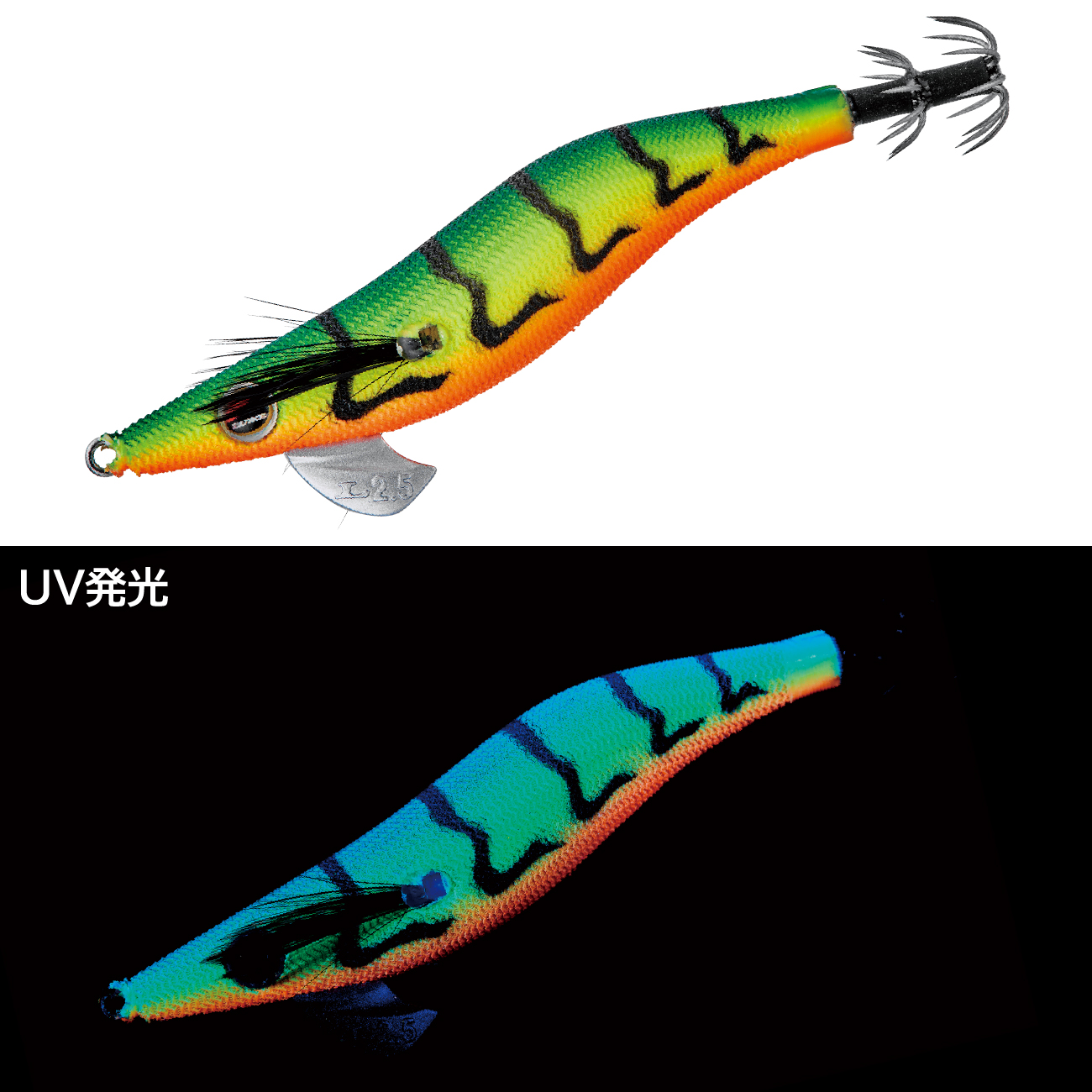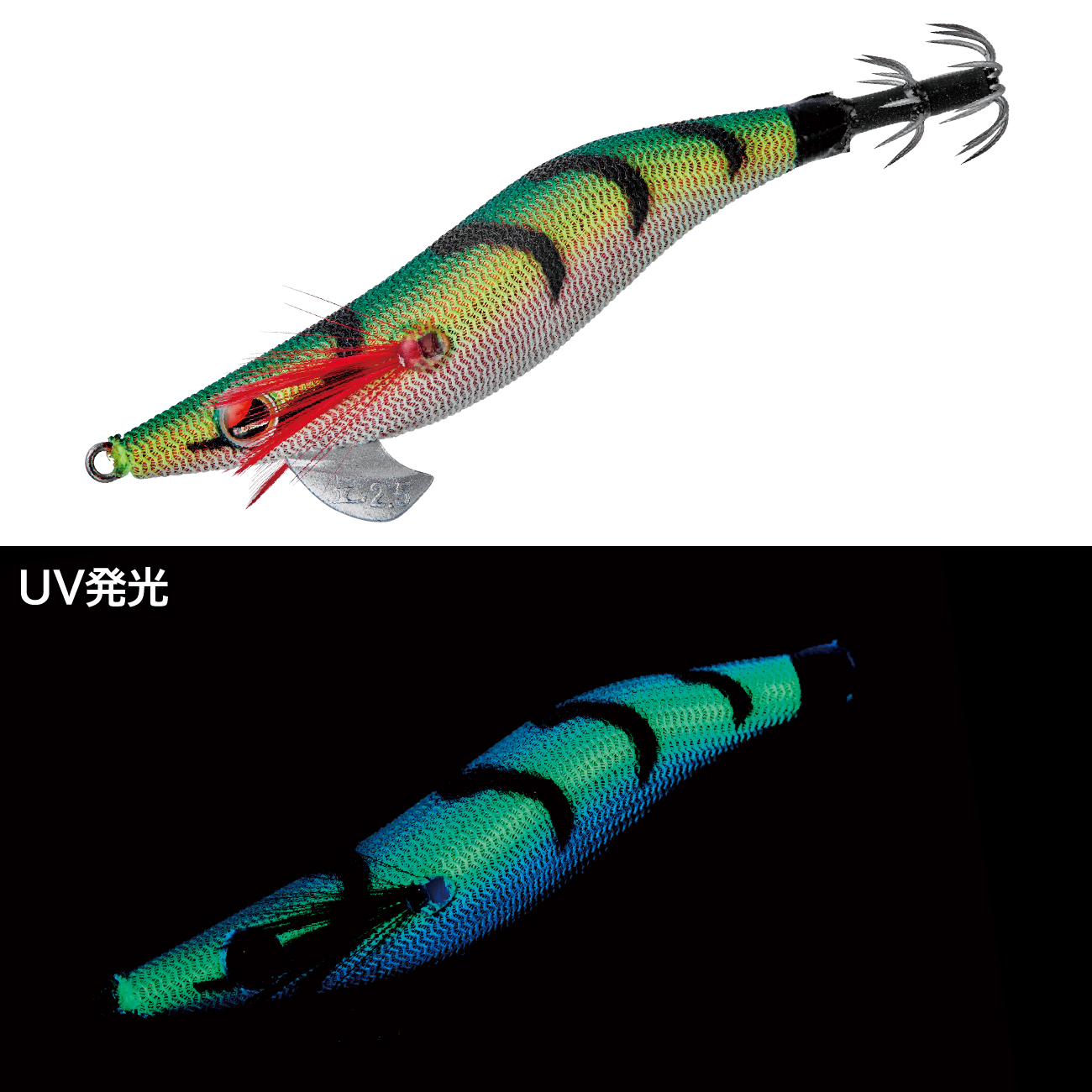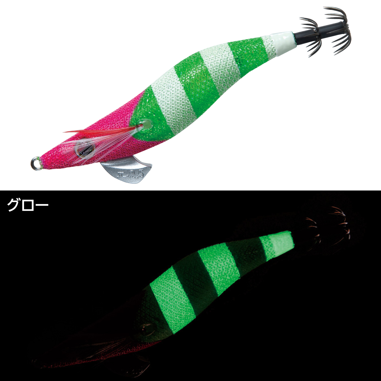 高実績カラーである「グリーンヘッド/チャート」を明滅効果の高いゼブラパターンにブラッシュアップ!ラインナップ内でも屈指のハイアピールカラーとなり、イカの反応が速い高活性時やテンポの速いリアクション系のパターン時に最適です。