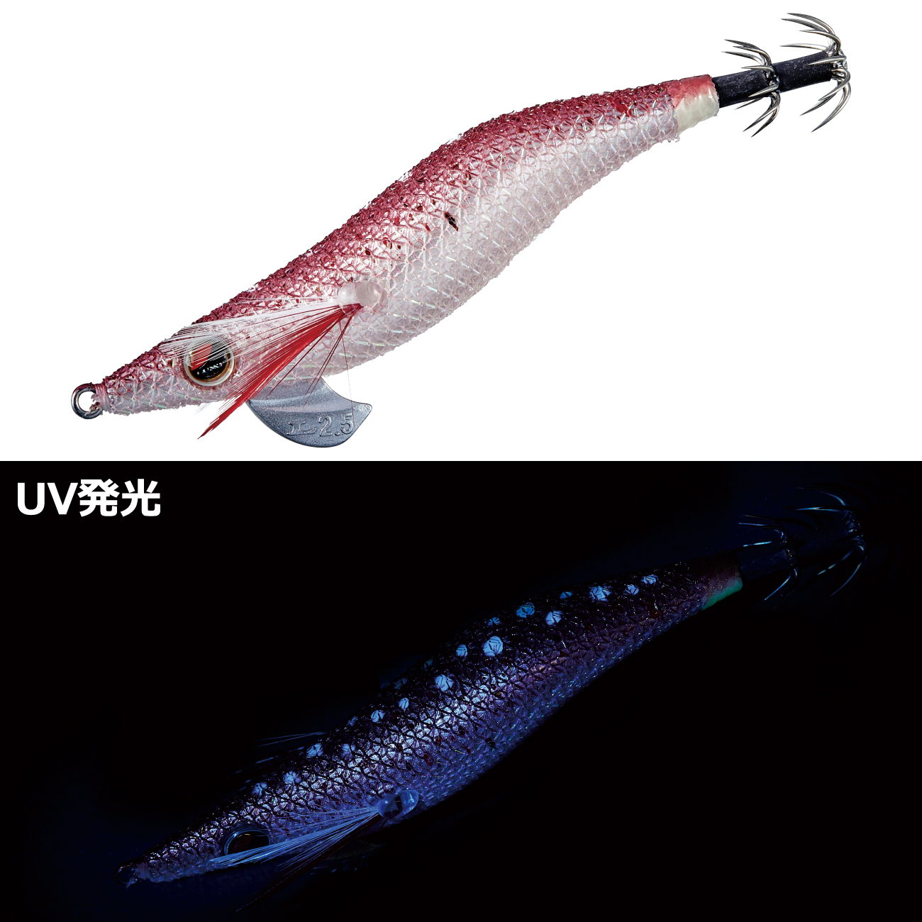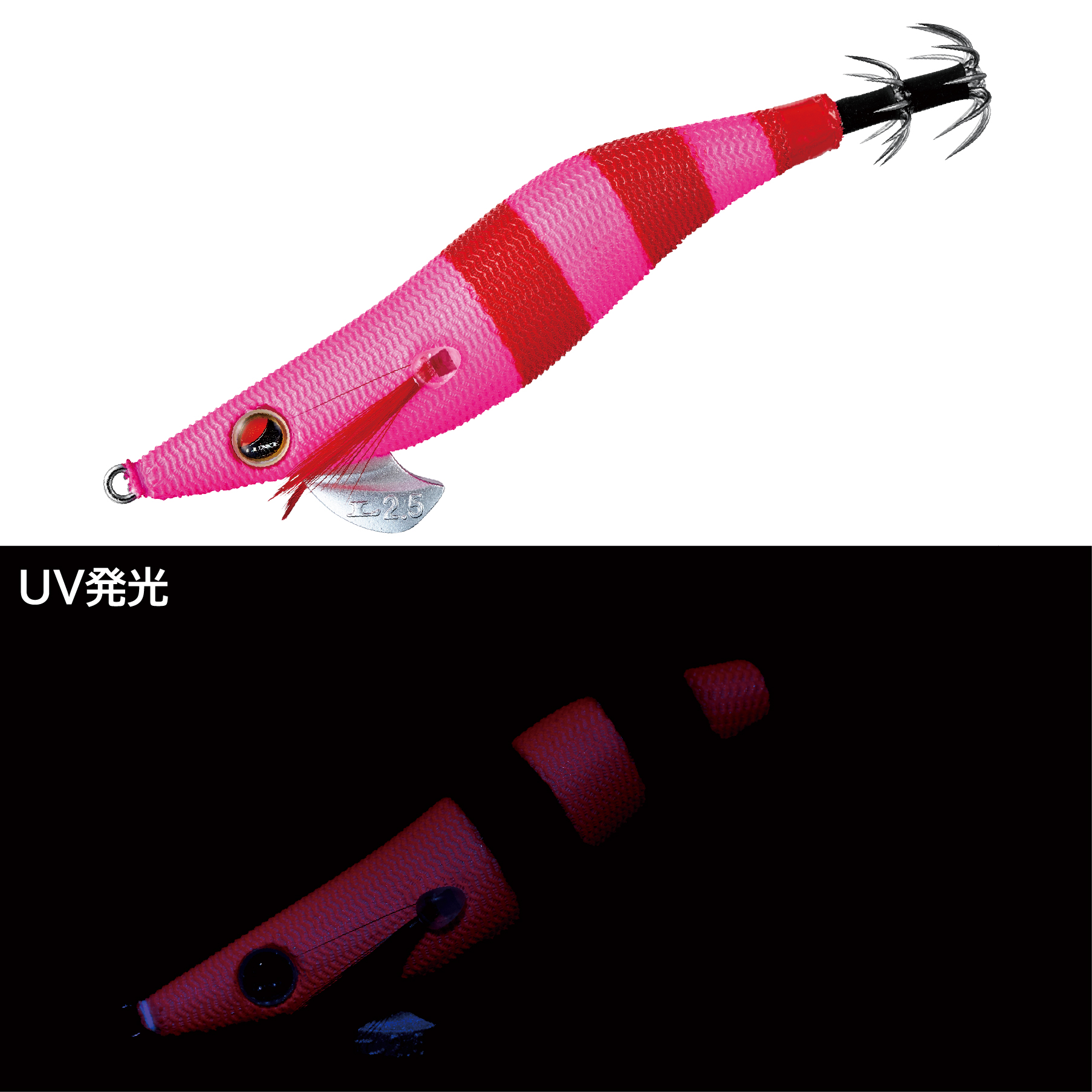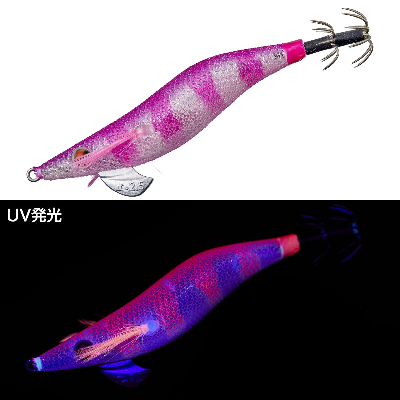 テスト実績No.1のオススメカラー。深ダナではUVピンク部がイカにアピール、浅ダナではブラック部がイカにアピールする2面性を持つマルチアピールカラーです。
