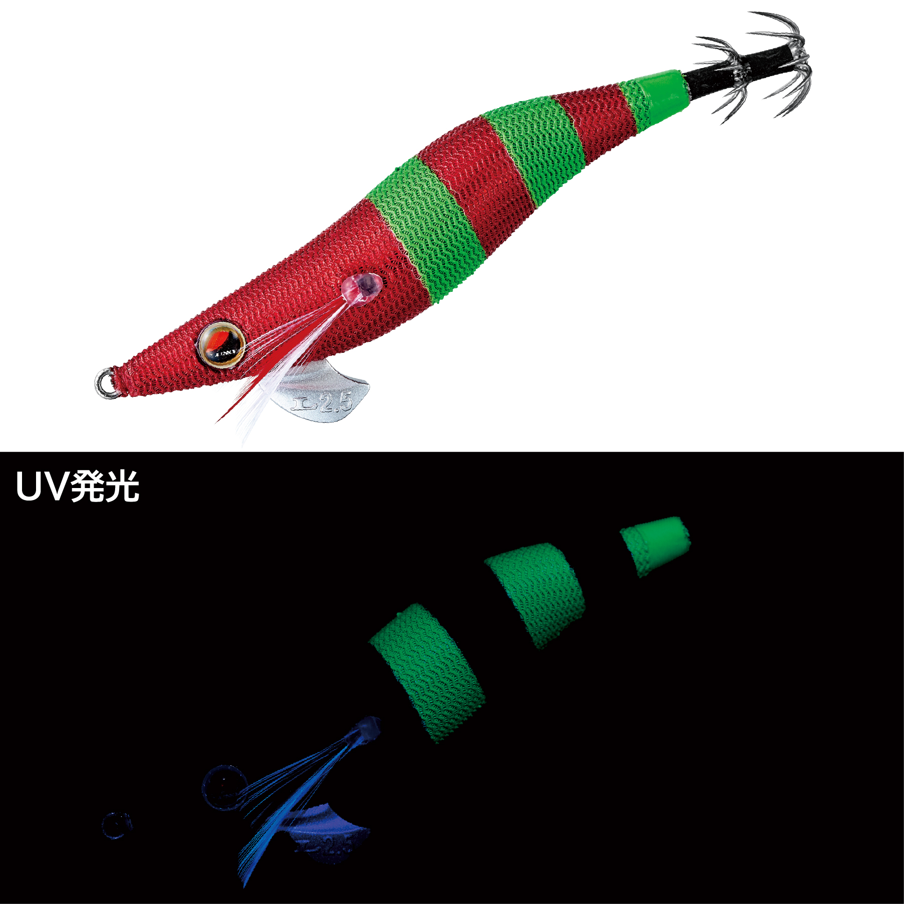 ベースのメタリックレッドボディに、角度により色の変わる特殊布を採用したスペシャルカラー。他にはない色合いがイカを狂わせます。ブラック系に高反応を示す際のカラーローテーションにも最適です。