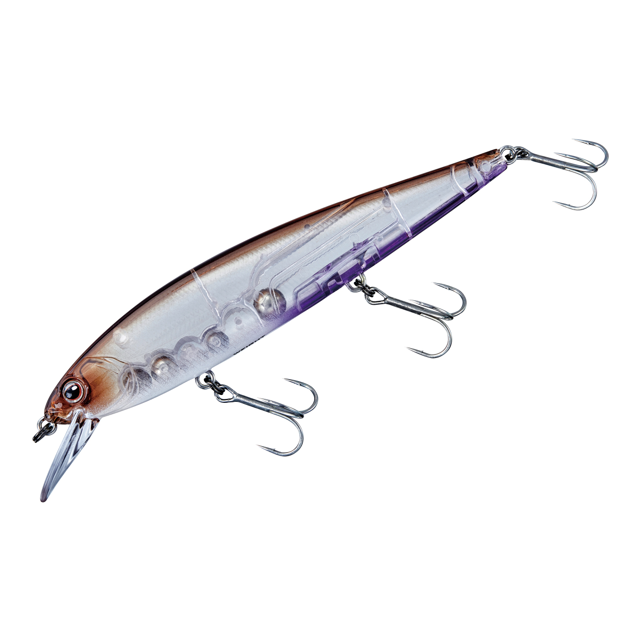 リトリーブアクションとジャークアクションを高次元で両立したい。そんなコンセプトで開発がスタートしたアベンジミノー 110Fは、相反するアクションの両立を実現しました。2つのアクションを高次元で発揮させるキモとなったのが、ルアーの姿勢でした。浮き姿勢を水平に近づけるため、背面には浮力のバランスを突きつめた空気室を設けました。これによって、浮上時にはシミーライズアクションを発生させ、バスを水面まで引き上げバイトさせます。フックは、ジャークベイト特有のじゃれつくようなバイトにも対応するため、トレブルRB-Mハイパーシールドを採用しています。