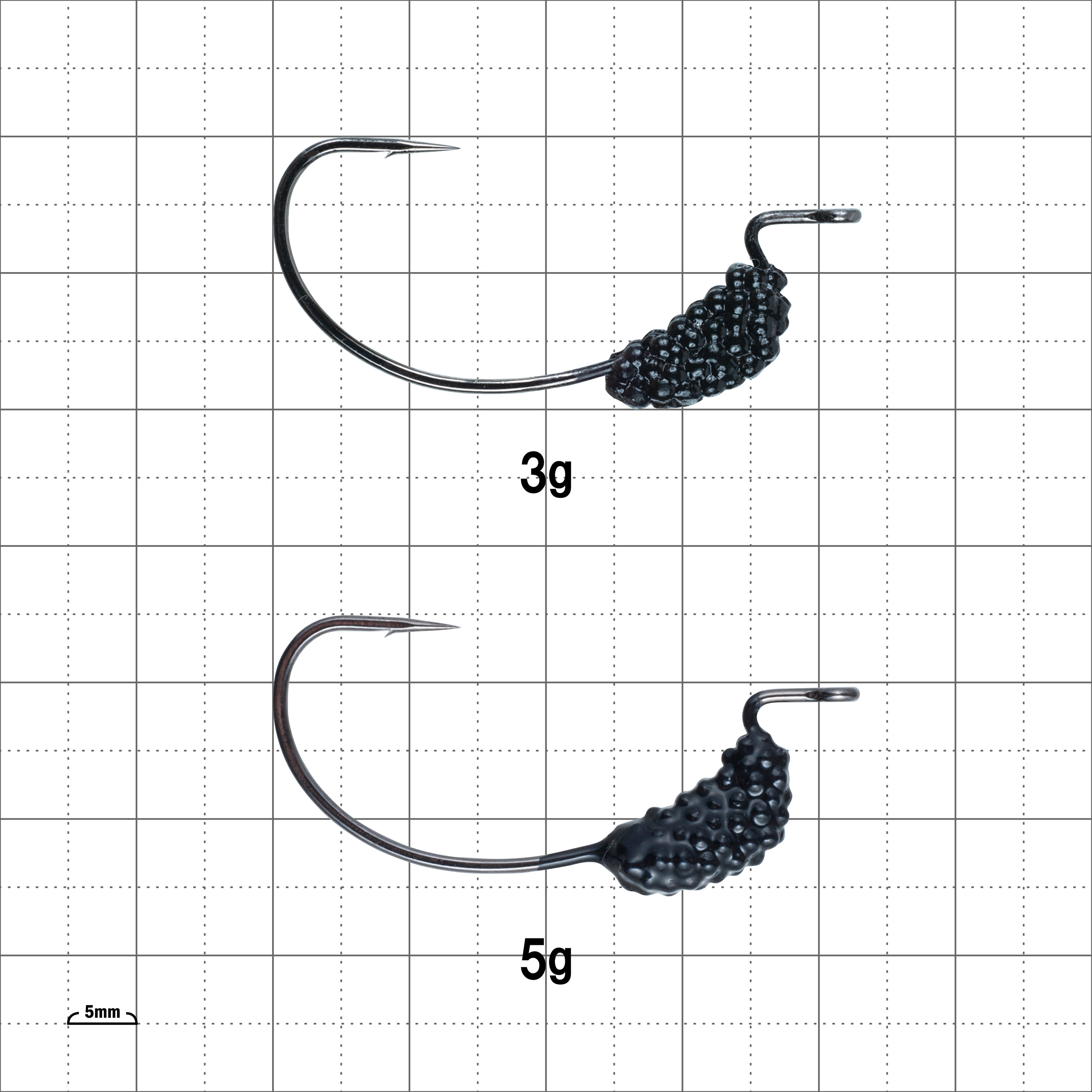 「ワーム321バルキースタイル」の2/0を使用したウェイテッドフック。「ほぼザリ 3インチ」に合わせて使用する事で、安定したフォール姿勢をキープ、ボトムではザリガニが手を上げた姿勢をキープ。4種類のウエイトサイズで、状況に応じた使い分けが可能。その他のワームにも対応可能。