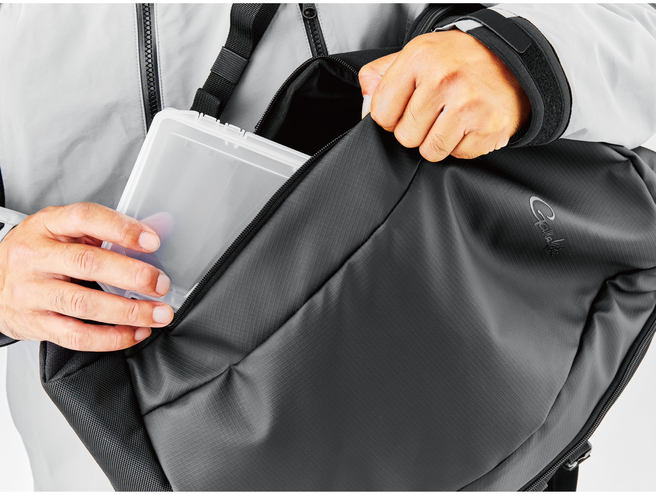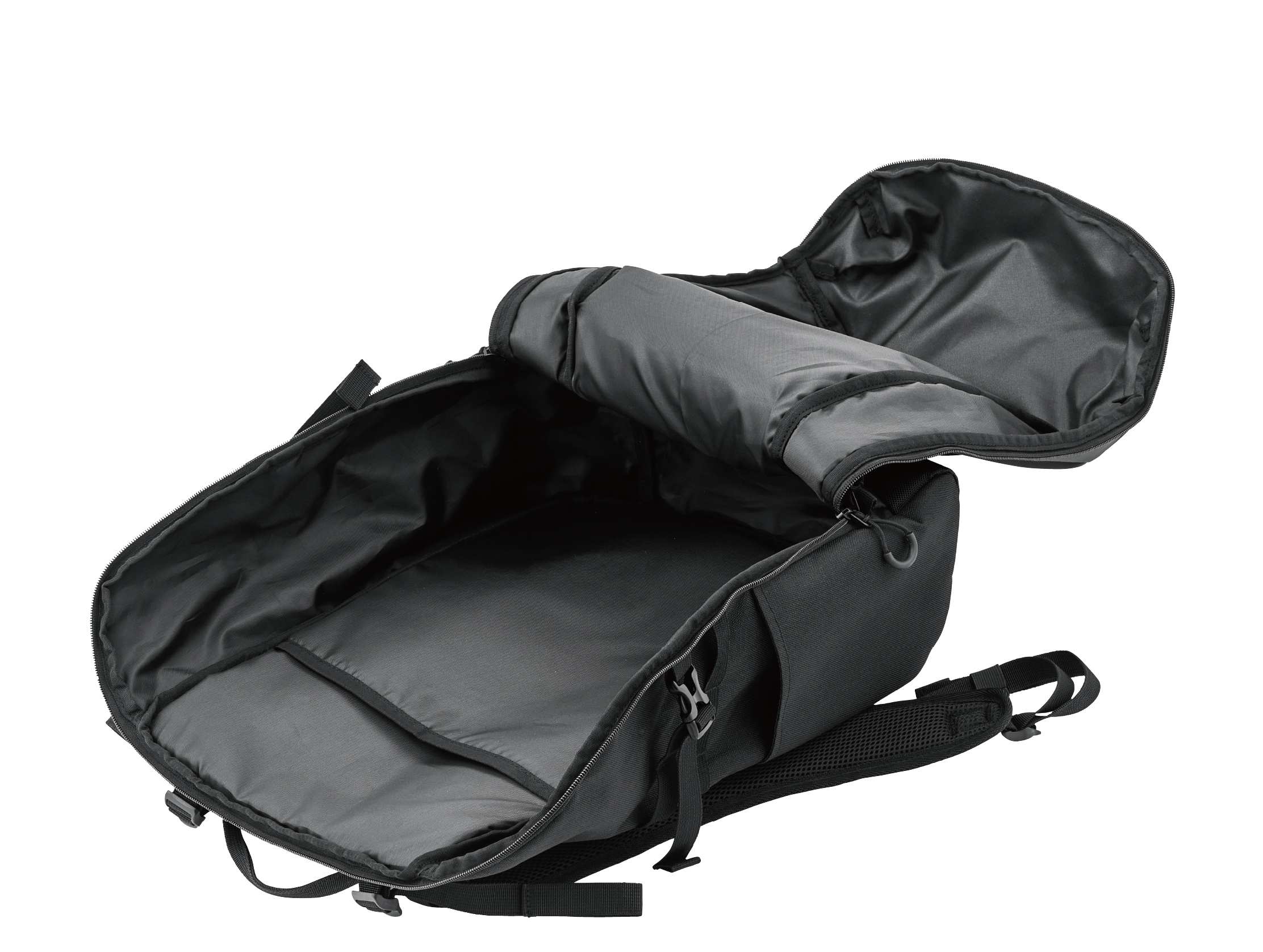 メインコンパートメントを大きく開いて最適な位置にアイテムの収納が可能。