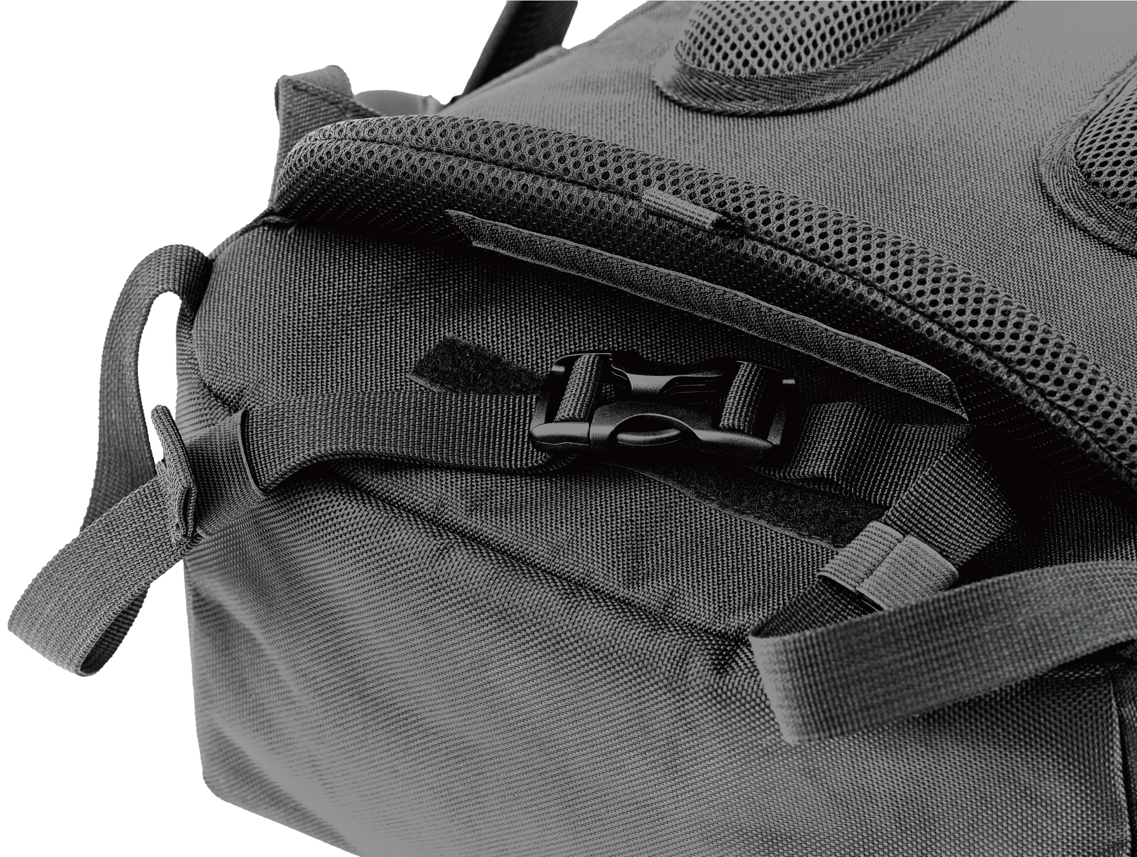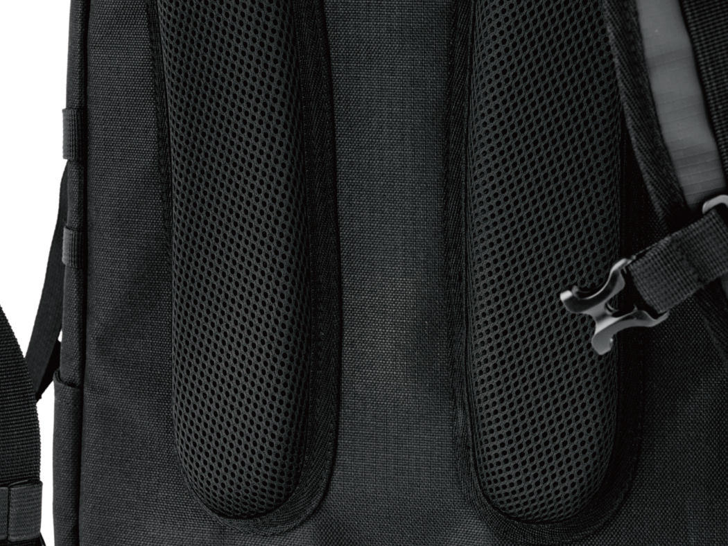 ●センタークッションを設けず、換気性とバッグ本体の横ブレを軽減する背面設計。