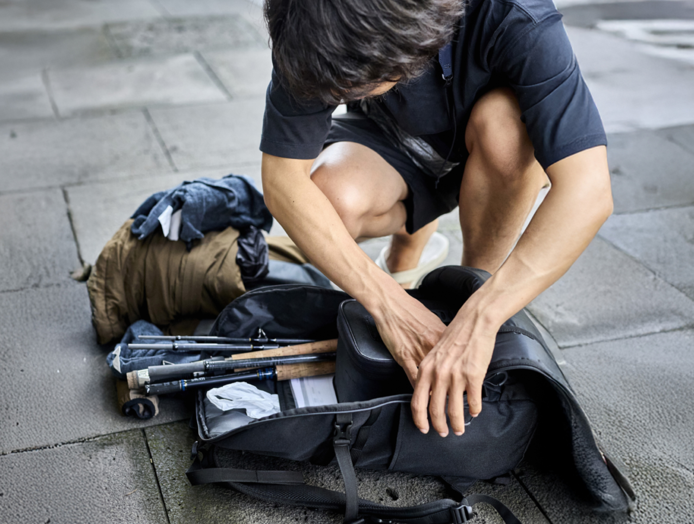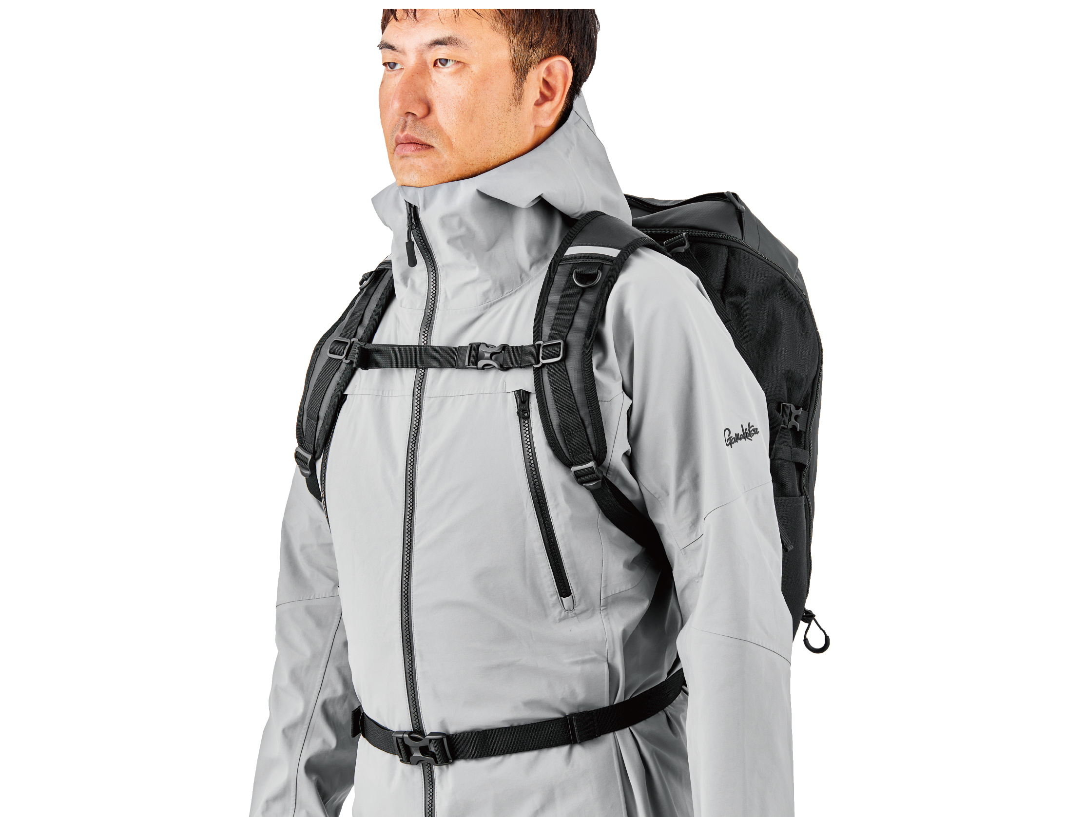 ●釣行時とタウンユース時で使い分けられる収納型ウエストハーネス。