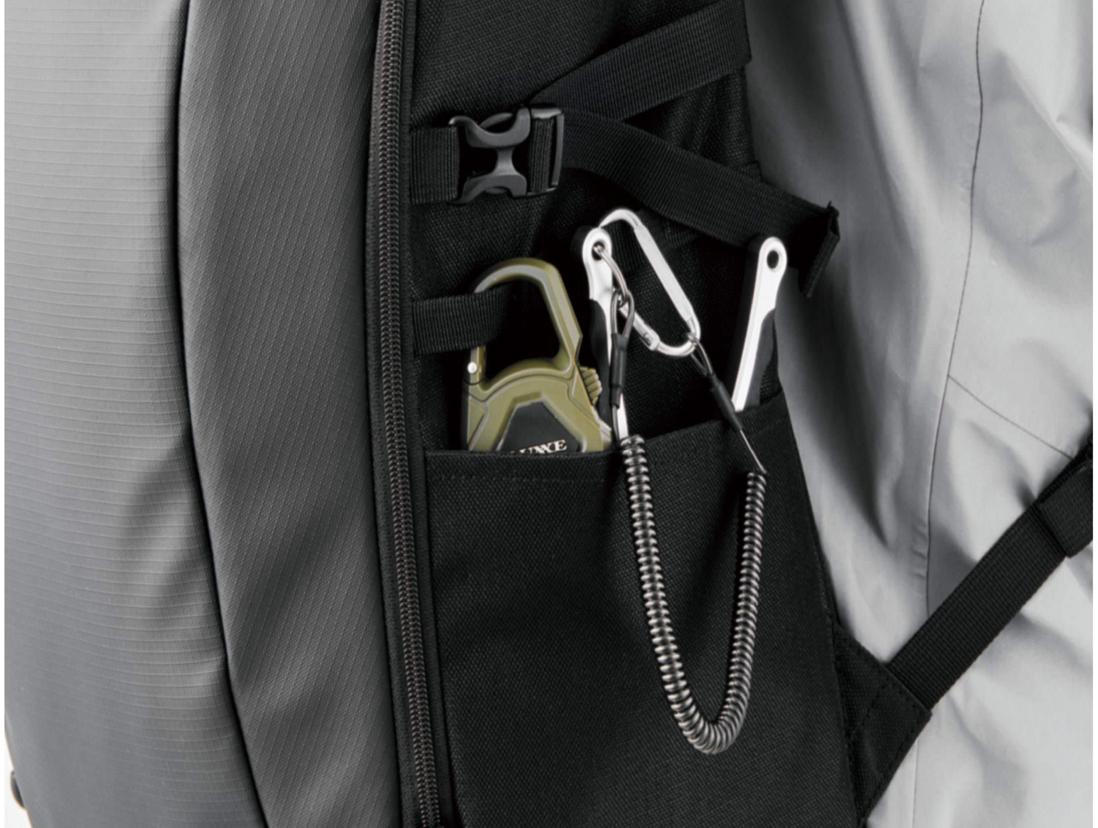 ●側面のデイジーチェーンにカラビナを付ければラインカッターやプライヤーなど収納可能なサイドポケット。
