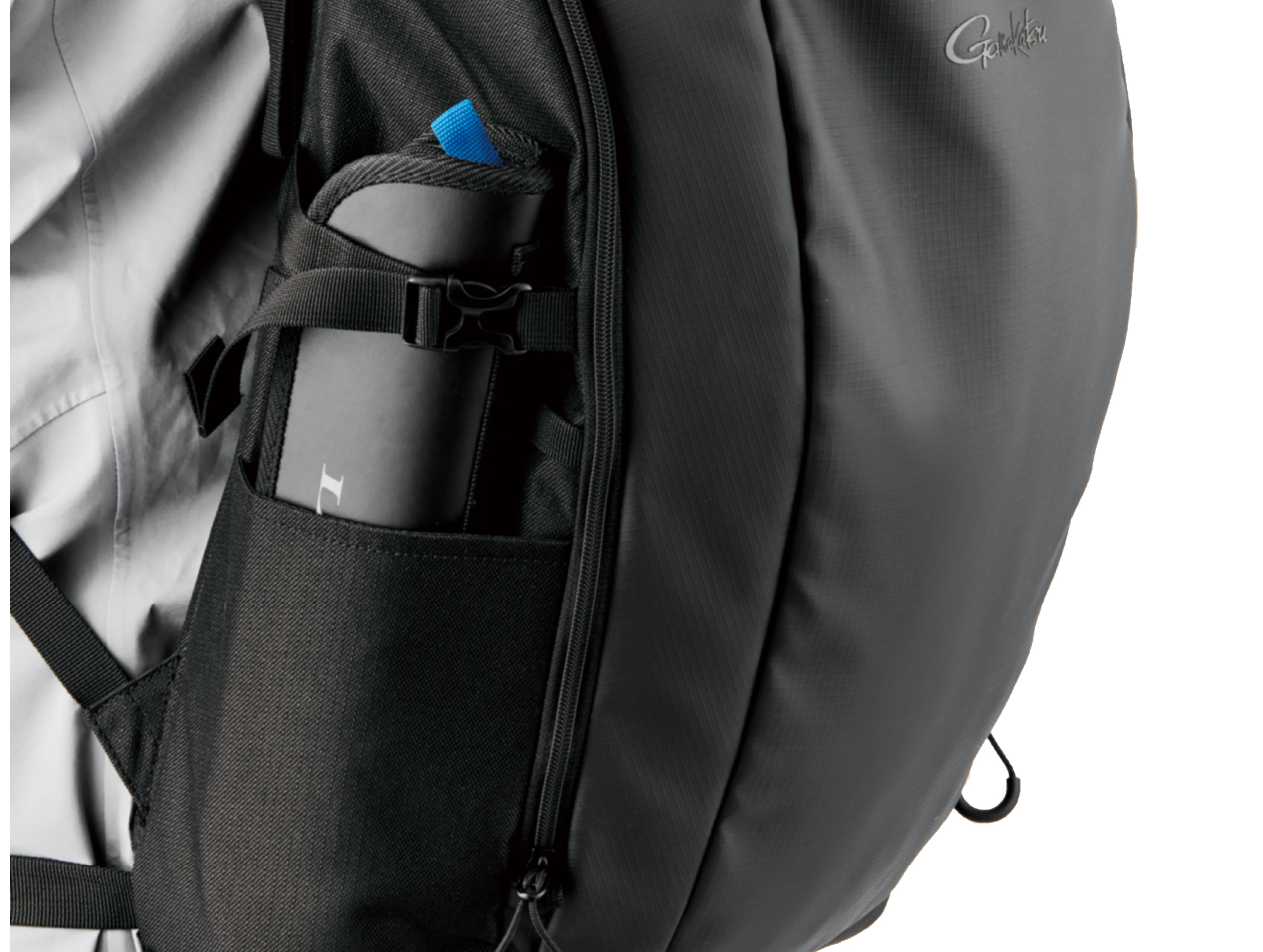 側面のデイジーチェーンにカラビナを付ければラインカッターやプライヤーなど収納可能なサイドポケット付。