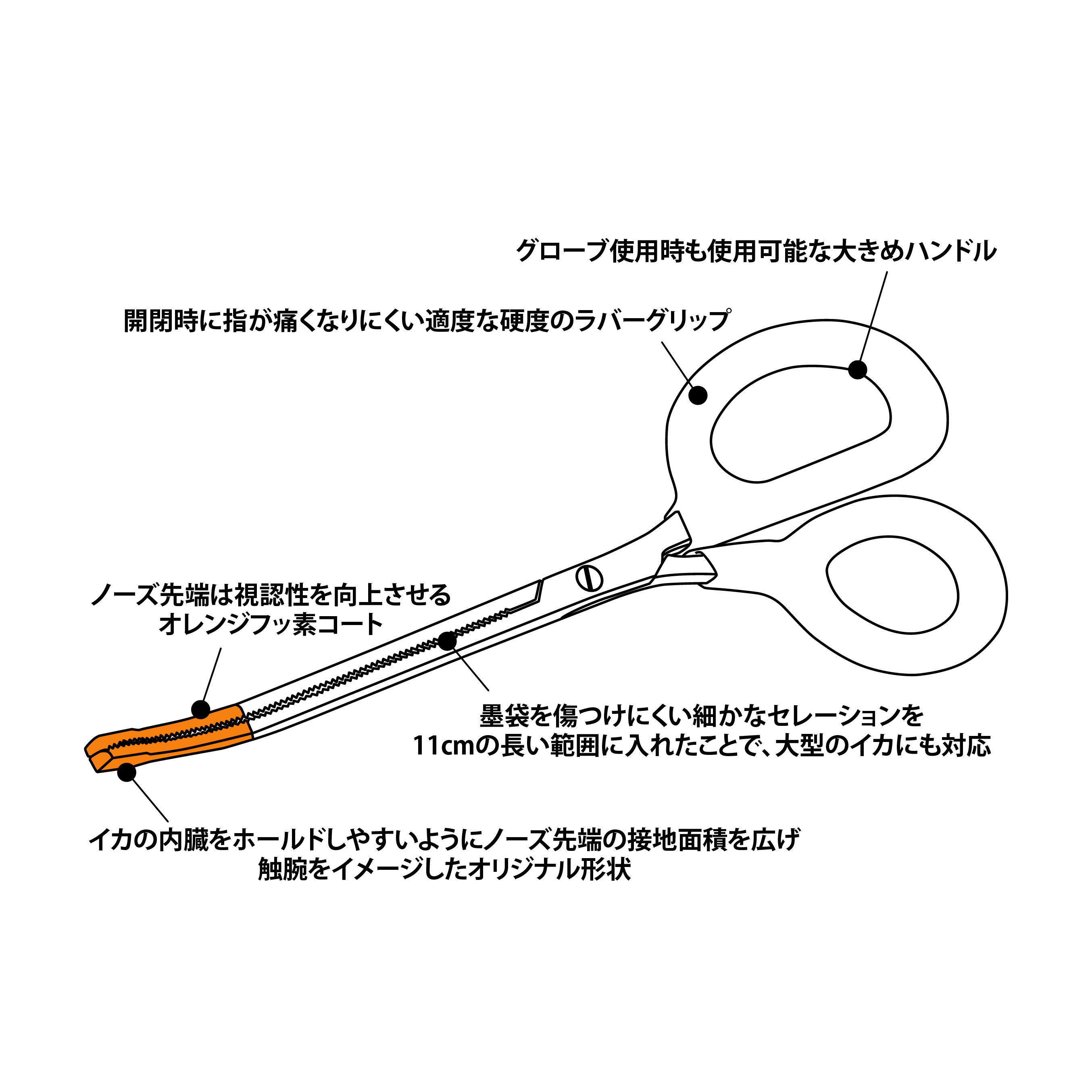 ●墨袋を傷つけにくい細かなセレーションを110mmの長い範囲に入れたことで、大型のイカにも対応。