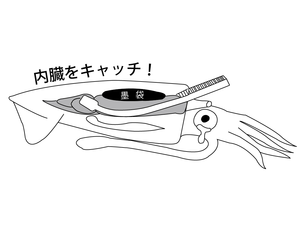 墨袋を挟まずに、墨袋の周りの内臓ごと引き抜く!