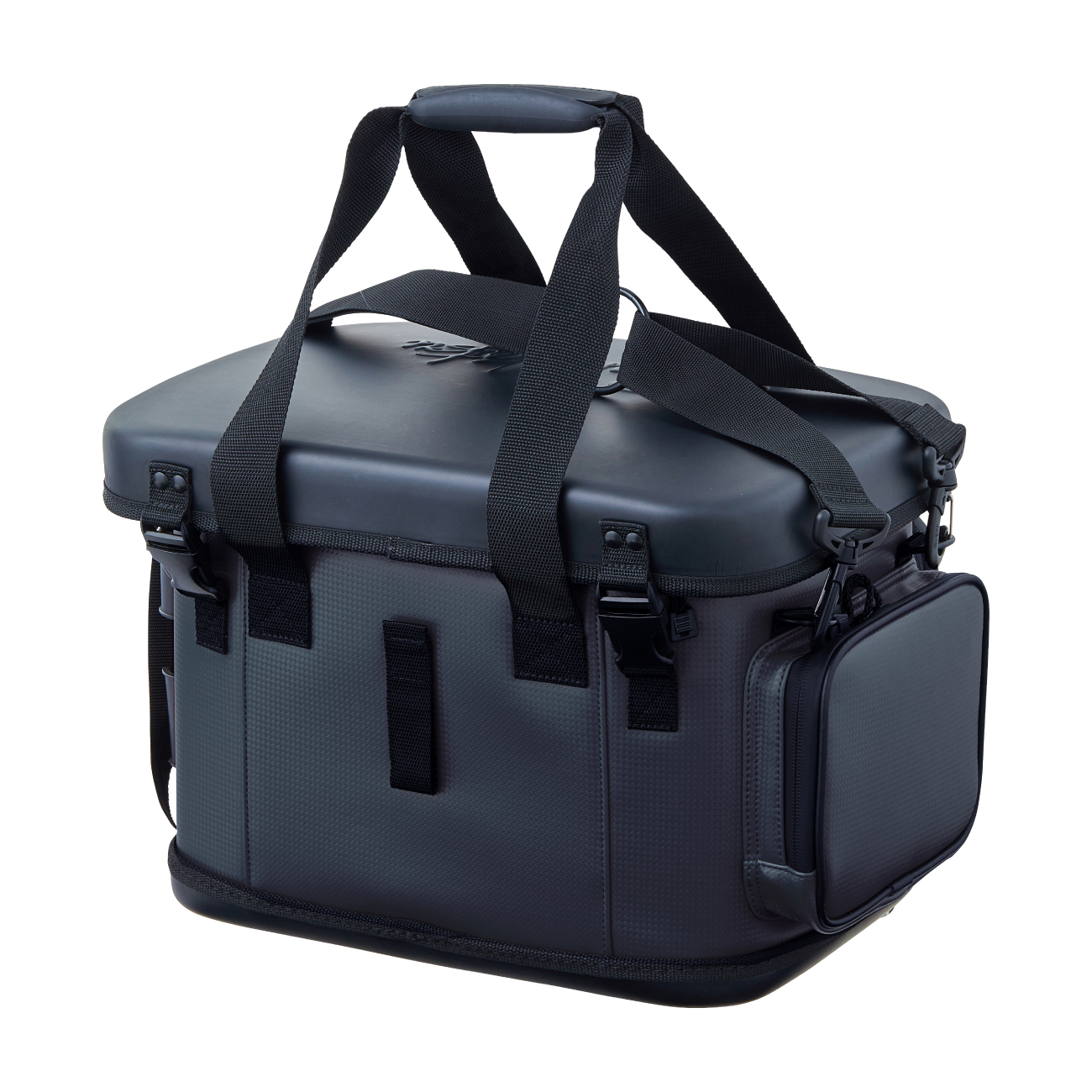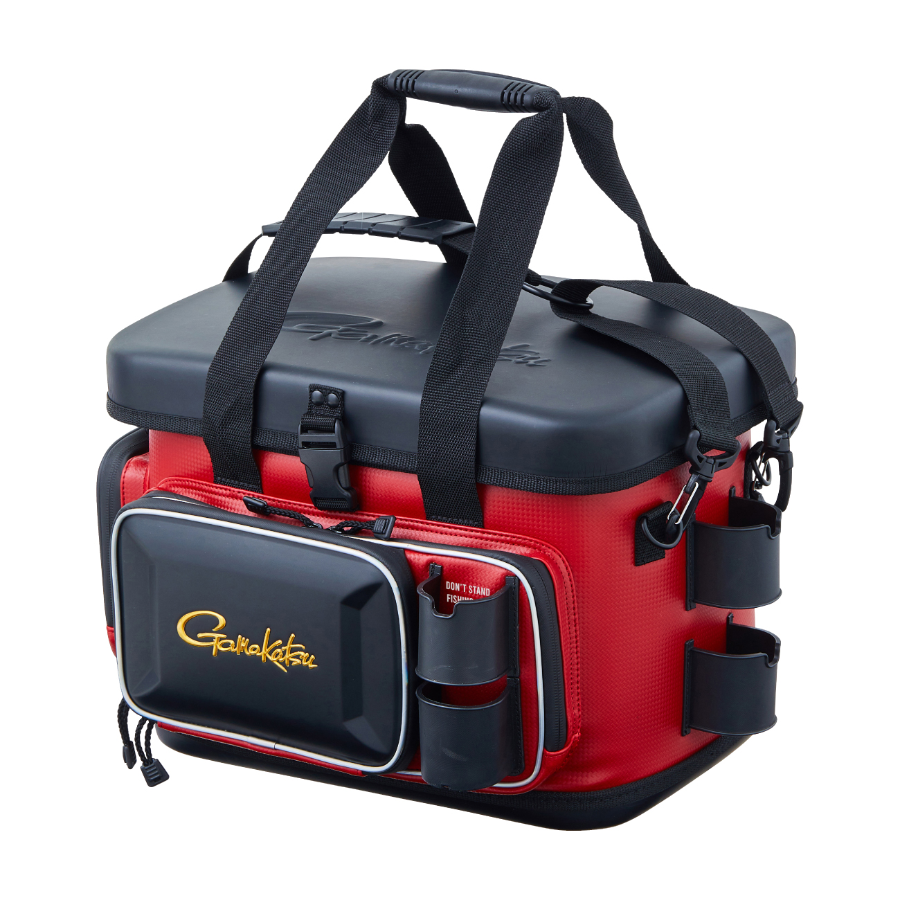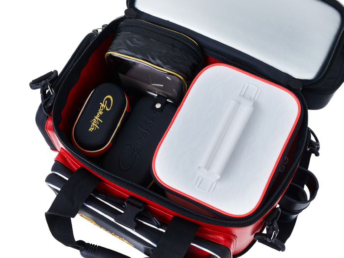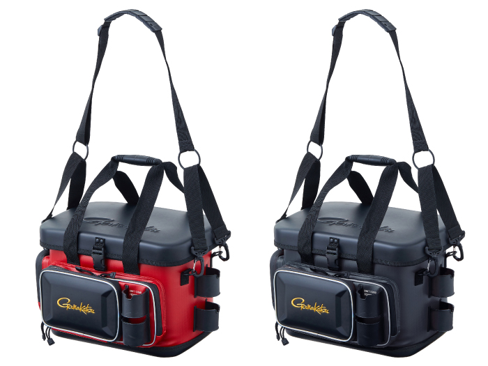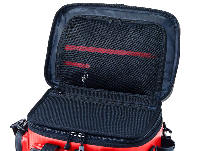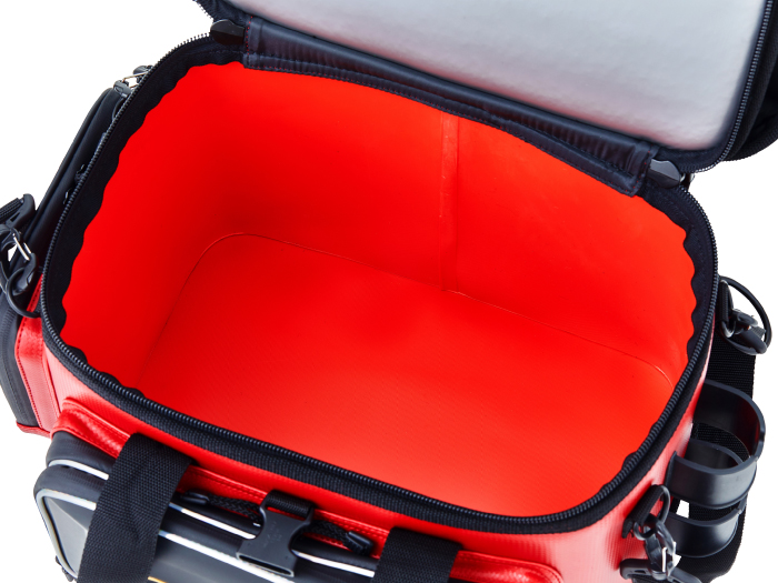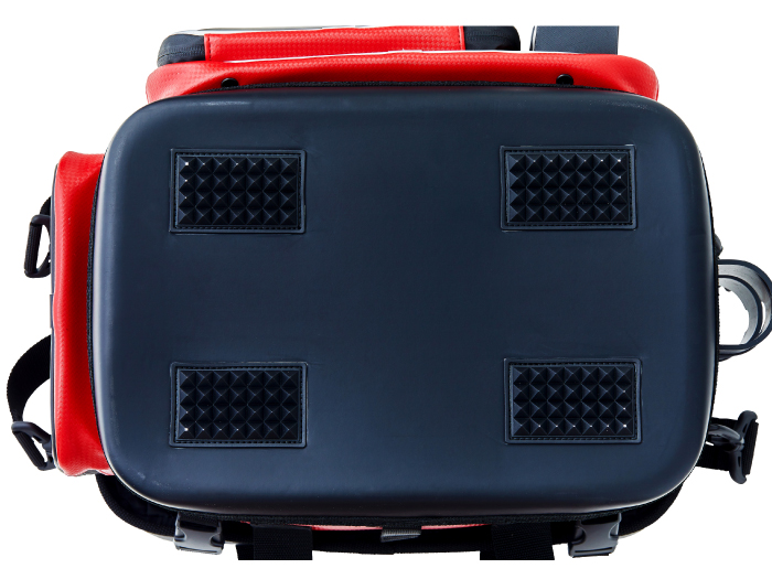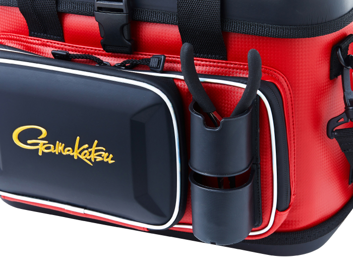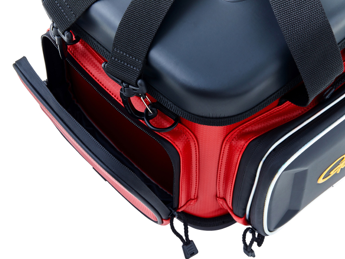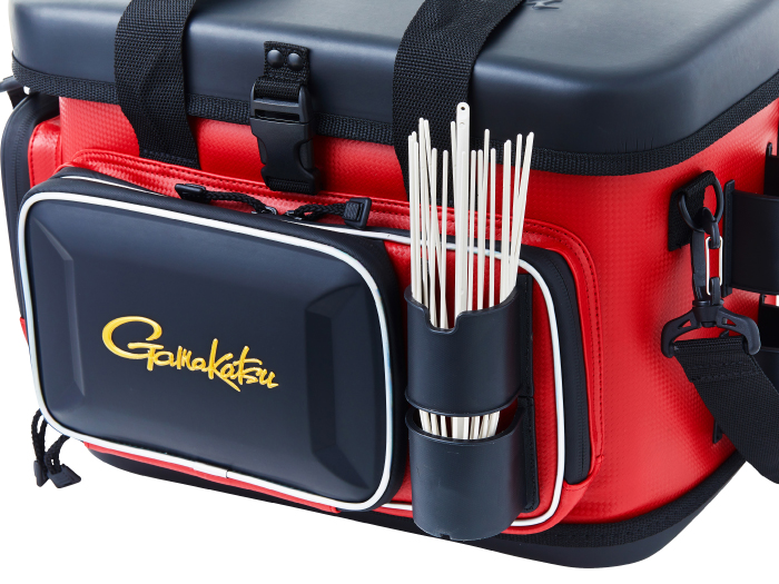 樹脂製インナーや硬質樹脂で成型した上蓋を採用することで、外部からの耐衝撃性を大幅にアップさせたタックルバッグ。フロントとサイドポケットにも成型パーツを使用しているので収容品をがっちり守ります。さらに、底部にも樹脂成型カップを配し堅牢性を向上させています。上方向からのシブキなどを防ぐ新構造のフロントポケットや、水や汚れに強くメンテナンスが楽なE.V.A、P.V.C生地を使うなど使い勝手も向上させています。