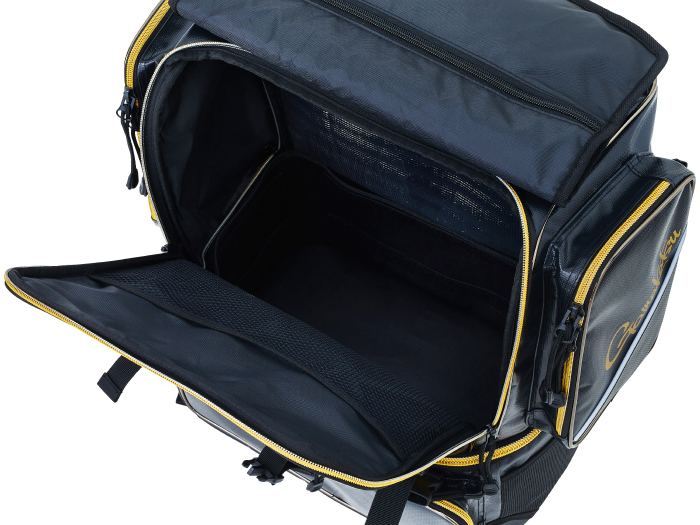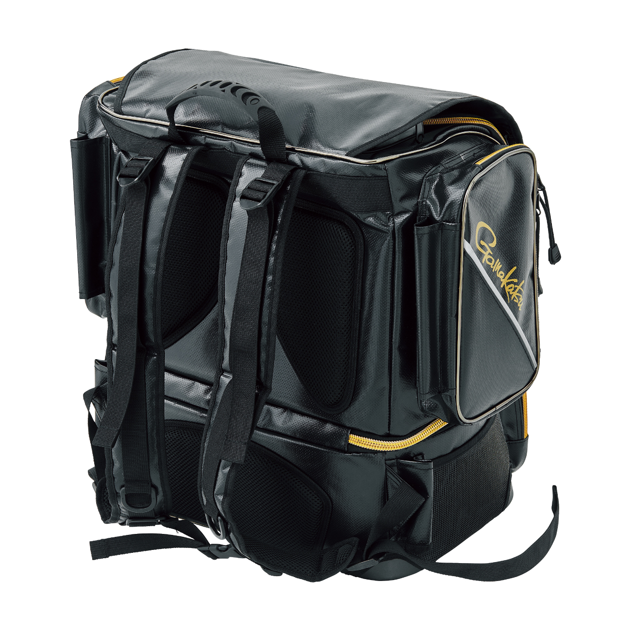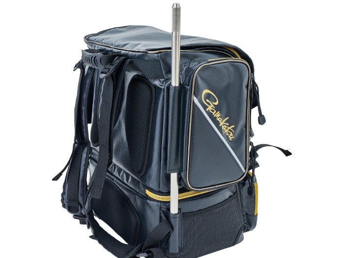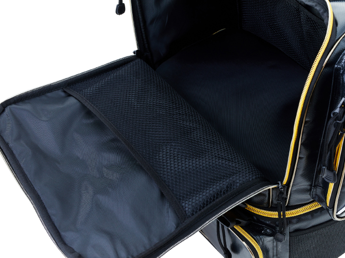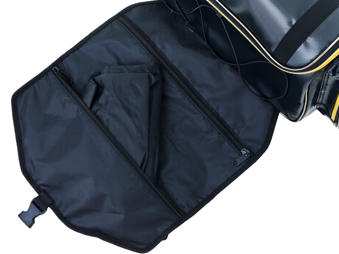 なにかと荷物がかさばる底物釣りに便利な、雨やシブキがしみこまないP.V.C素材のデイバッグ。内部は通常は2室構造ですが、ファスナーにより1室に変更が可能。本体サイドなどには、ポケットとピトンホルダー、ゴミも入れられる樹脂製ポケットを、底部にはアルミ蒸着の内生地で外部からの熱を遮断できる食物や飲み物に最適なスペースを設置。また、中蓋には衣類を固定できるバンジーコード、内部には、小分けや収納品の判別に便利なメッシュポケット設置するなど、小物の種類が多い底物釣りにベストマッチです。