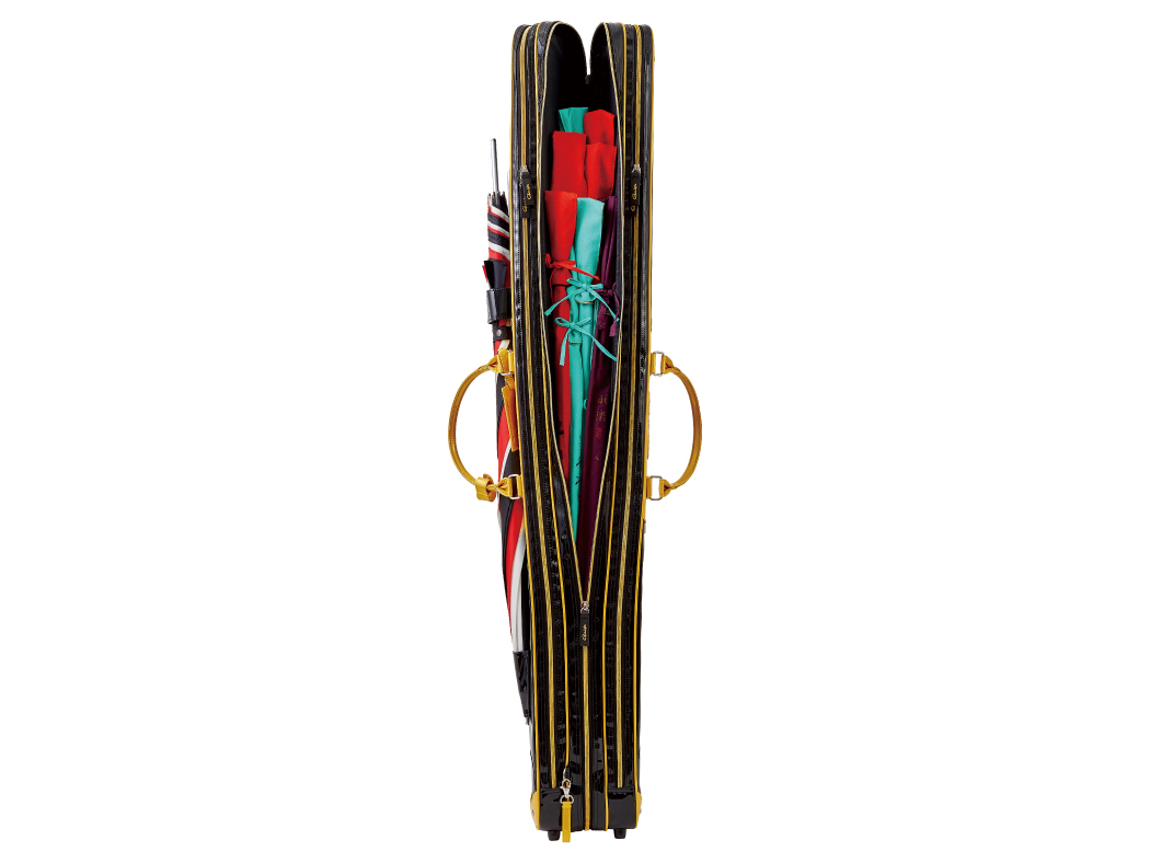 ●ハンドル部分は、握りやすい細身設計でまとめやすいホック式で、本体との隙間に大型パラソルをケースごと保持して持ち運べる仕様。
