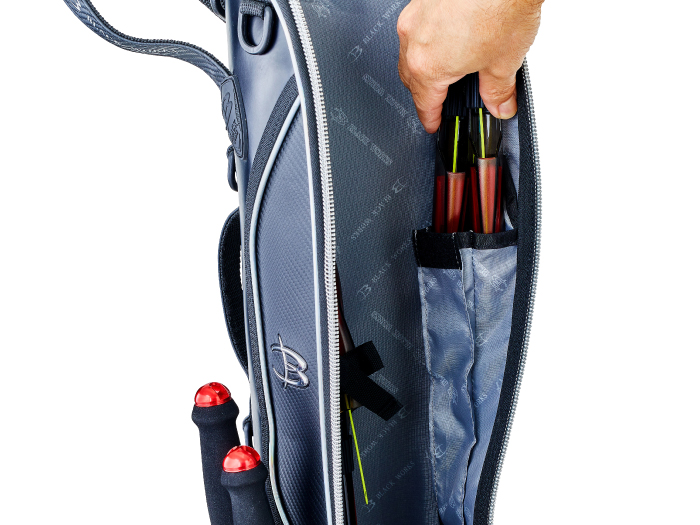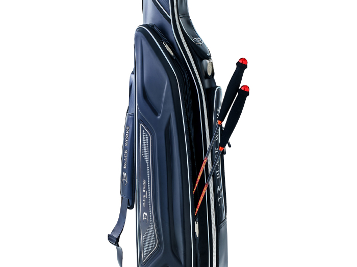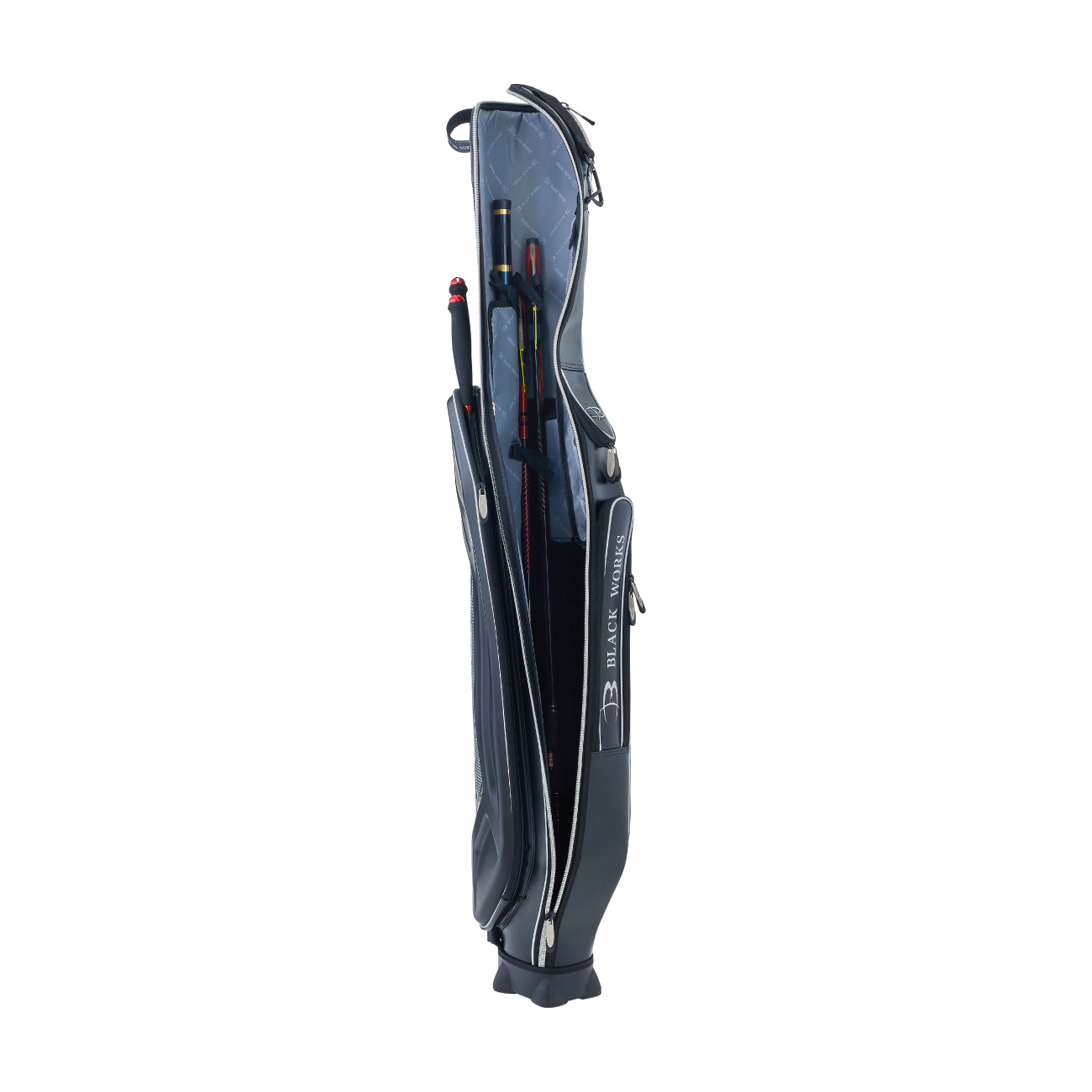 マットブラックのボディーを銀のモールで覆い、さらに、きらりと光る「B」のロゴマークが鮮烈な印象を残すブラックワークスブランド初のロッドケース。チヌ特有の棒ウキが入るロングポケットや、保冷機能を持つペットボトル用ポケット、遠投用のロングサイズ撒き餌杓が入るサイドポケット、内部には面ファスナーで脱着できるポーチなど、チヌ師にはうれしい収納アイテムを多数配置しました。本体側面はセミハードボディー設計で、大切な釣り具を衝撃から守ります。