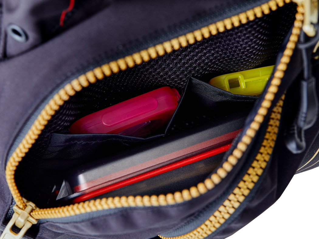 ●胸や腰ポケットを同仕様にし 、製品本体・ 縦横方向の安定性が向上。腰ポケット内部に小物が入る小分けポケットを装備。